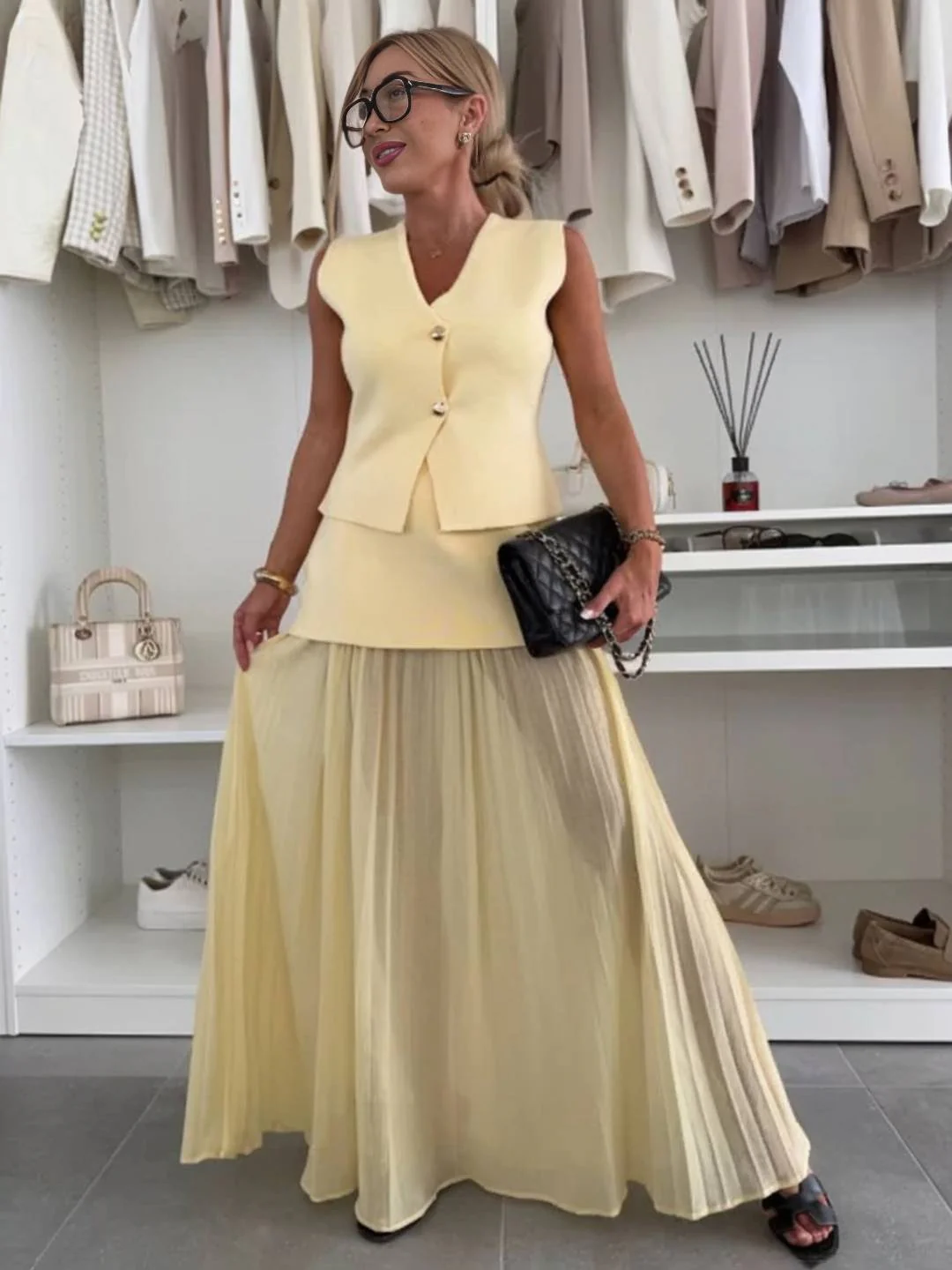 tenu ensembles tailleur v-cou sans manches gilet et jupe tulle fluide décontracté chic pour vacances deux pièces | KONF