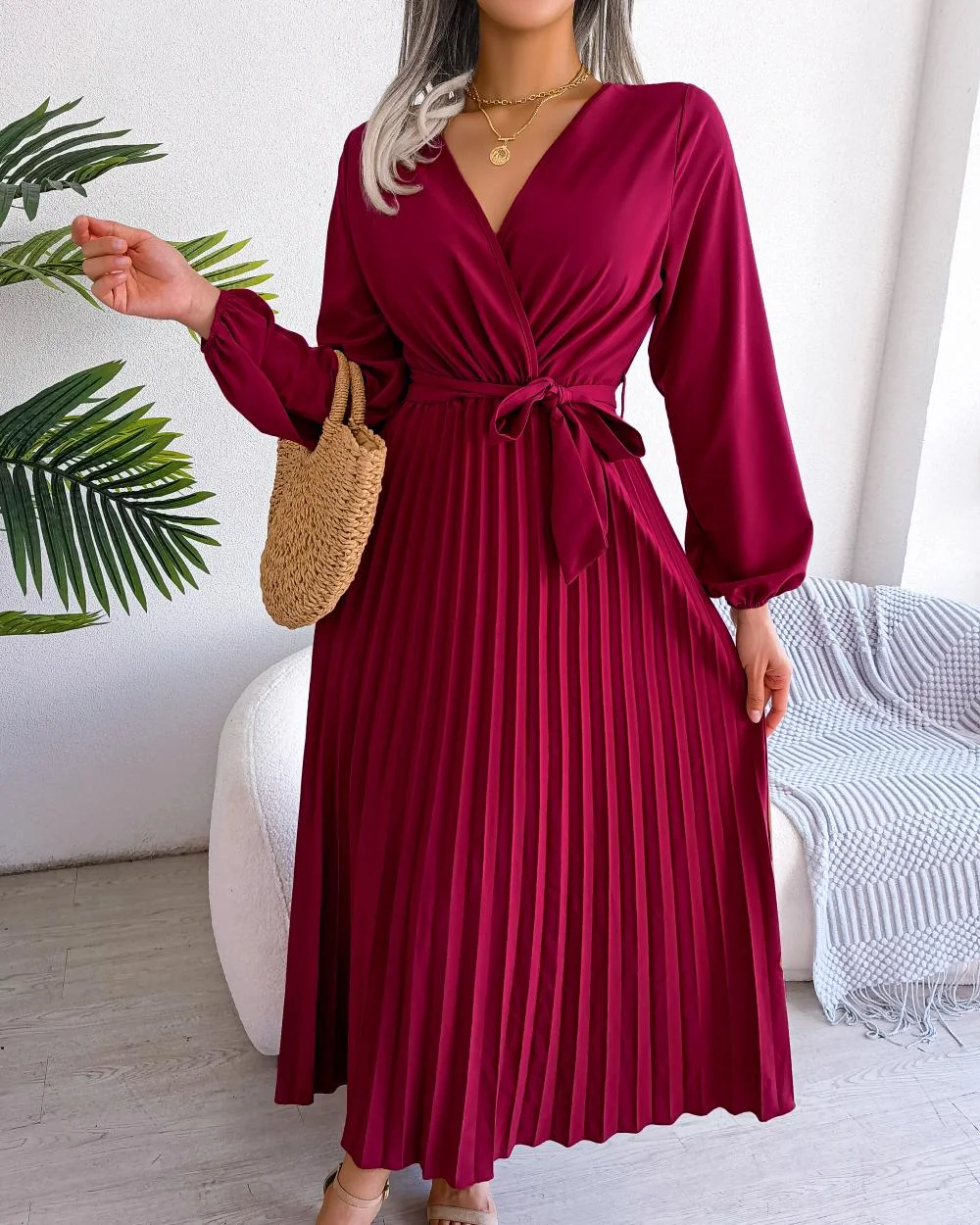 Robe maxi plissée à manches longues et col en V pour femmes