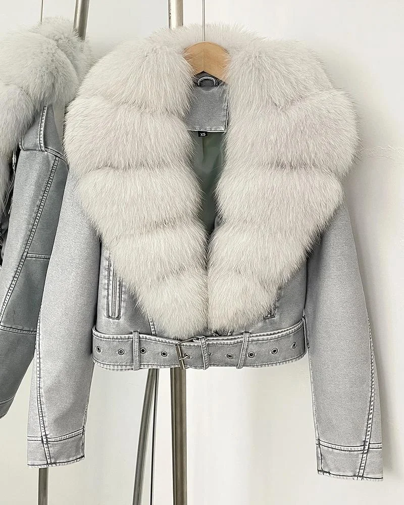 Veste femme en faux cuir avec véritable fourrure de renard – Manteau court automne-printemps à manches longues, style chic et mince
