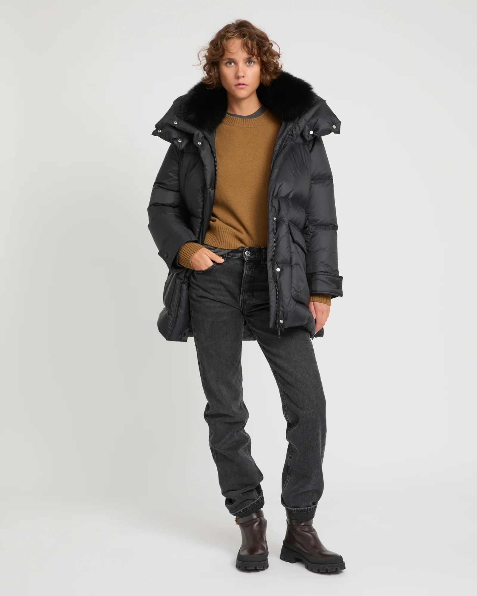 3/4 down jacket in water-repellent technical fabric with fox fur collar trim