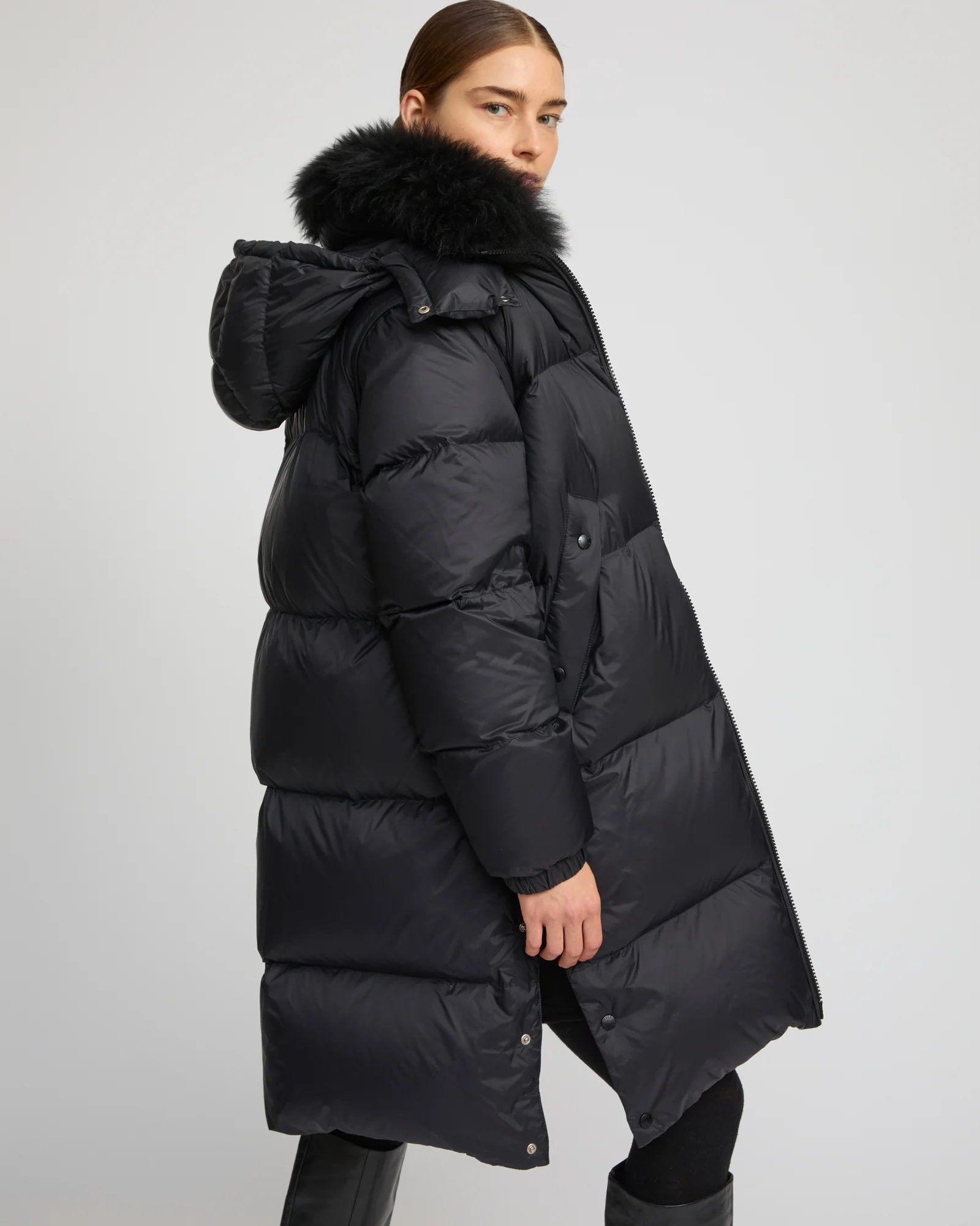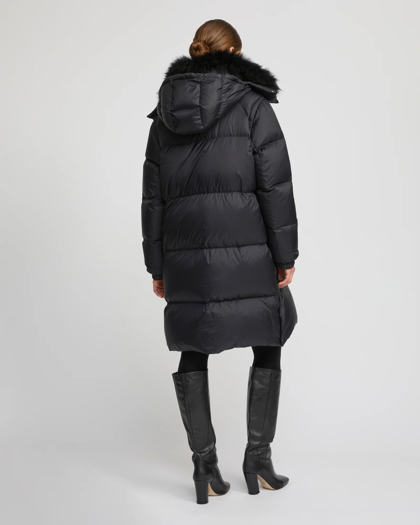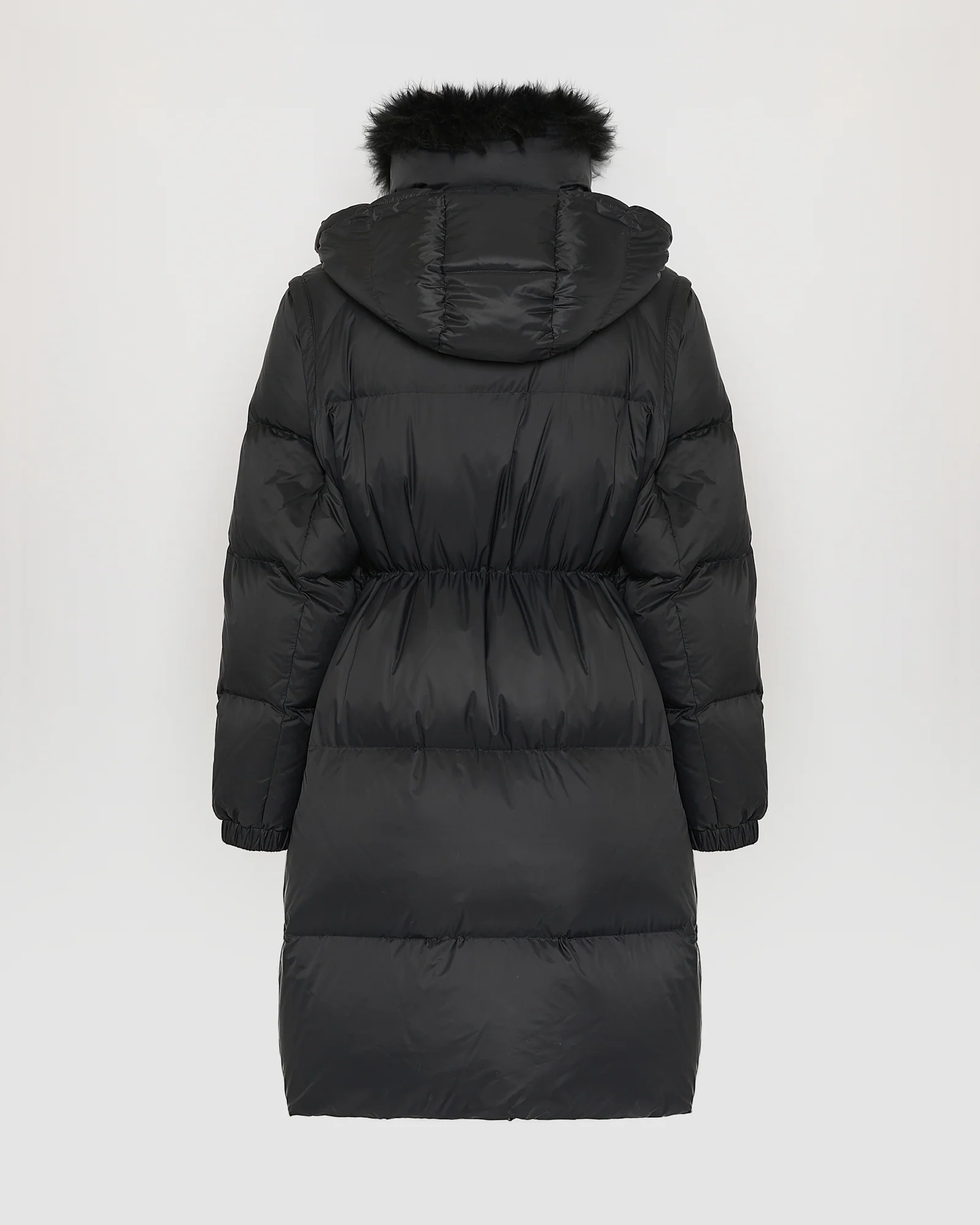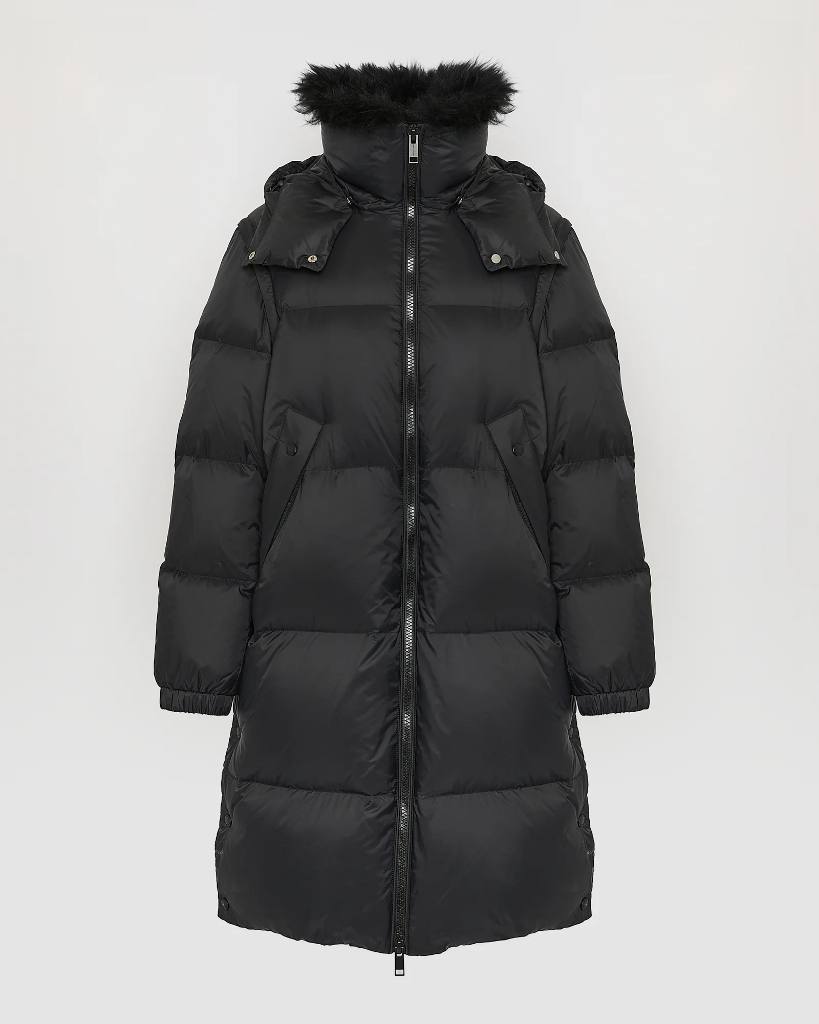 A long and warm down jacket that remains lightweight and pleasant to wear. Crafted from water-repellent technical fabric, this model is padded with high-quality down and duck feathers to guarantee warmth and breathability. Design details include a front zip fastening, two large welt pockets, elasticated cuffs, as well as press-stud side slits and a drawstring waist to play with the shape. Featuring a detachable hood and a removable collar trim in long-haired lambskin with a cashmere touch, this versatile down jacket combines comfort with elegance. The sleeves can also be detached to match different styles and seasons.