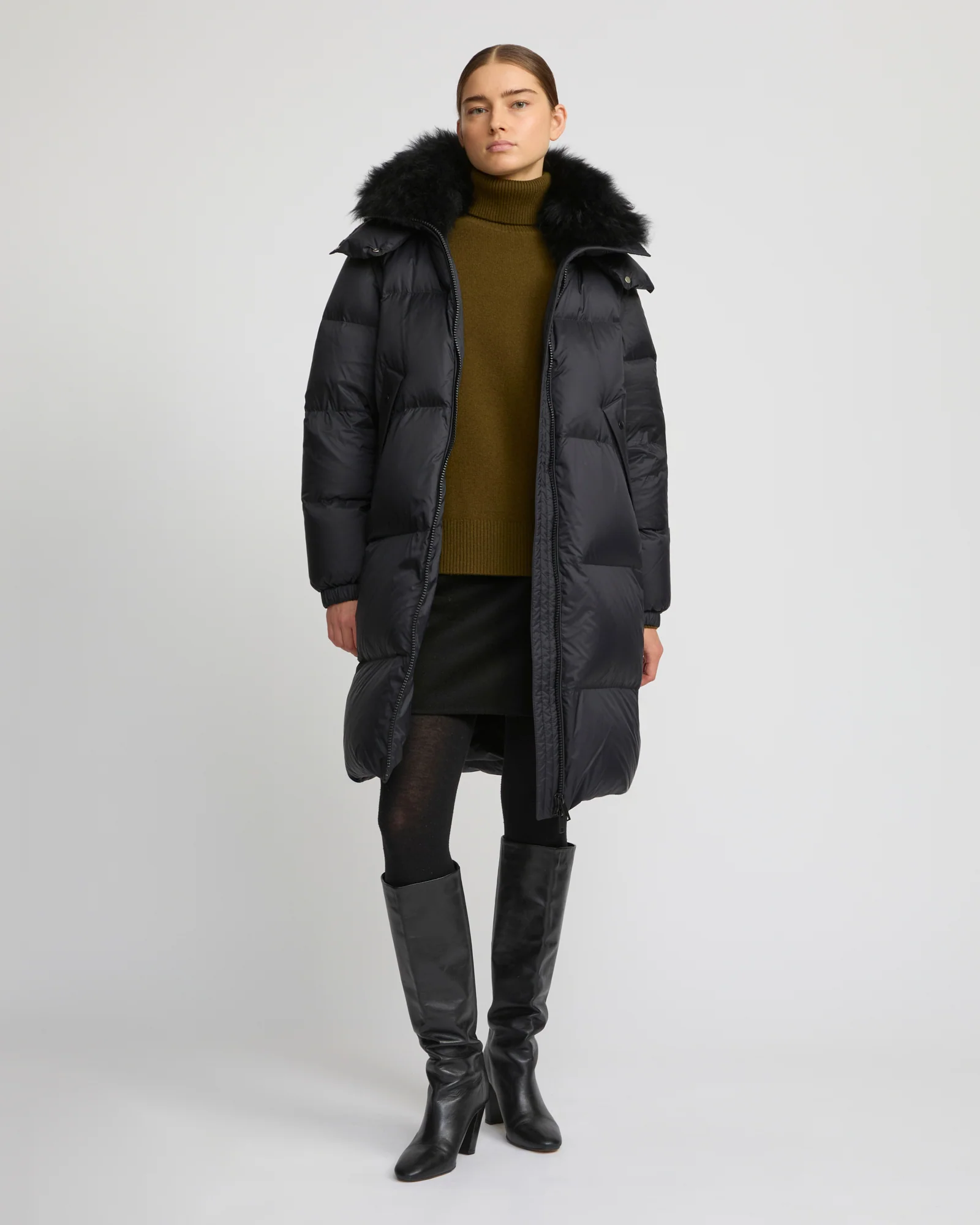 7/8 Long down jacket in water-repellent technical fabric with collar trim in fluffy lambswool