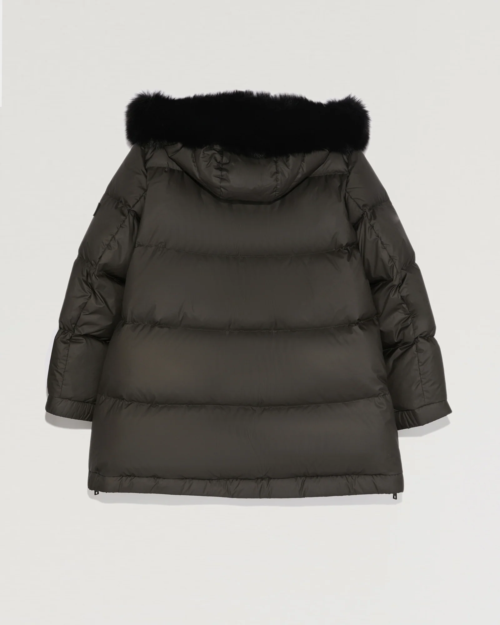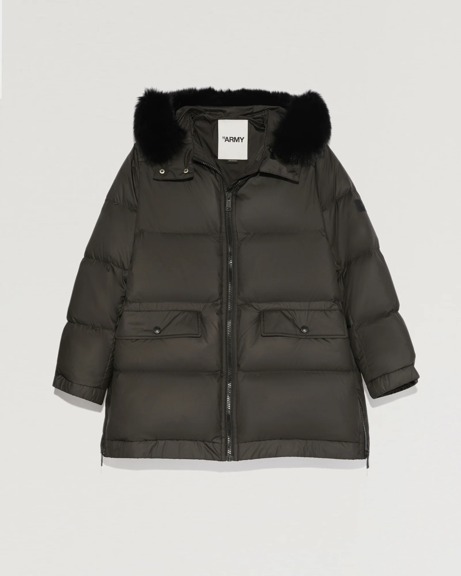 “A” line down jacket with fox fur hood – « A » shape down jacket with an oversize bottom– Down jacket in technical fabric– Length 76 cm– Non-removable hood– Removable fox fur hood edge– Front zip closure– Model with zipped side slits– Snapped flap pockets– Invisible technical ribbing at the bottom of the sleeves– YS Army Collection