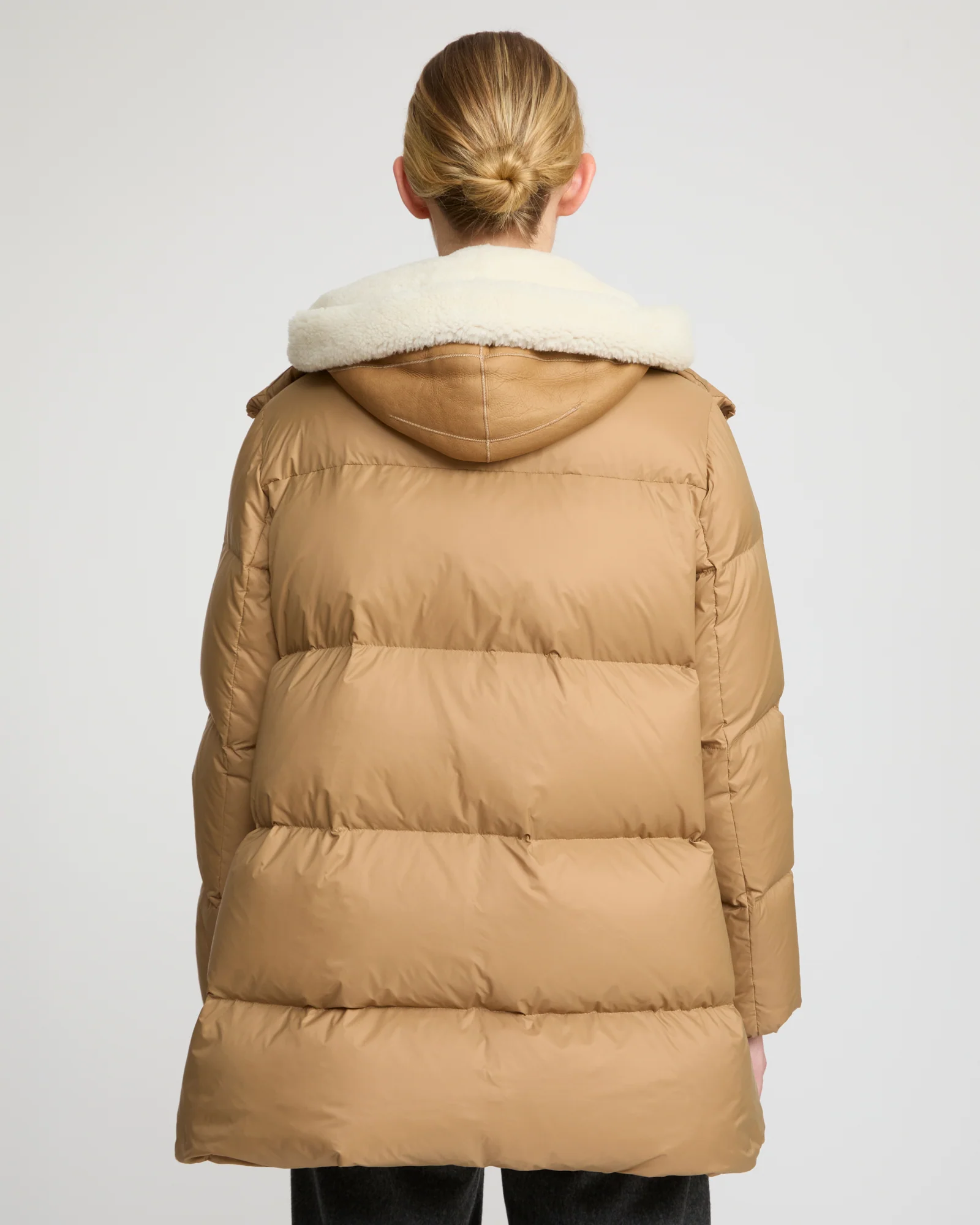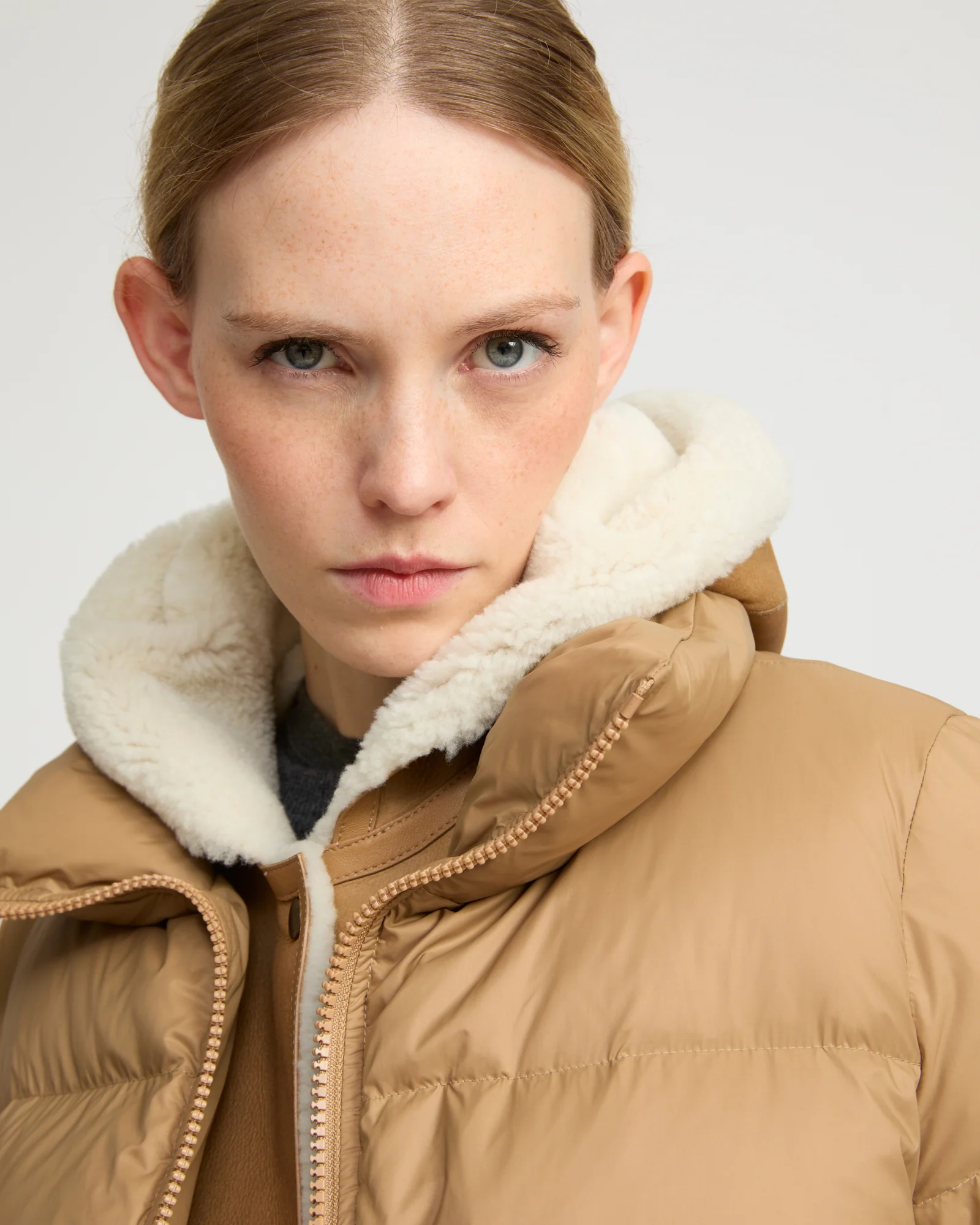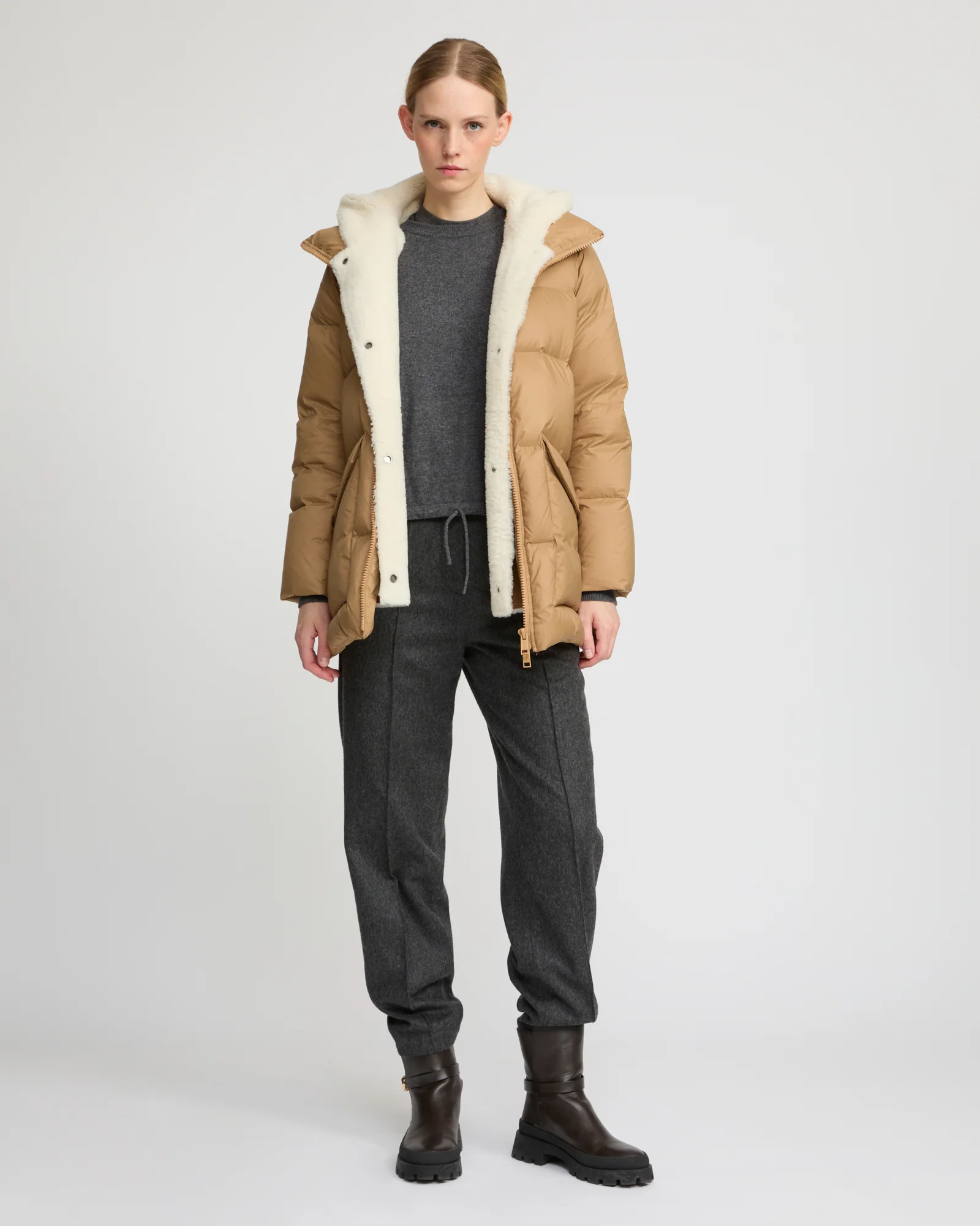 7/8 Long down jacket in water-repellent technical fabric with collar trim in fluffy lambswool