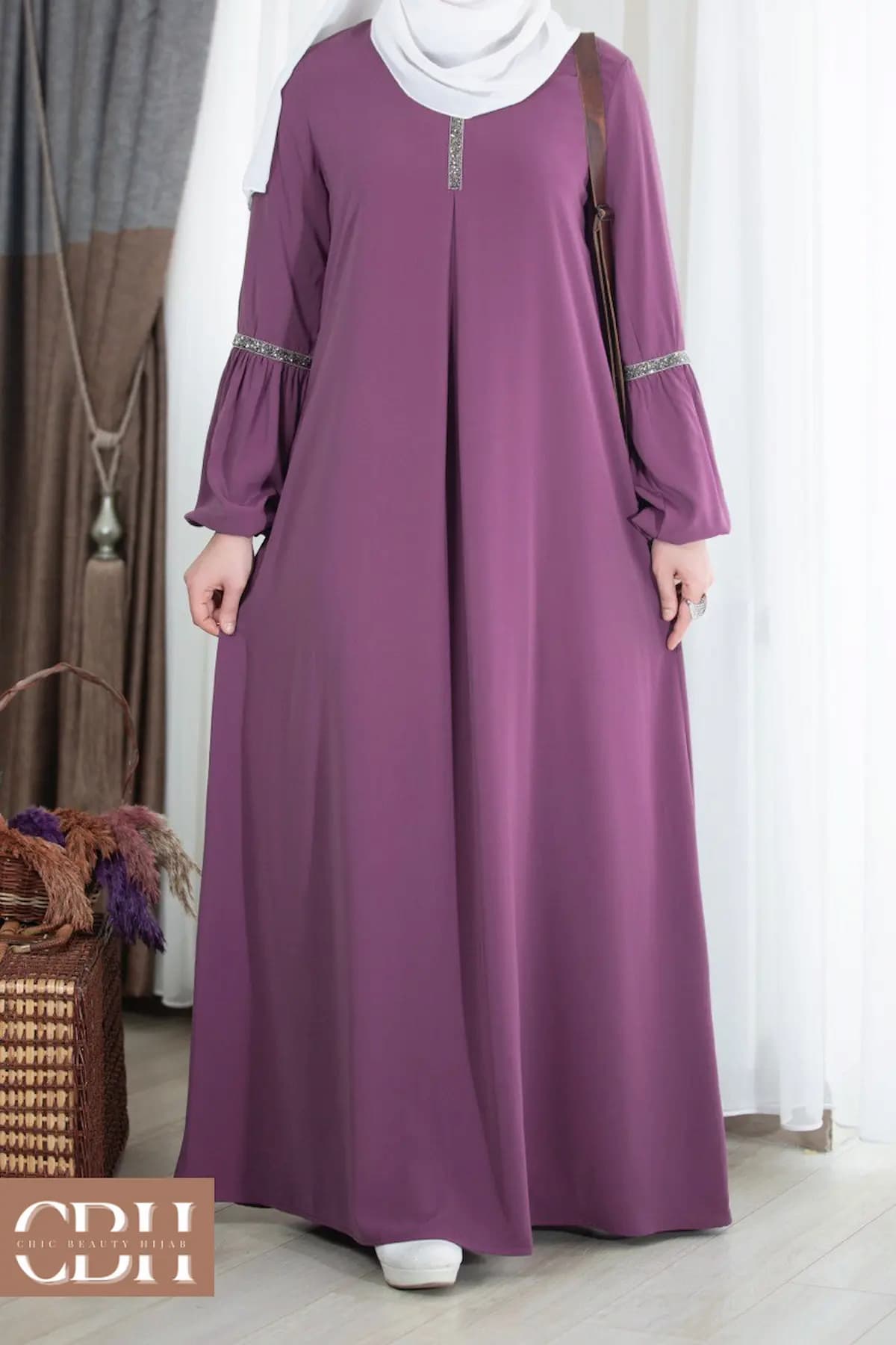 Dédiée pour les femmes à la recherche d’un style modeste, chic et sophistiqué, cette abaya se distingue par ses détails brillants présents au niveau du col et des manches, ajoutant une touche lumineuse sans être excessive.