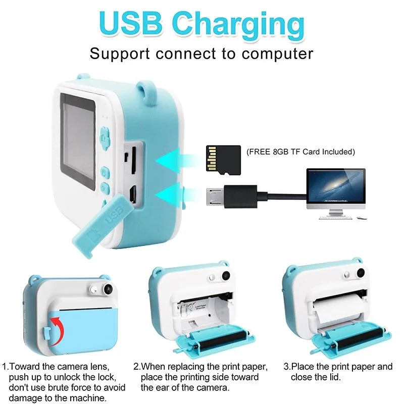 Enfants imprimante caméra enfants caméra impression instantanée caméra pour enfants 1080P HD vidéo Photo caméra jouets avec carte 8GB