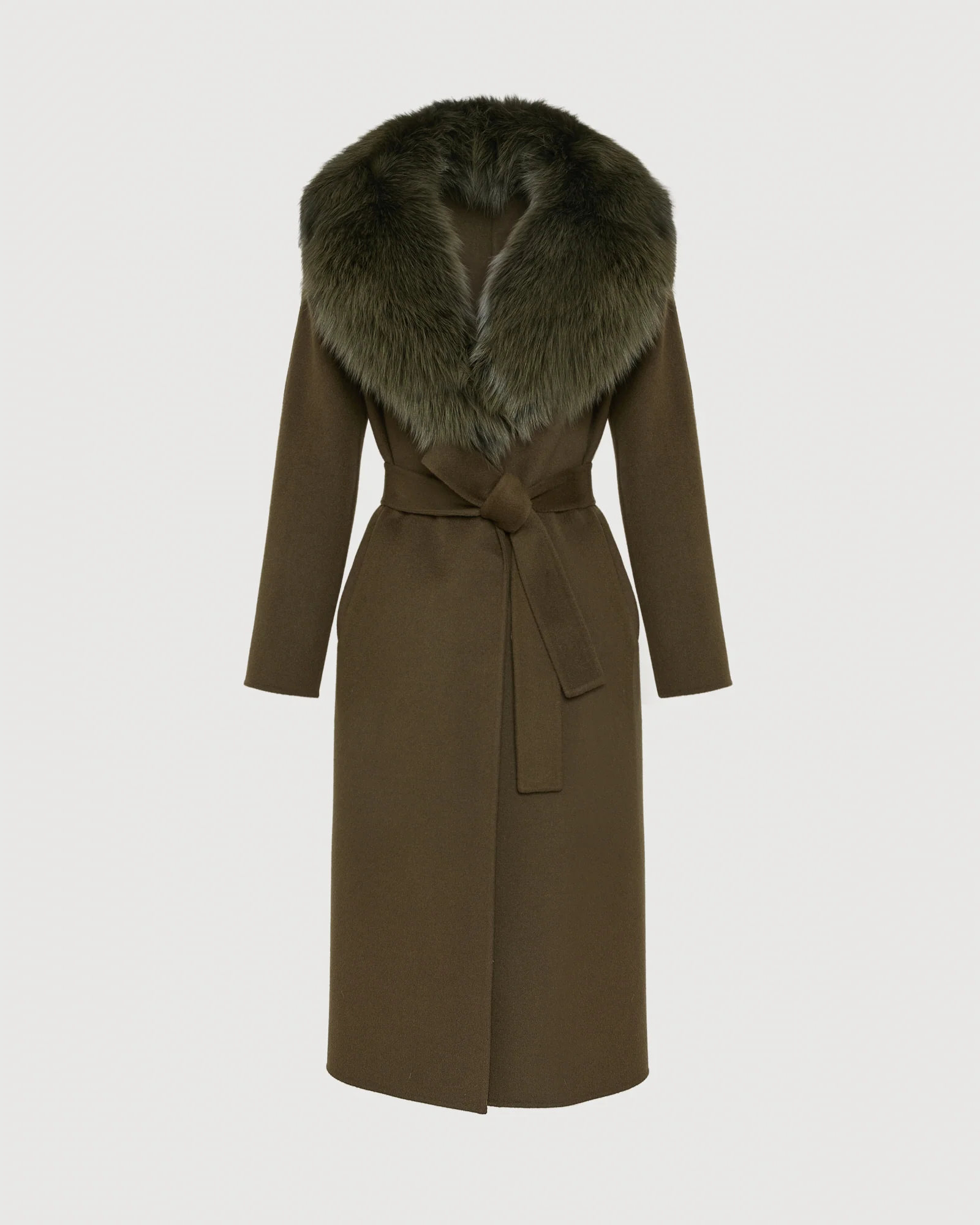 Belted coat in cashmere wool with fox fur collar and lapel