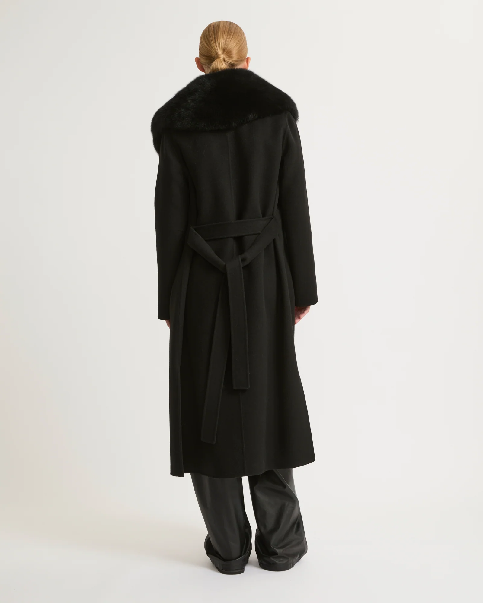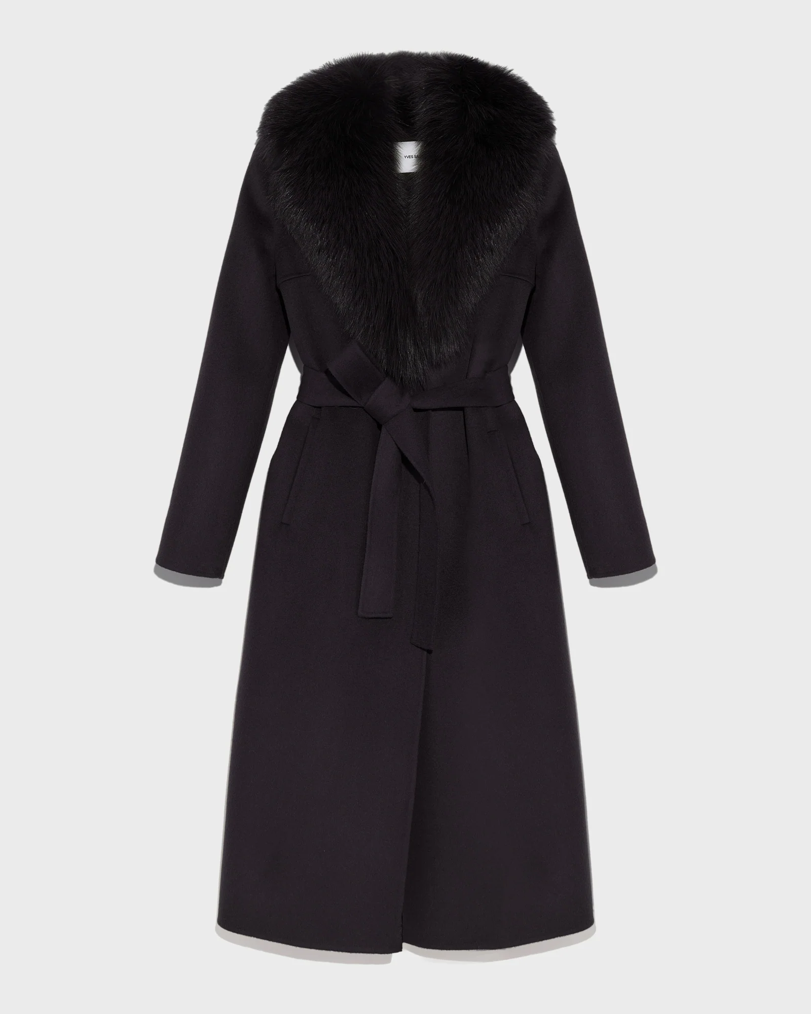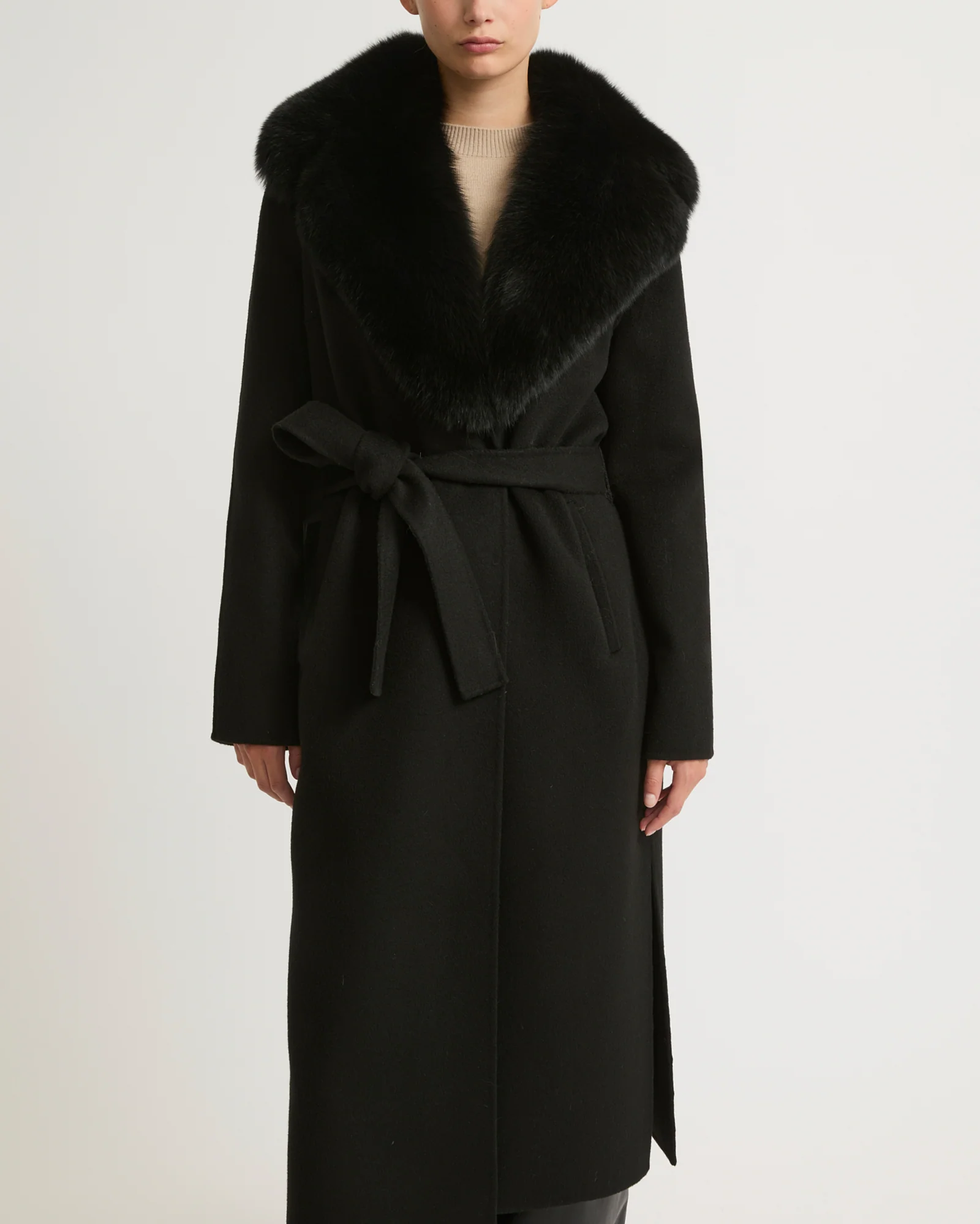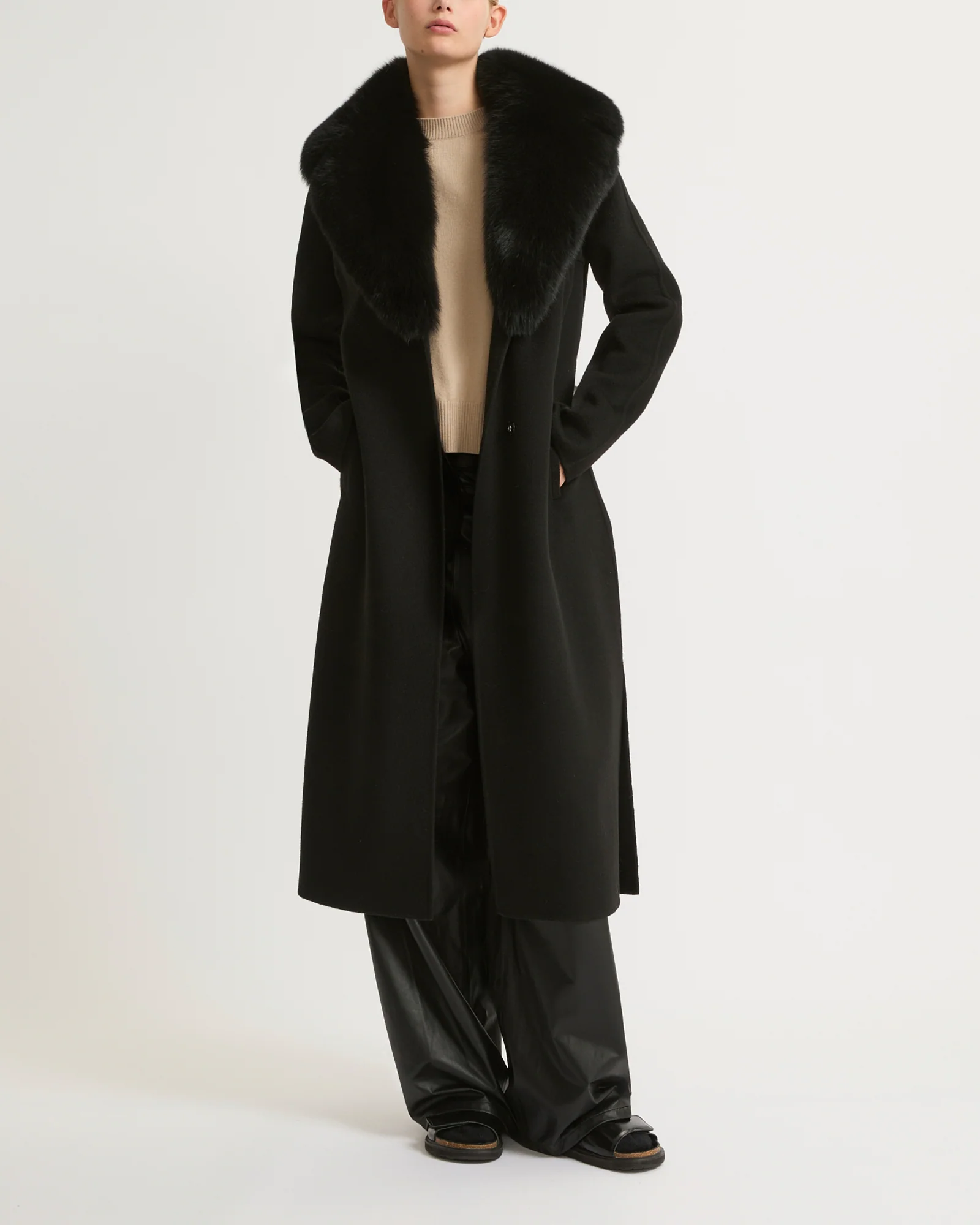Made from unlined double-sided cashmere wool, this side-slit coat is enveloping yet lightweight and comfortable to wear. Featuring a tailored collar, two slit pockets and a single press-stud fastening, the masculine and pared back cut is adjustable thanks to the removable cashmere wool belt. For a versatile style and a touch of femininity, this model has a detachable fox fur collar and lapel. An elegant detail that makes all the difference and fastens perfectly to the coat using a concealed button system.