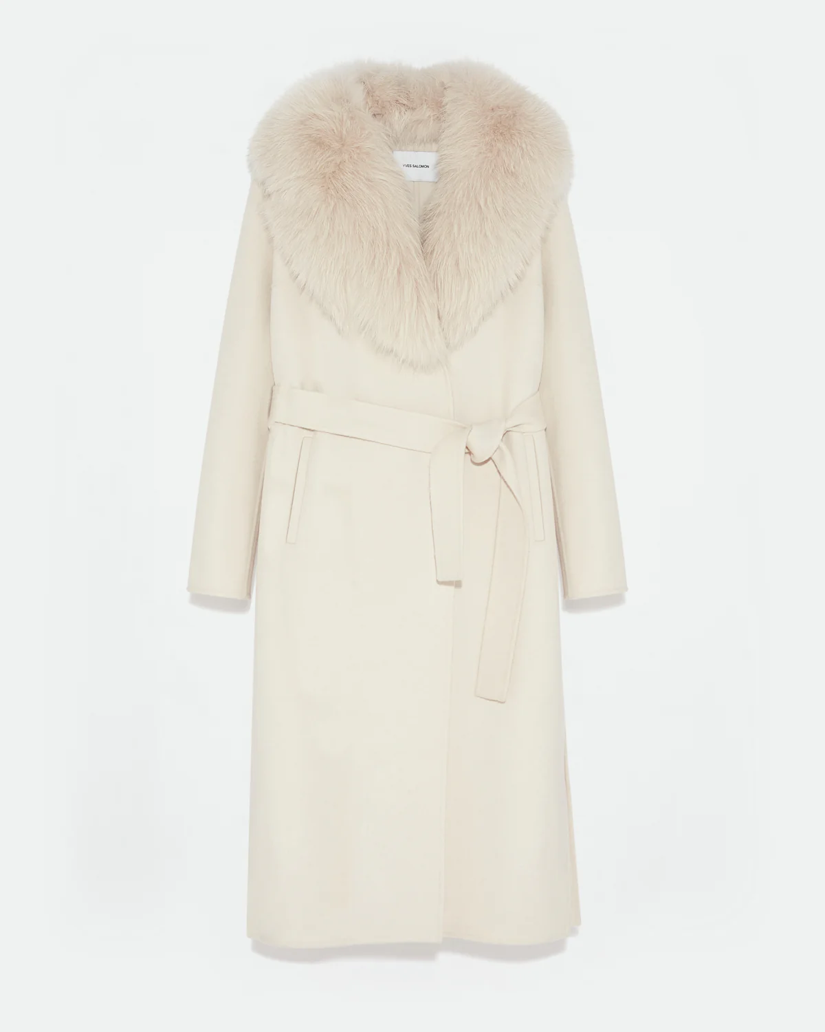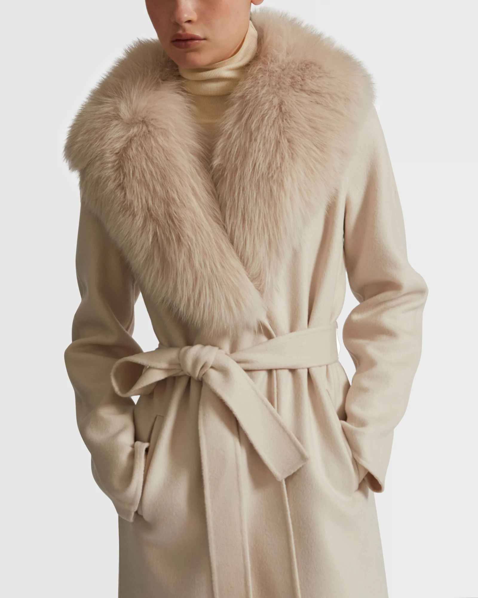 Made from unlined double-sided cashmere wool, this side-slit coat is enveloping yet lightweight and comfortable to wear. Featuring a tailored collar, two slit pockets and a single press-stud fastening, the masculine and pared back cut is adjustable thanks to the removable cashmere wool belt. For a versatile style and a touch of femininity, this model has a detachable fox fur collar and lapel. An elegant detail that makes all the difference and fastens perfectly to the coat using a concealed button system.
