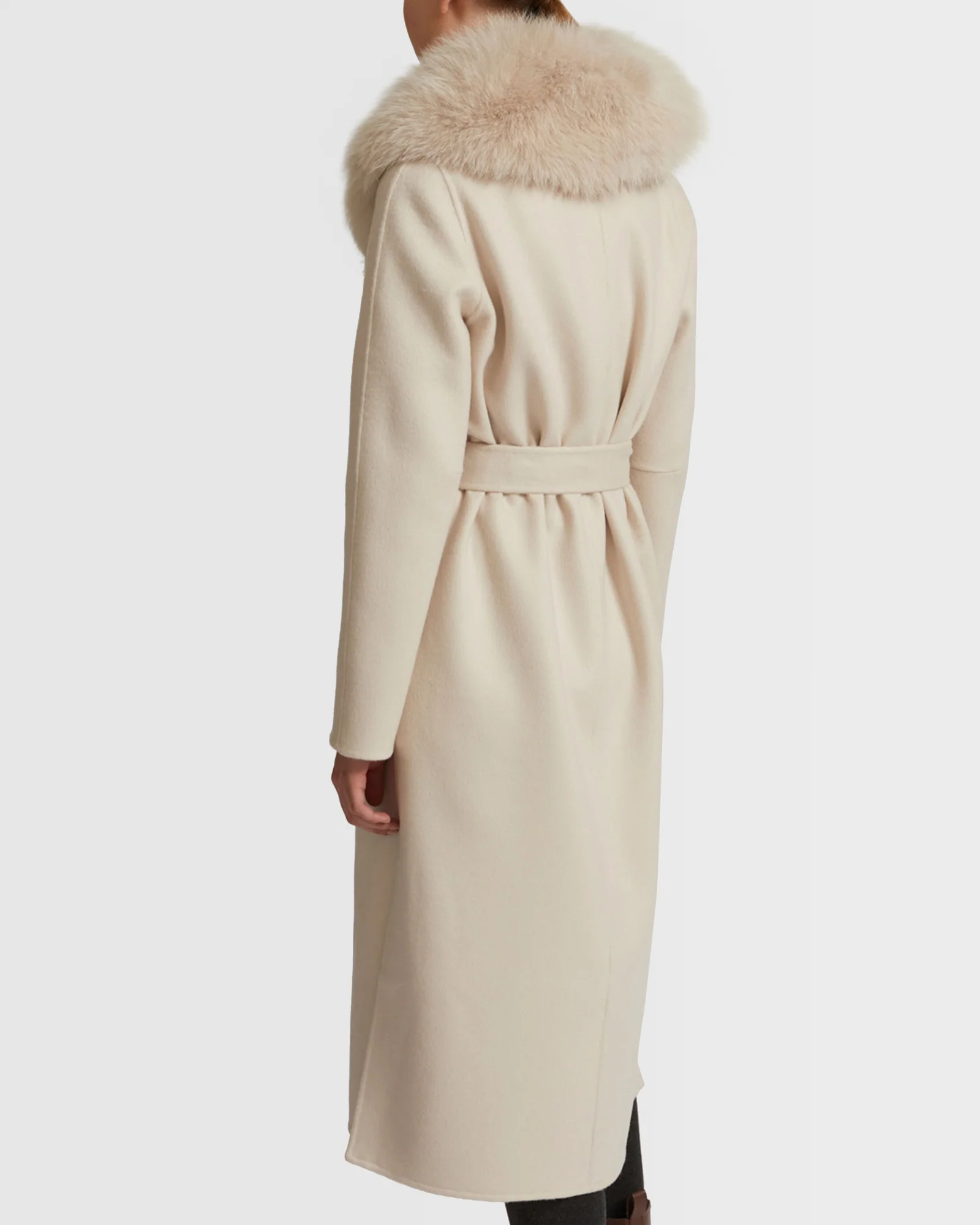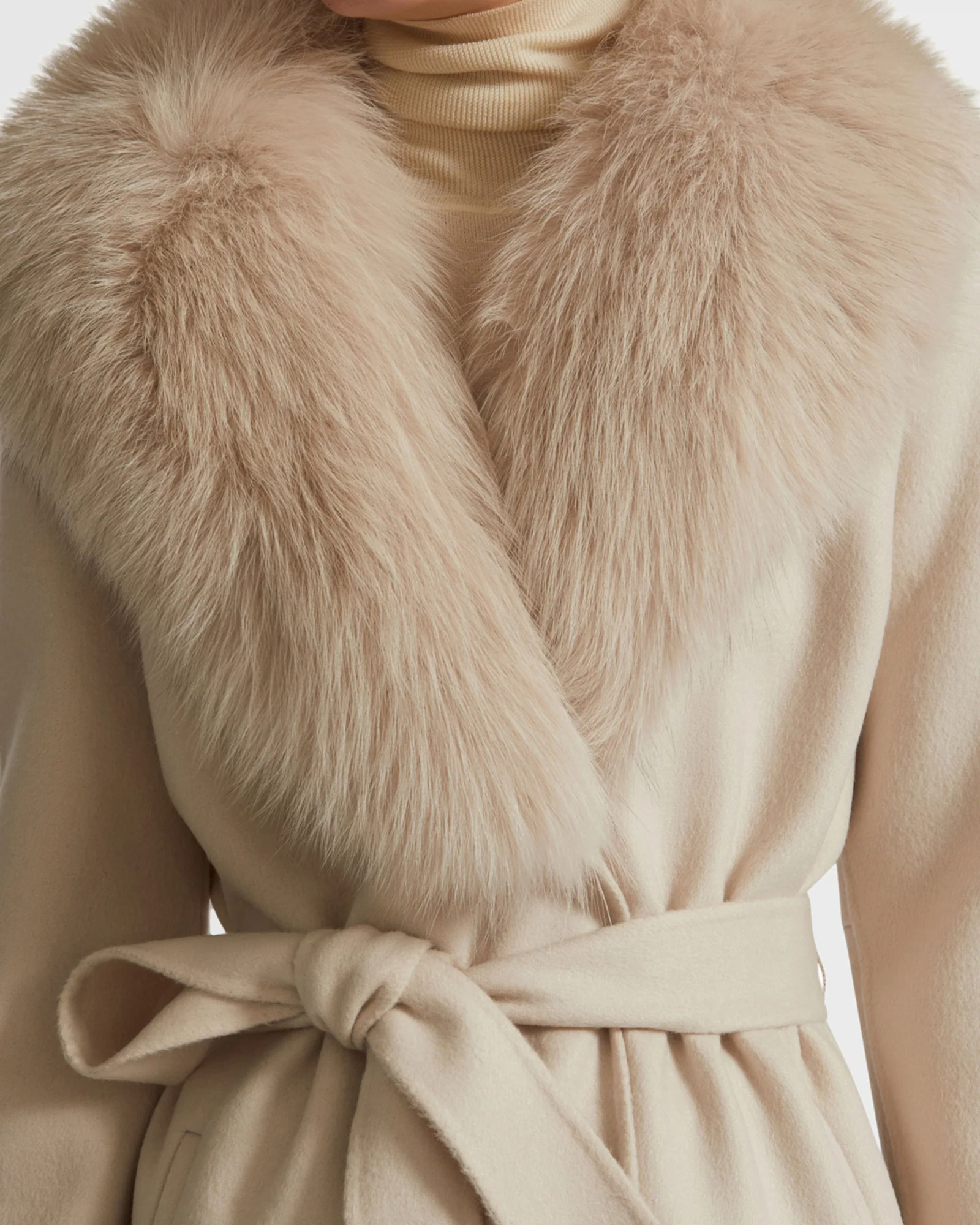Belted coat in cashmere wool with fox fur collar and lapel