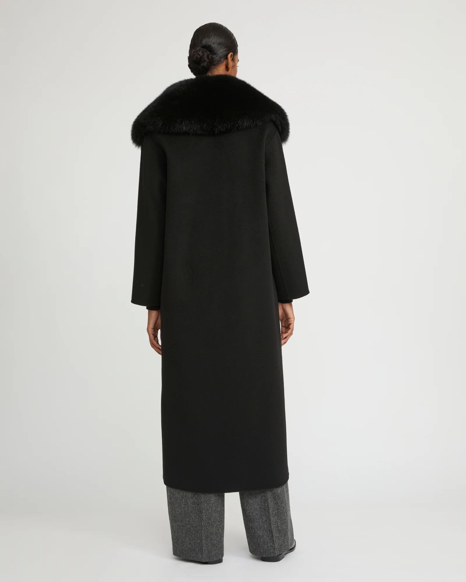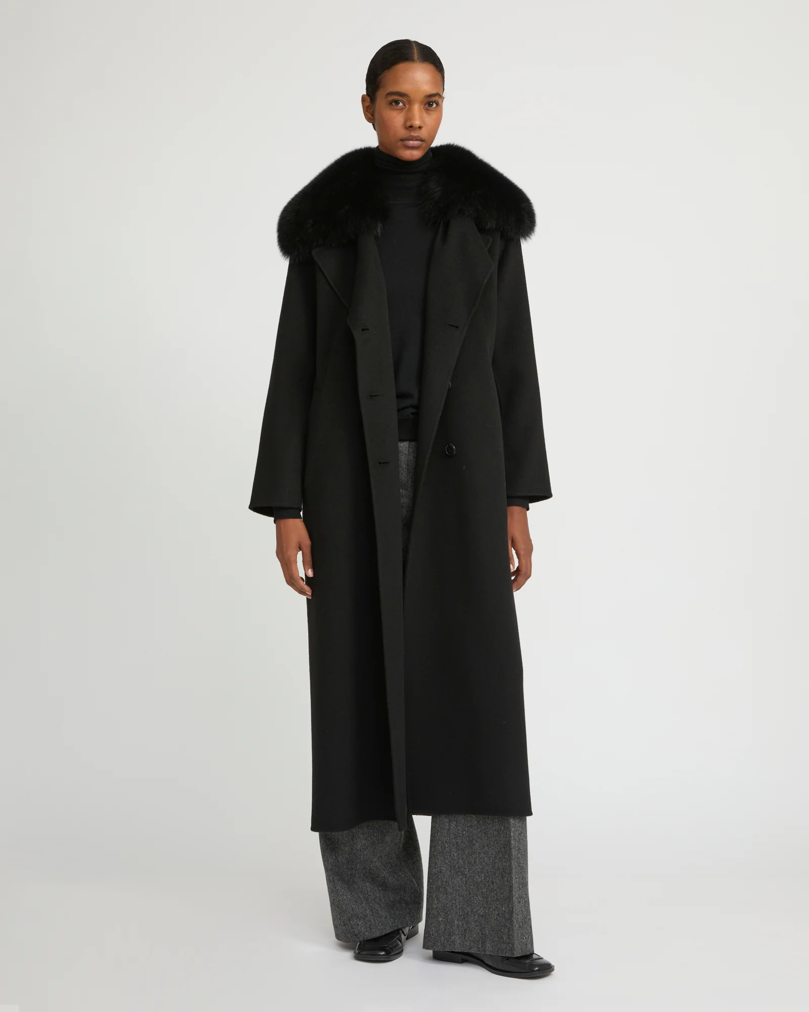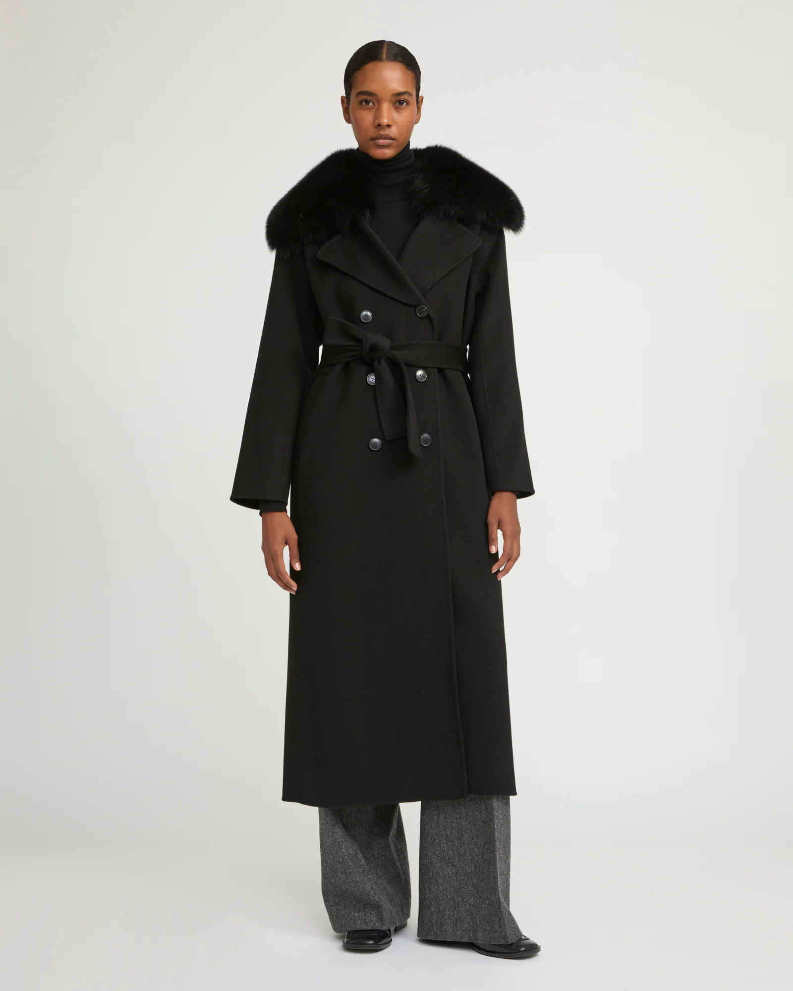 Made from unlined double-sided cashmere wool, this side-slit coat is enveloping yet lightweight and comfortable to wear. Featuring a tailored collar, two slit pockets and a single press-stud fastening, the masculine and pared back cut is adjustable thanks to the removable cashmere wool belt. For a versatile style and a touch of femininity, this model has a detachable fox fur collar and lapel. An elegant detail that makes all the difference and fastens perfectly to the coat using a concealed button system.