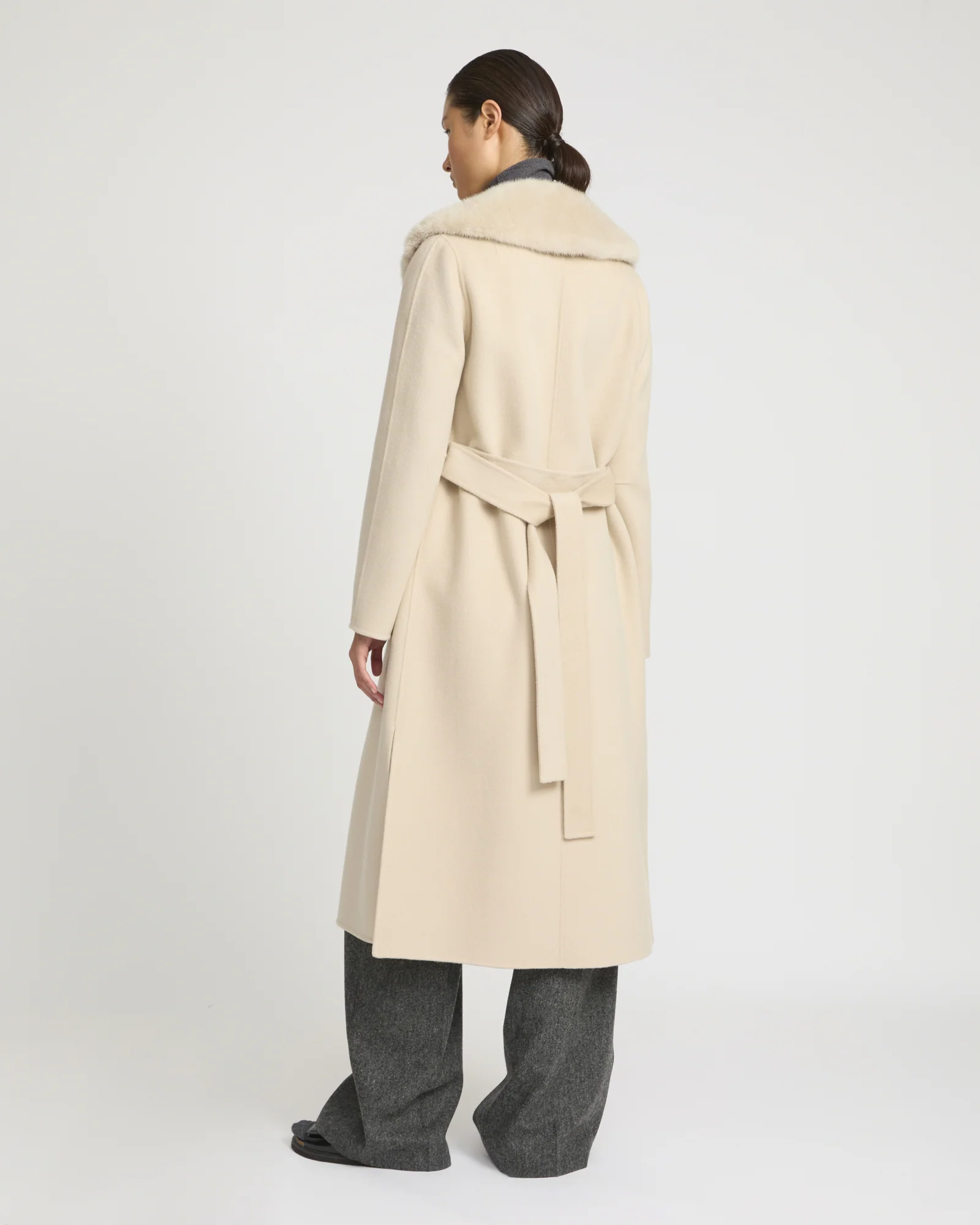Belted coat in cashmere wool with mink fur collar and over-pockets