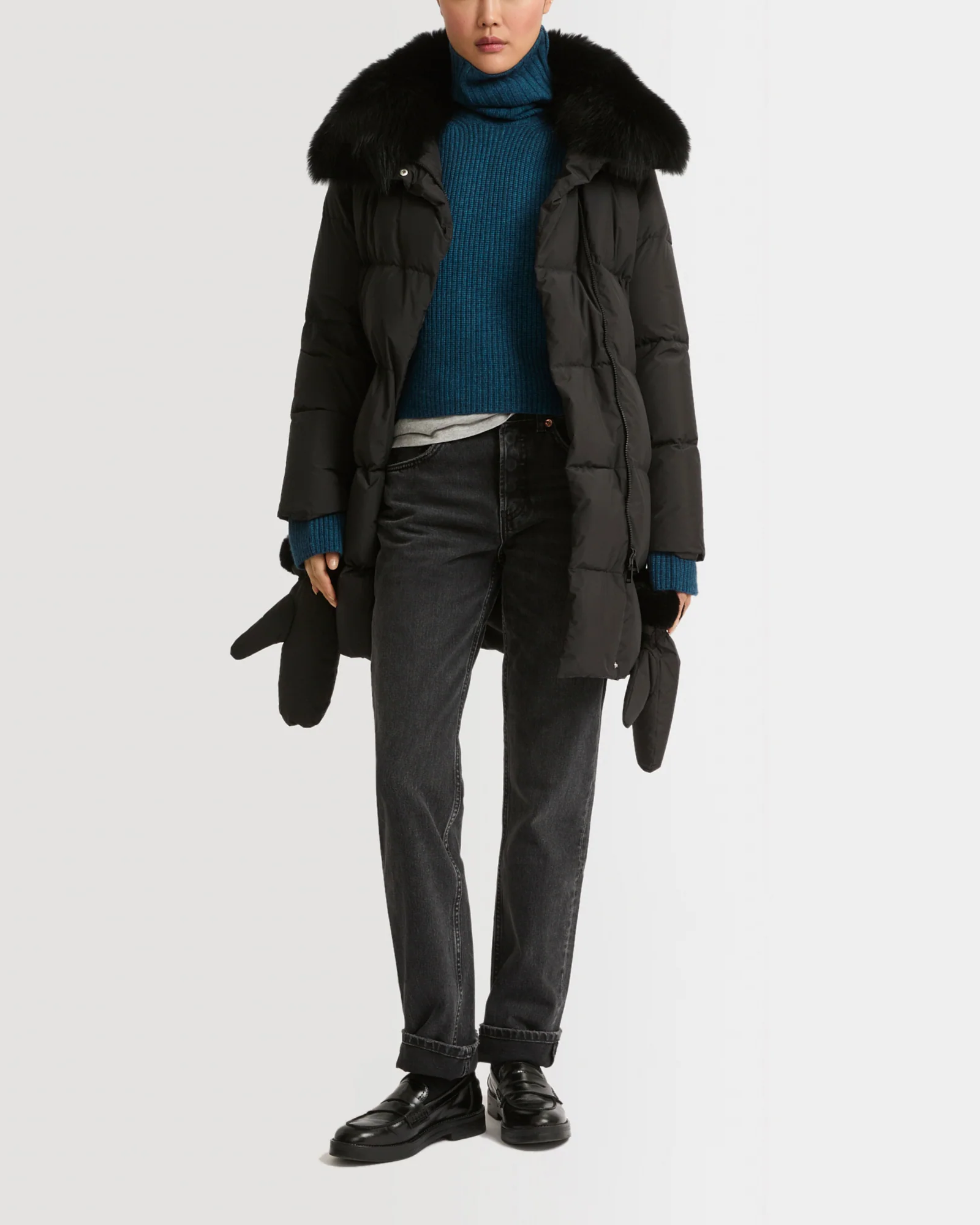 Crafted from a waterproof technical fabric, this enveloping yet lightweight down jacket is padded with high-quality down and duck feathers to guarantee comfort, warmth and breathability. Featuring a front zip fastening and two zip pockets, this model is also belted to highlight the waist and adjust the shape. The fox fur collar as well as the mittens trimmed with Rex rabbit fur add femininity and elegance. A versatile and timeless down jacket to match the season.