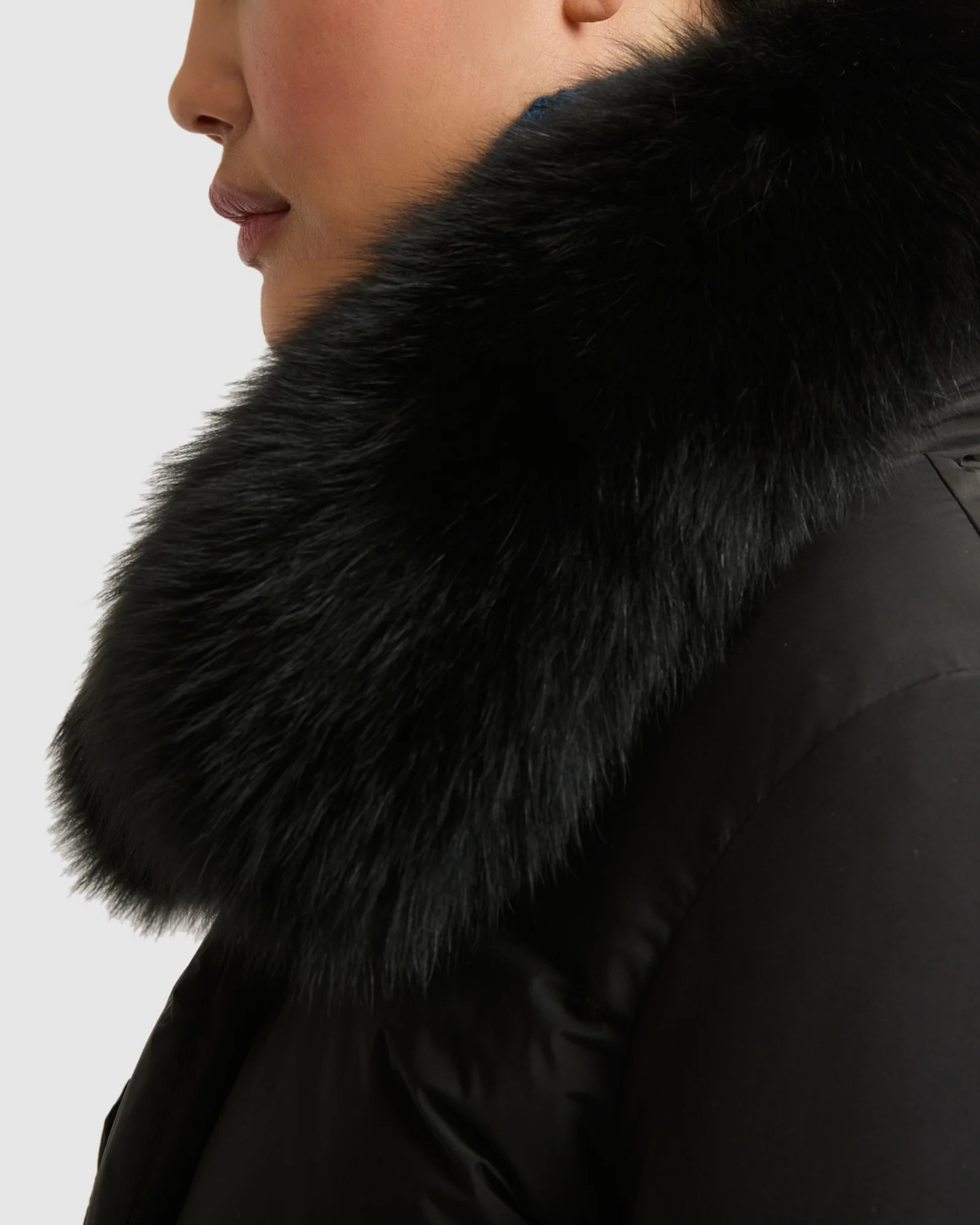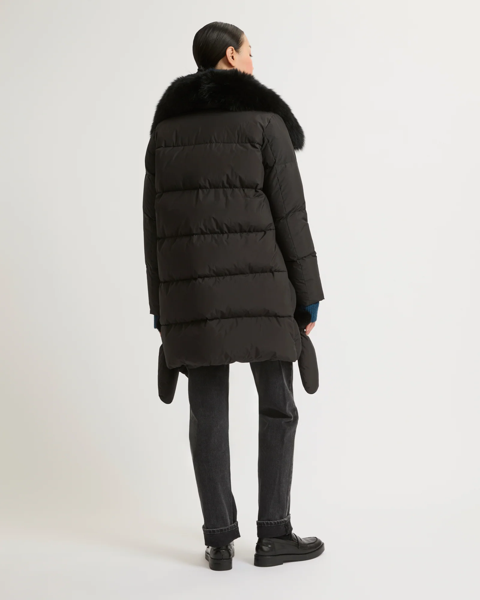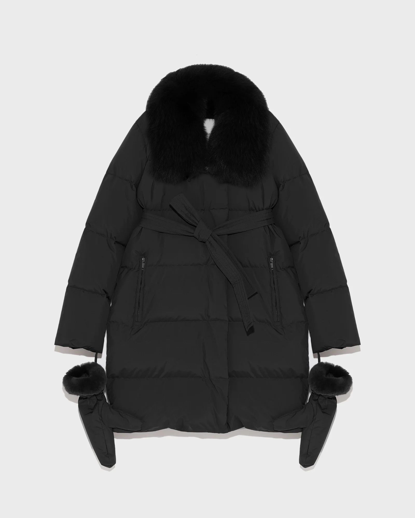 Belted down jacket in waterproof technical fabric with fox and rabbit fur