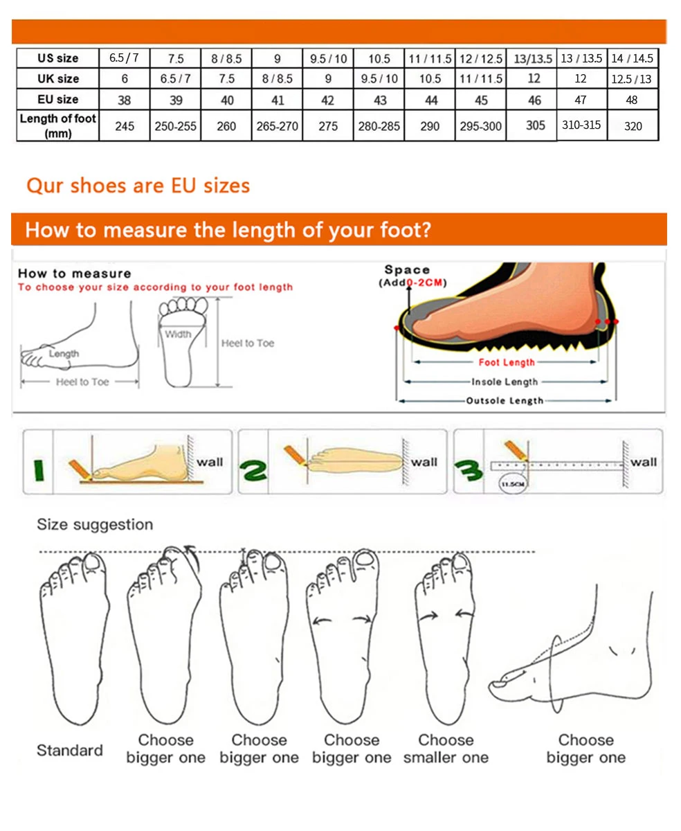 1. Veuillez choisir la bonne taille en fonction de notre tableau des tailles en fonction de la longueur du pied, ou contactez notre service client pour vous renseigner sur l’achat de la bonne taille.