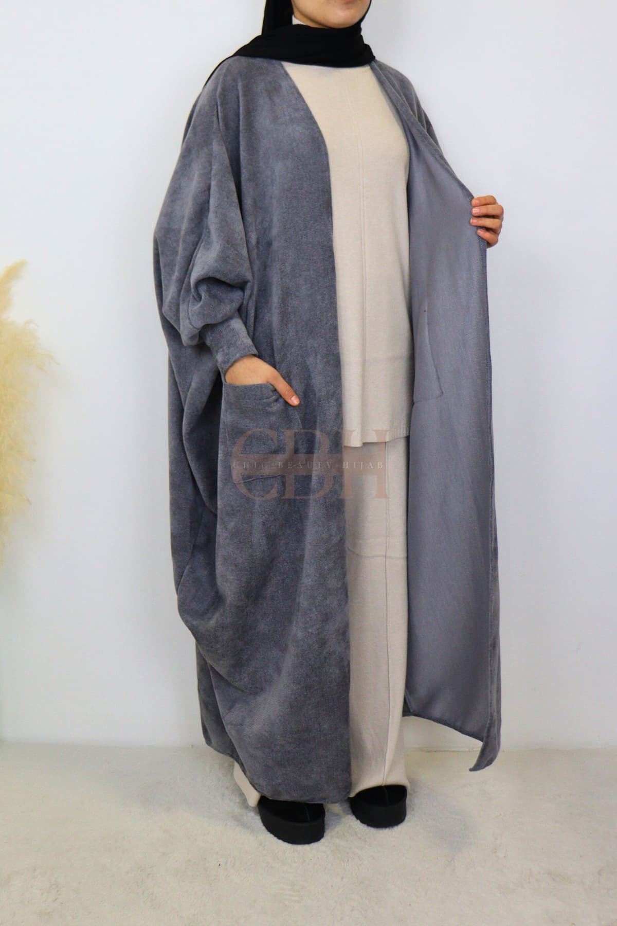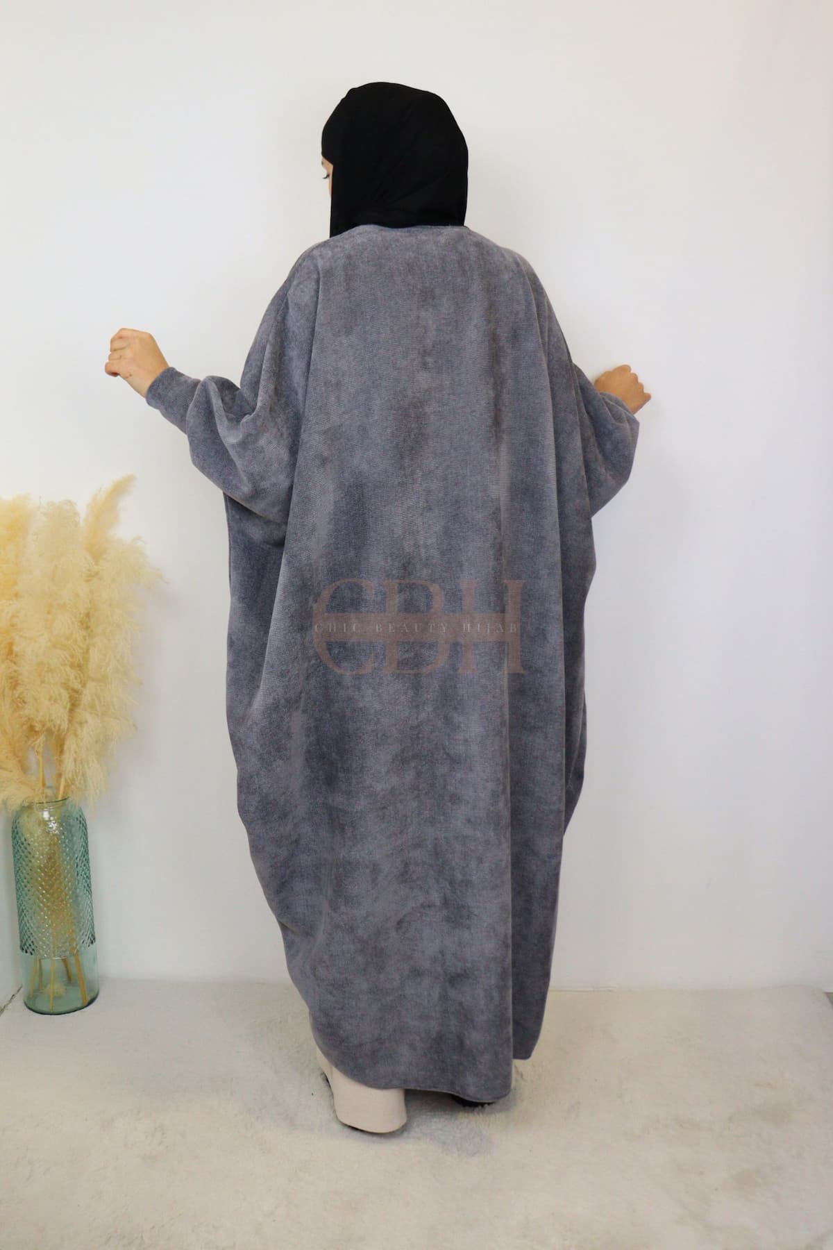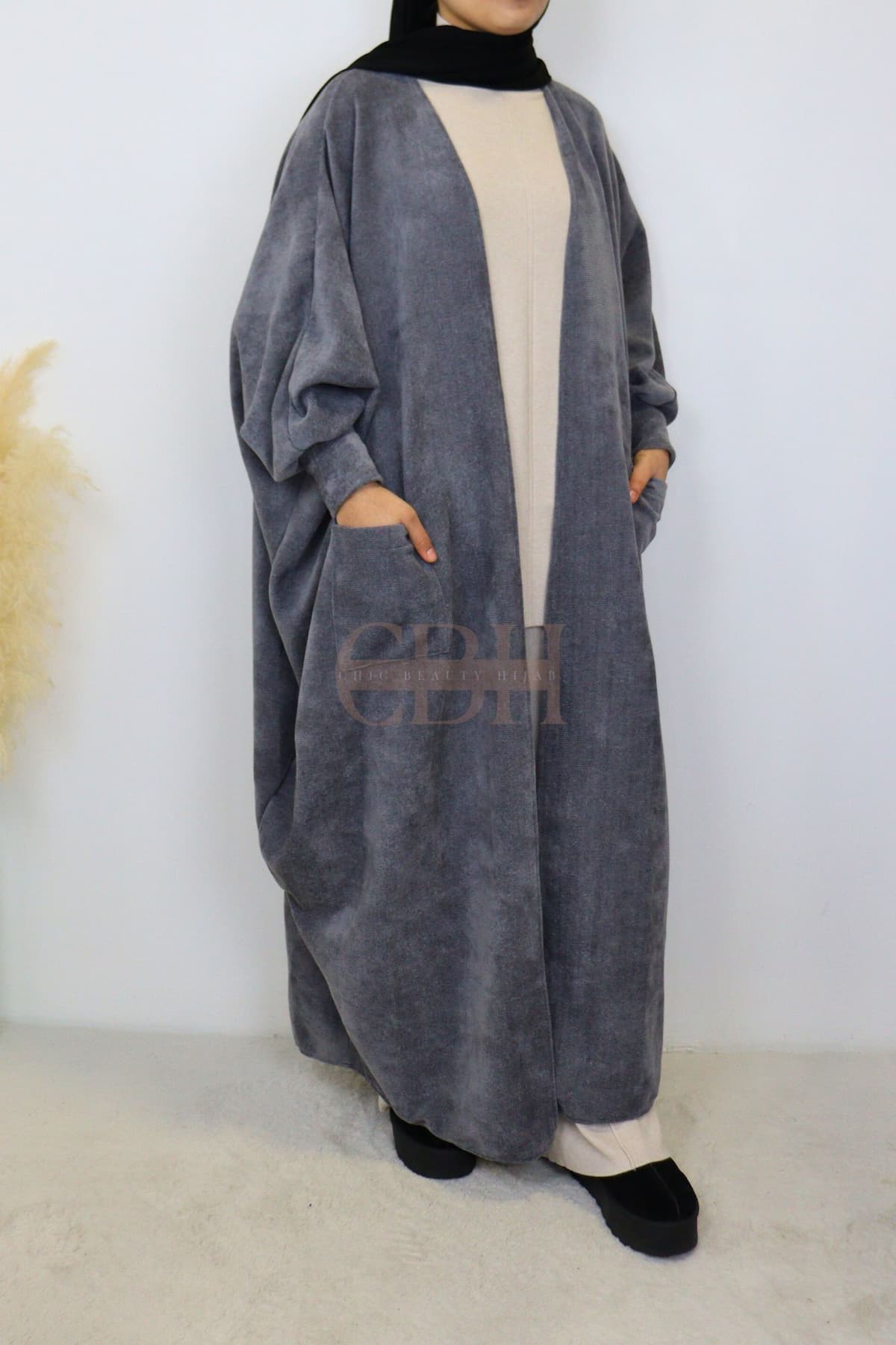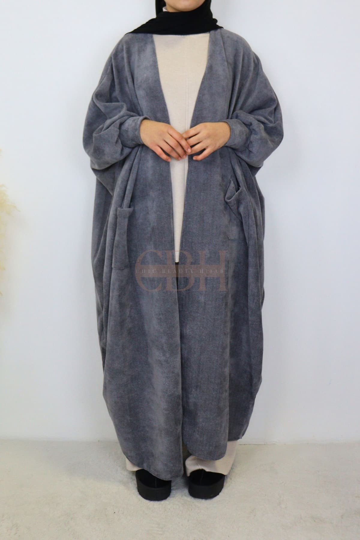 • Polyvalent et intemporel : Ce cardigan en velours gris femme s’associe facilement à vos Abaya, robes ou ensemble pour un look chic et cosy.