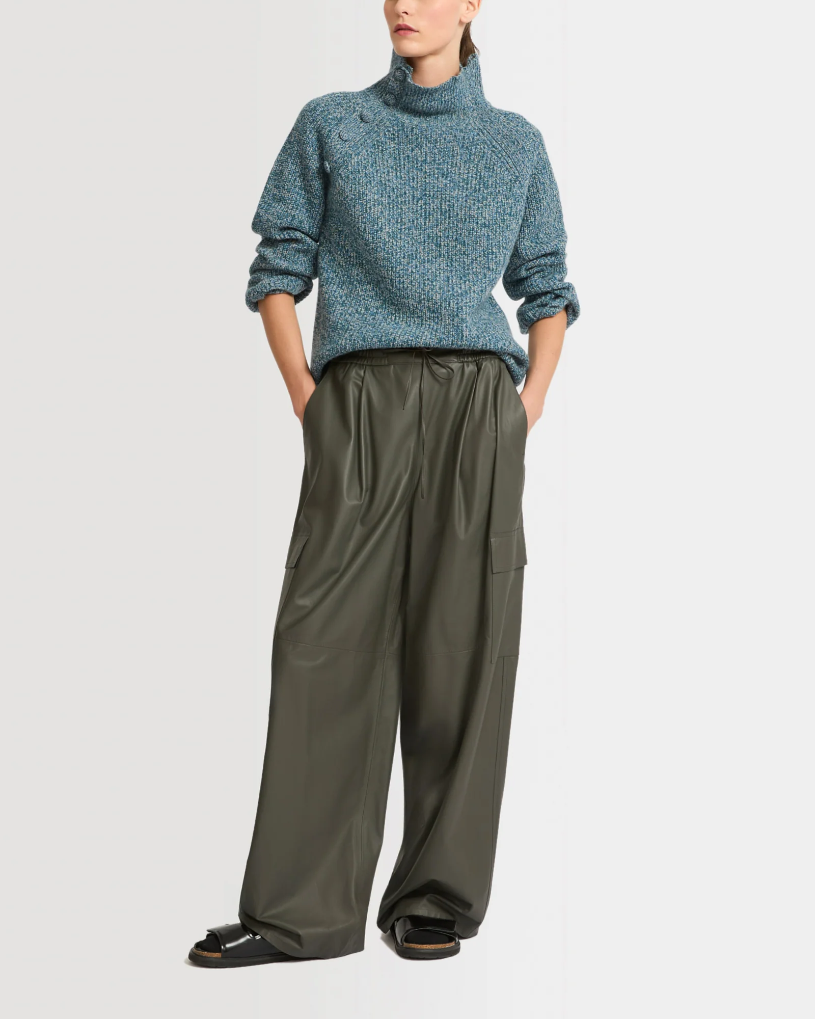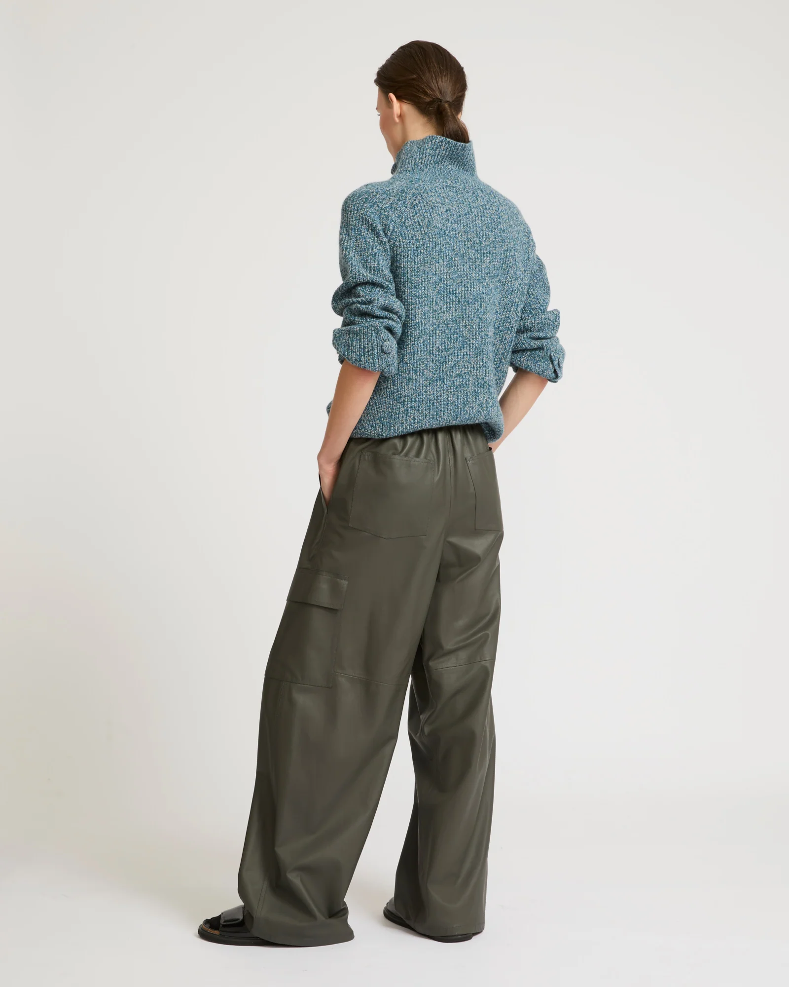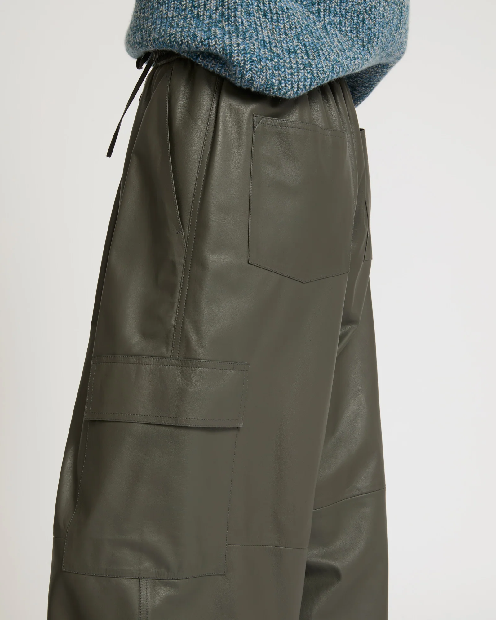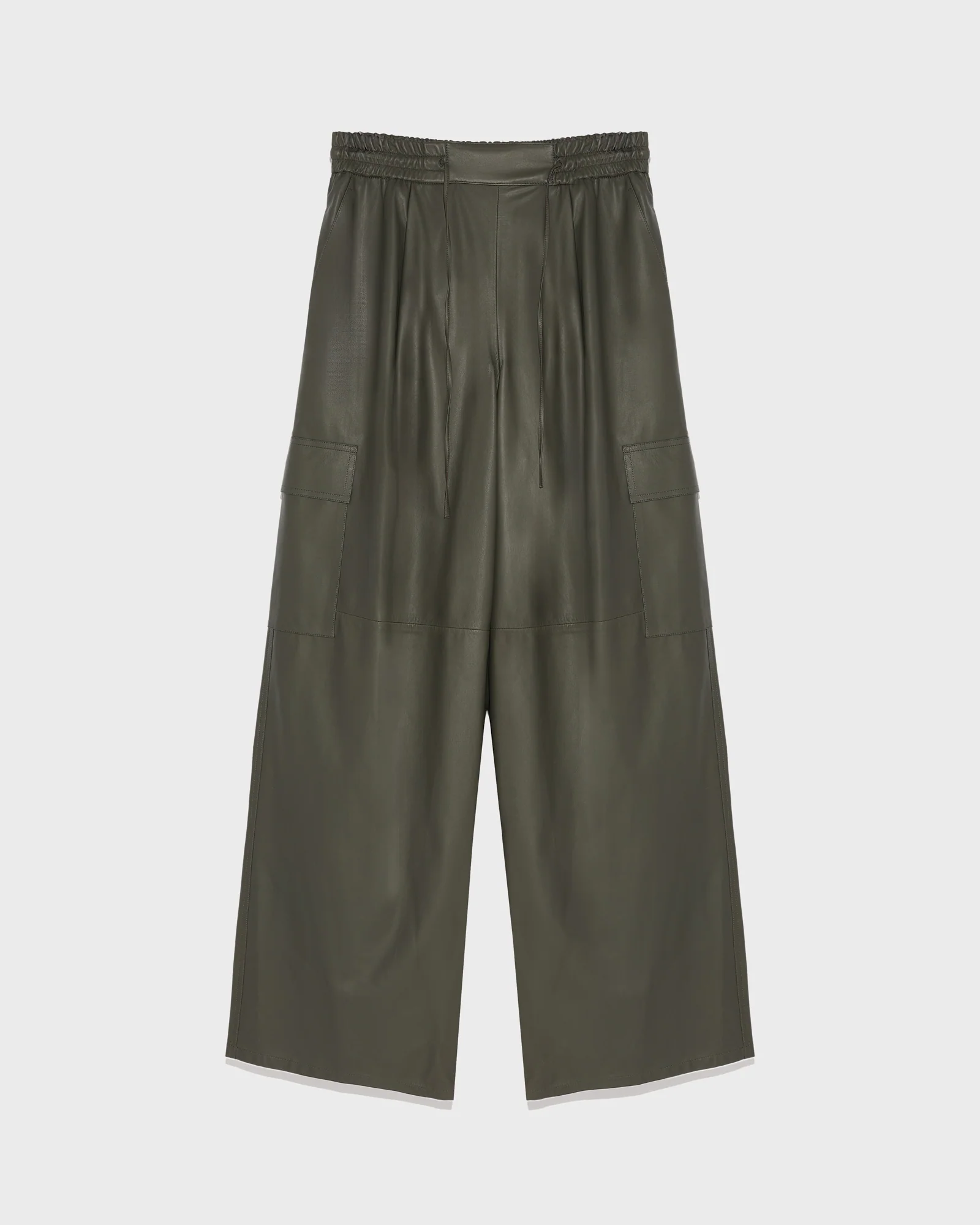 A new interpretation of the cargo trousers for a casual yet elegant look. Crafted from lamb leather, this supple and lightweight model has two Italian pockets and four patch pockets. Featuring an elasticated waistband and drawstrings at the waist and ankles, the cut is adjustable to fit every style. Versatile and original, these cargo trousers turn the utility codes into a feminine statement.
