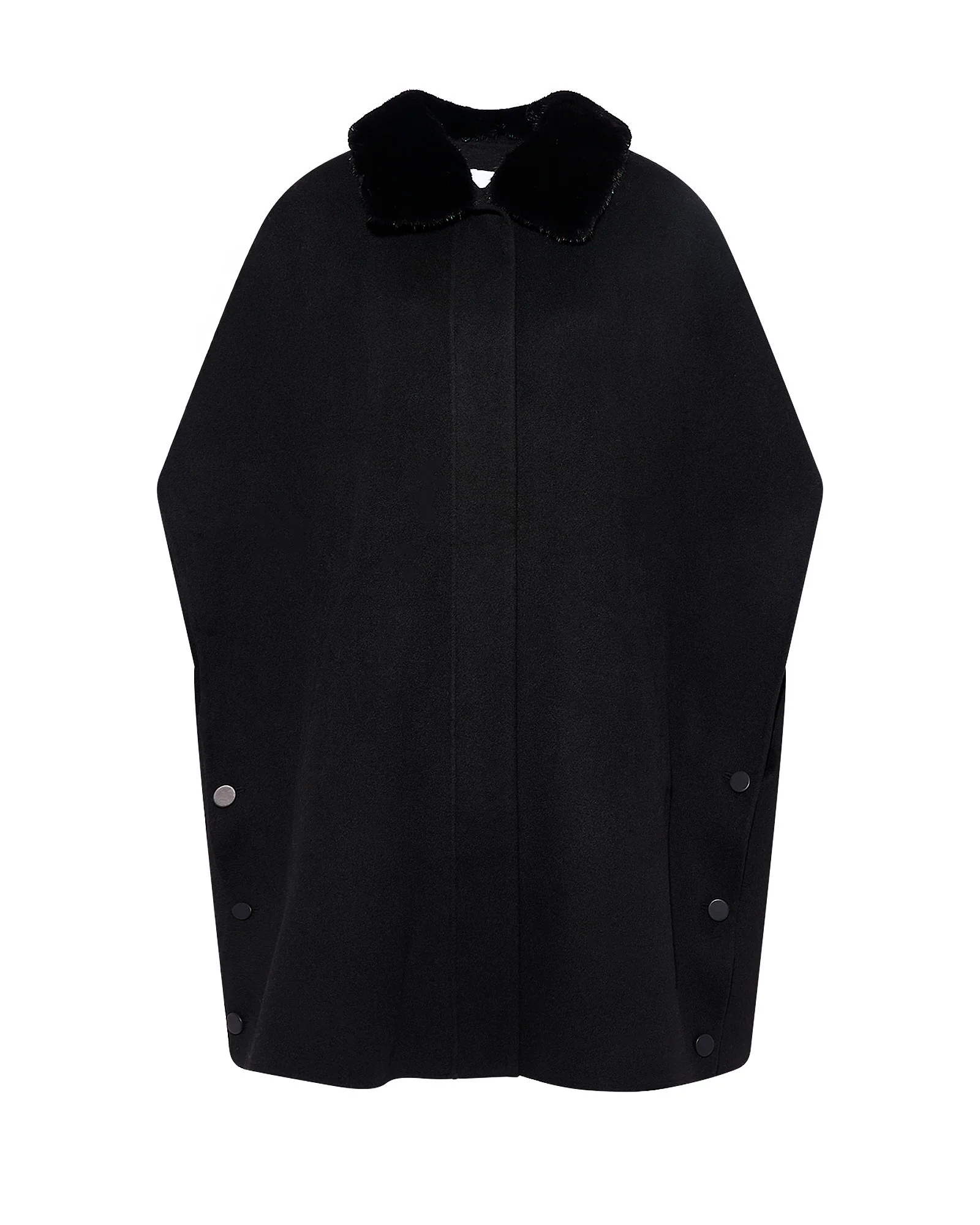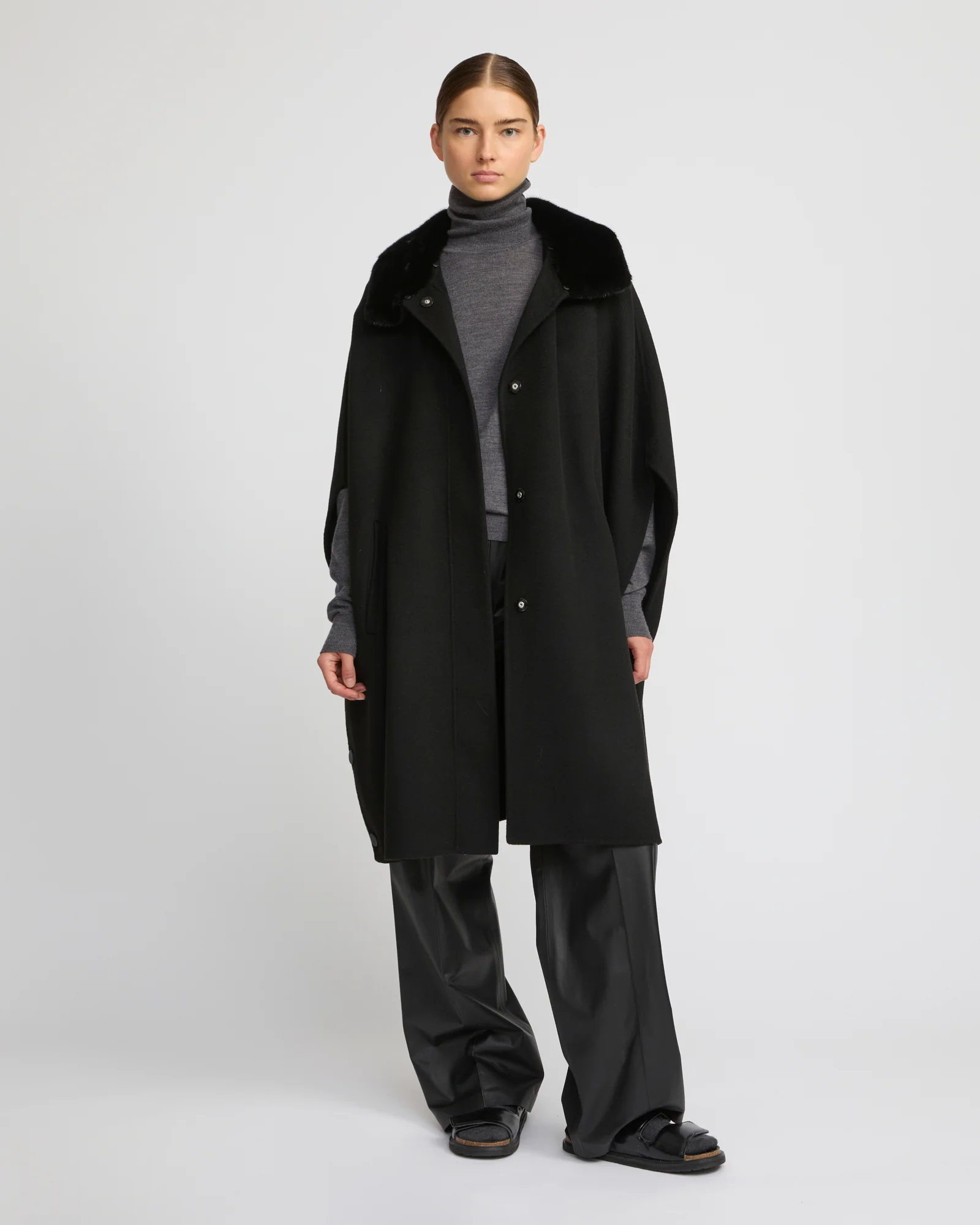 A generous, body-wrapping shape for this cape in cashmere blend, which envelopes the silhouette whether worn belted or not. A removable collar in long-haired, thick and shiny mink fur provides a luxurious touch to frame the face.