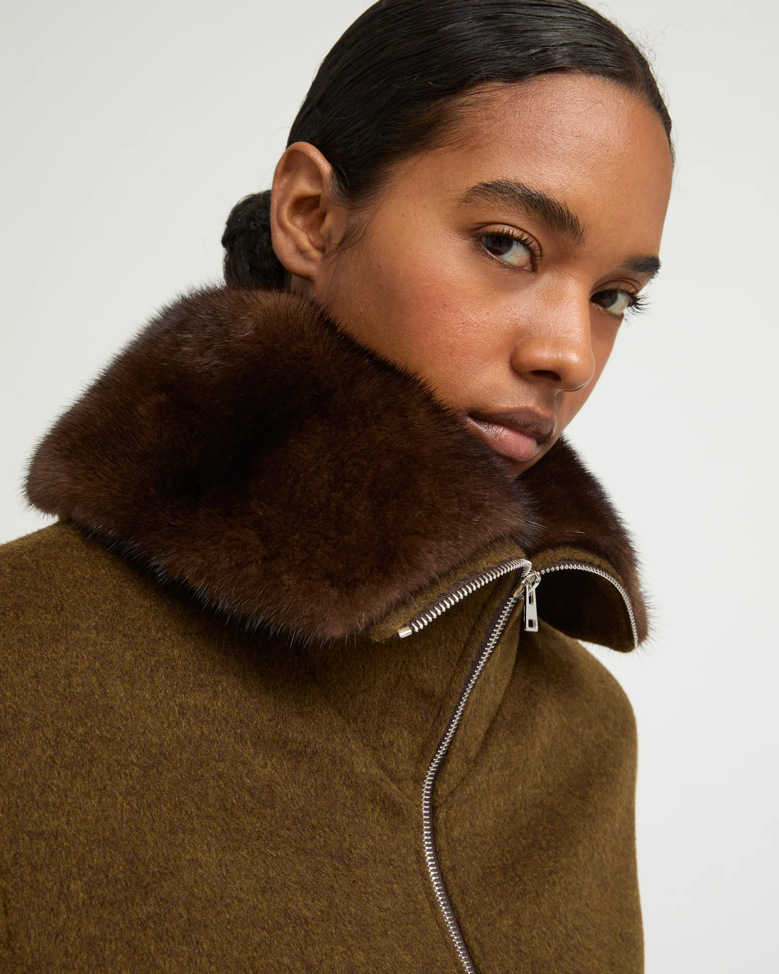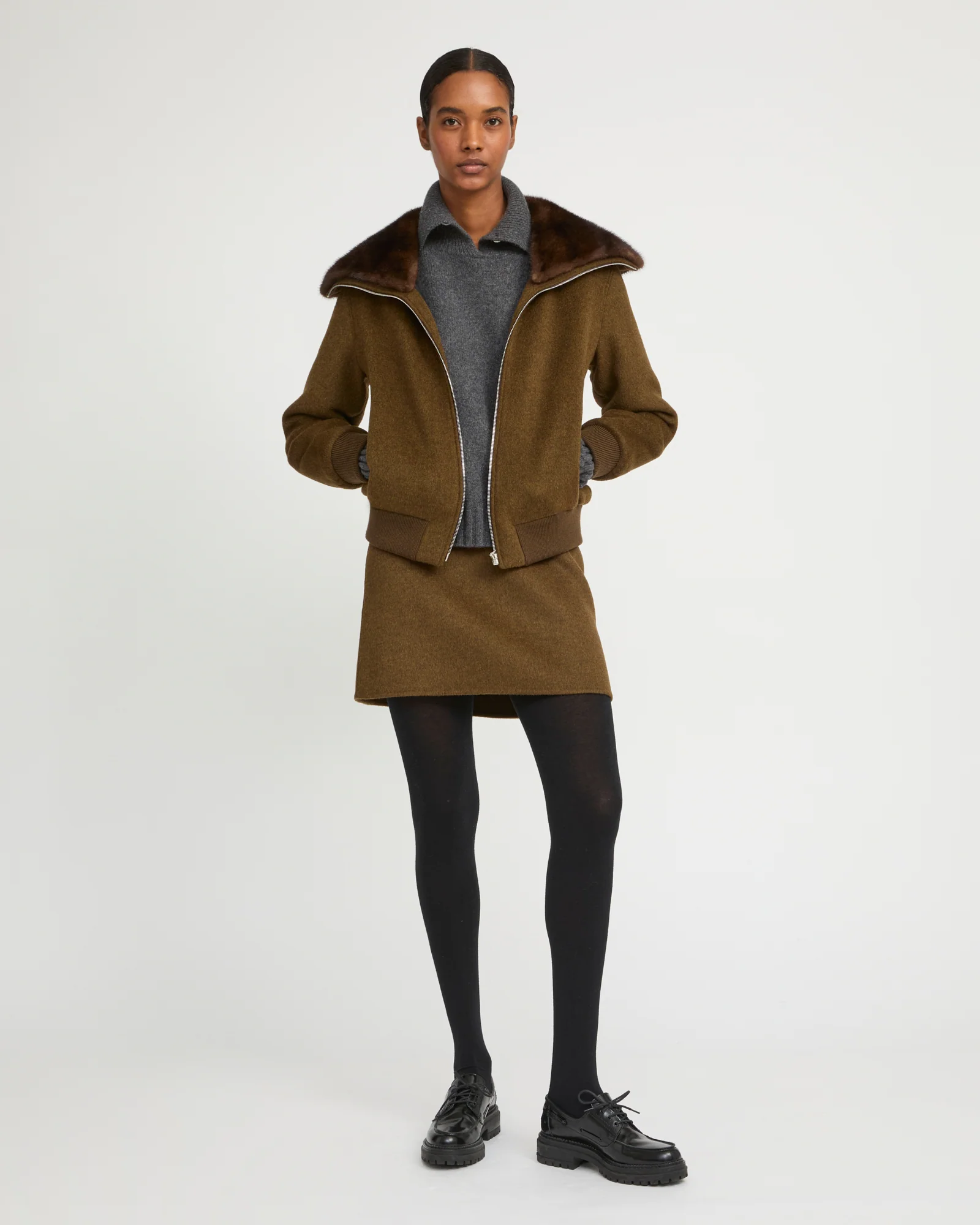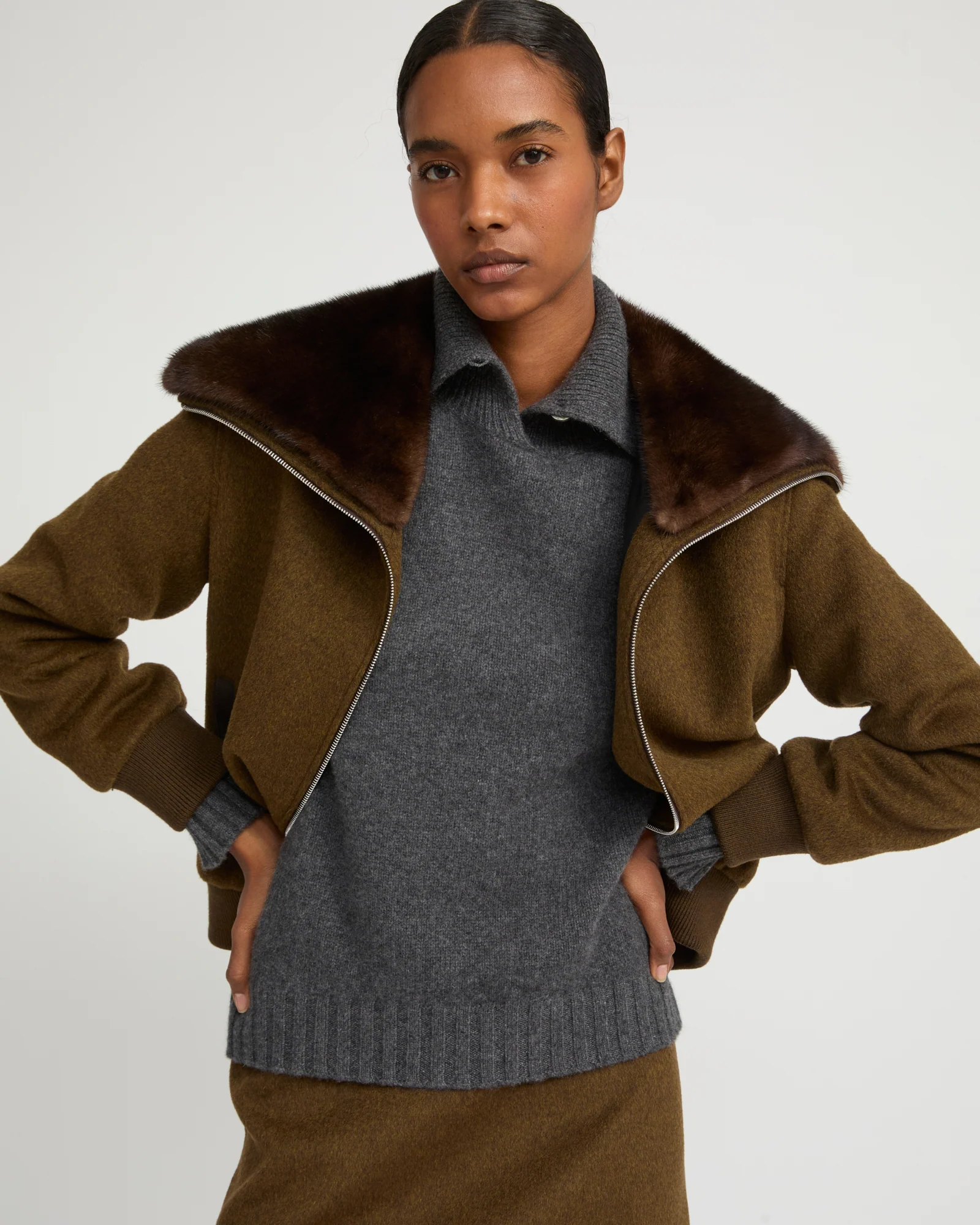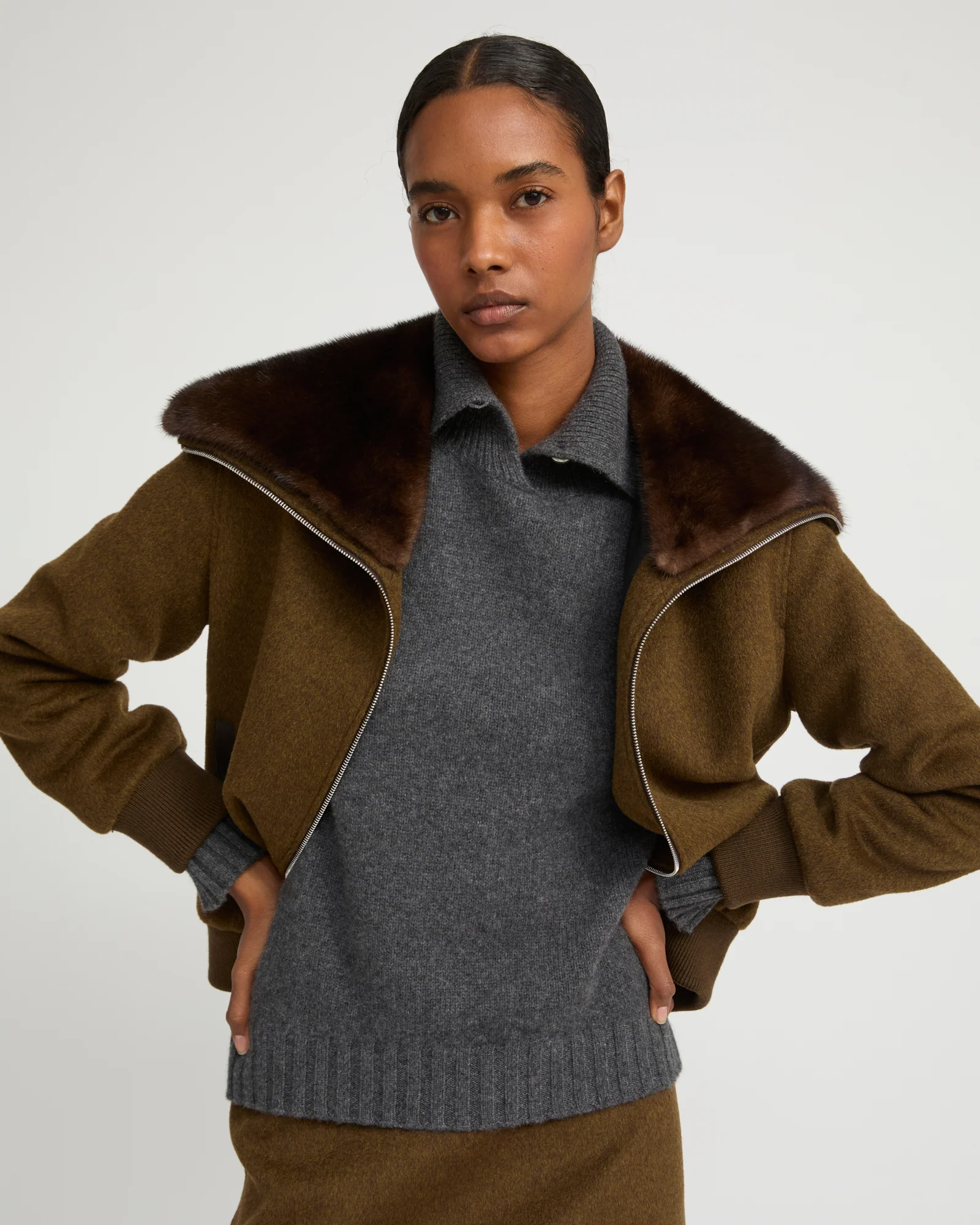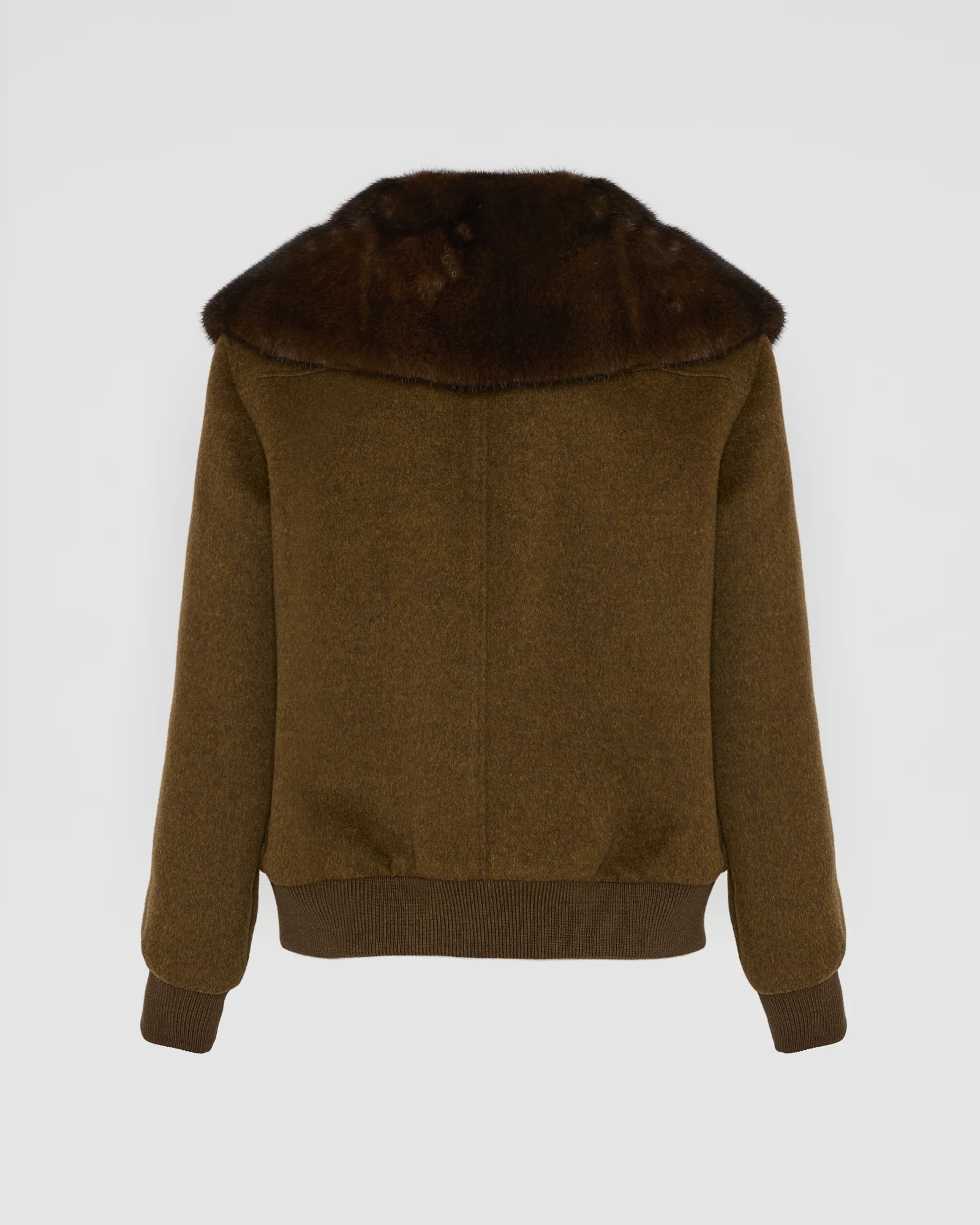 A wide, removable collar in soft yet resistant mink fur brings its touch of luxury to a short blouson in wool and cashmere blend, with a sporty shape and front zip.