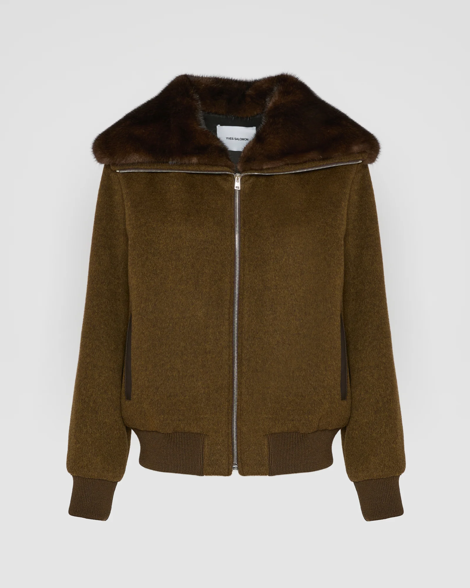 A wide, removable collar in soft yet resistant mink fur brings its touch of luxury to a short blouson in wool and cashmere blend, with a sporty shape and front zip. – Yves Salomon Collection– Length 60 cm– Wide collar– Detachable long-haired mink fur collar– Dry-washable lambskin welt pockets– Zip fastening– Lined
