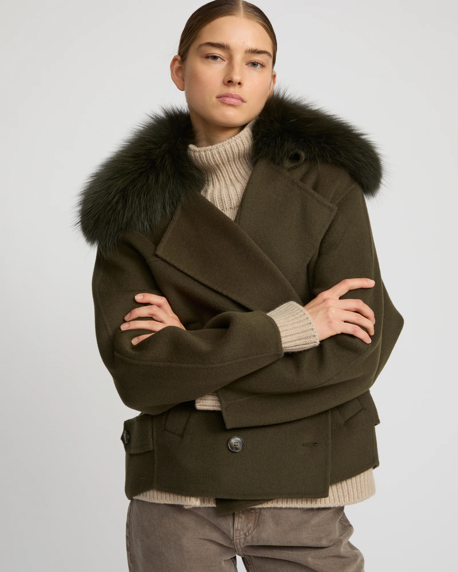 A hybrid of the cape and coat, this generous garment wraps elegantly around the body to protect it against cold weather. The double-sided wool and cashmere fabric hangs perfectly, while the large hood features a fox fur trim, which can also be removed for greater versatility.