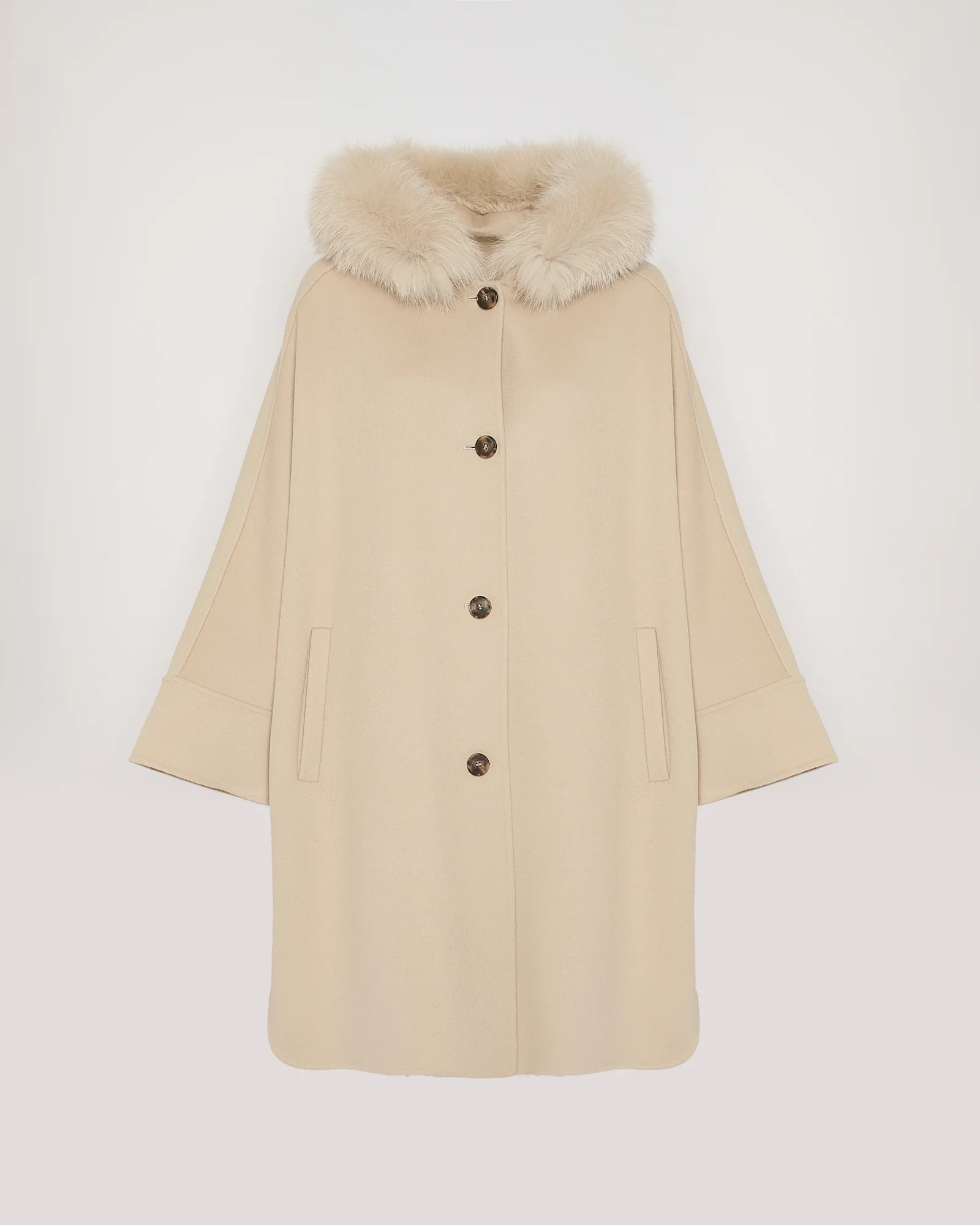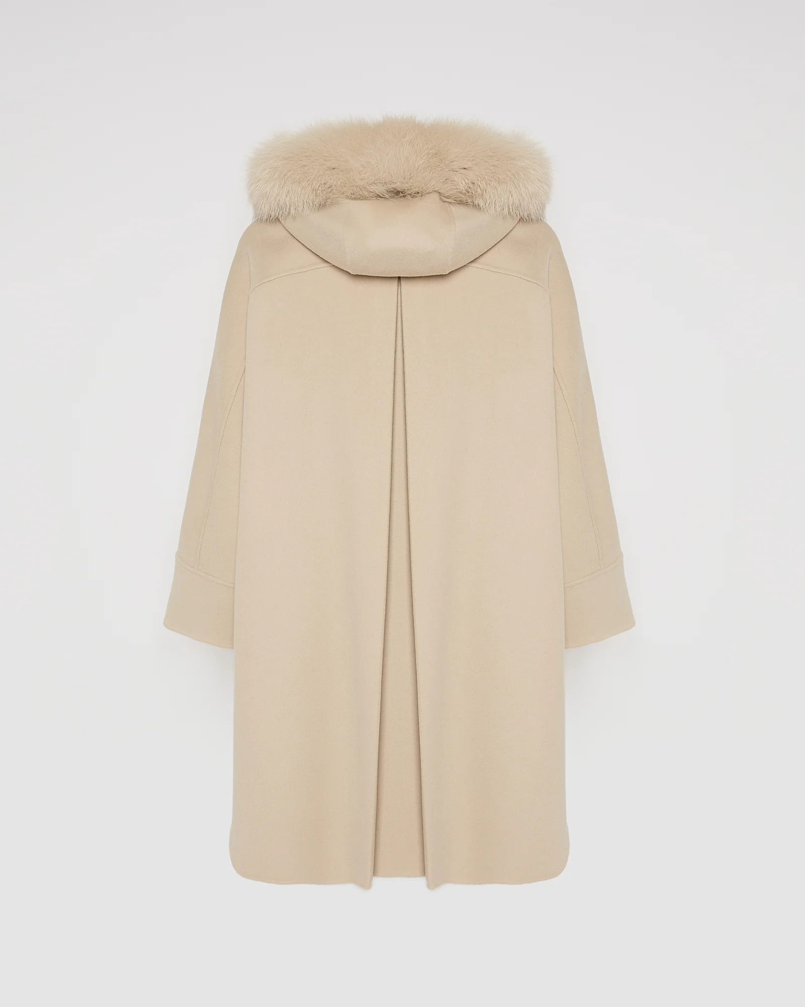 A hybrid of the cape and coat, this generous garment wraps elegantly around the body to protect it against cold weather. The double-sided wool and cashmere fabric hangs perfectly, while the large hood features a fox fur trim, which can also be removed for greater versatility.