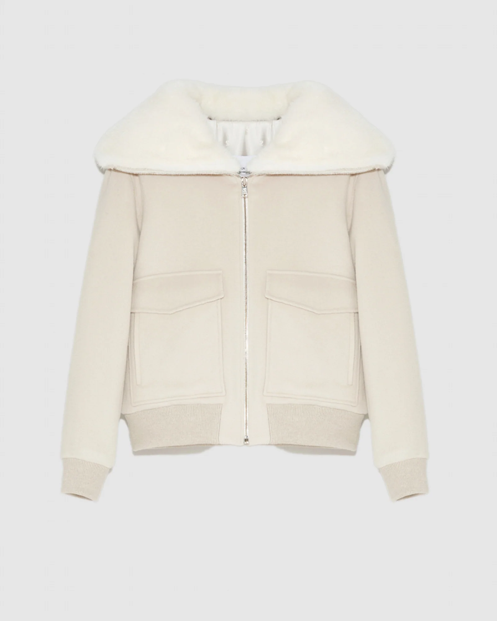 Double-faced cashmere jacket with mink fur collar – Zip jacket– Length 60cm– Double-faced cashmere model– Removable mink fur collar– Zip fastening– Patch pockets– Ribbed hem and bottom sleeves– Lined