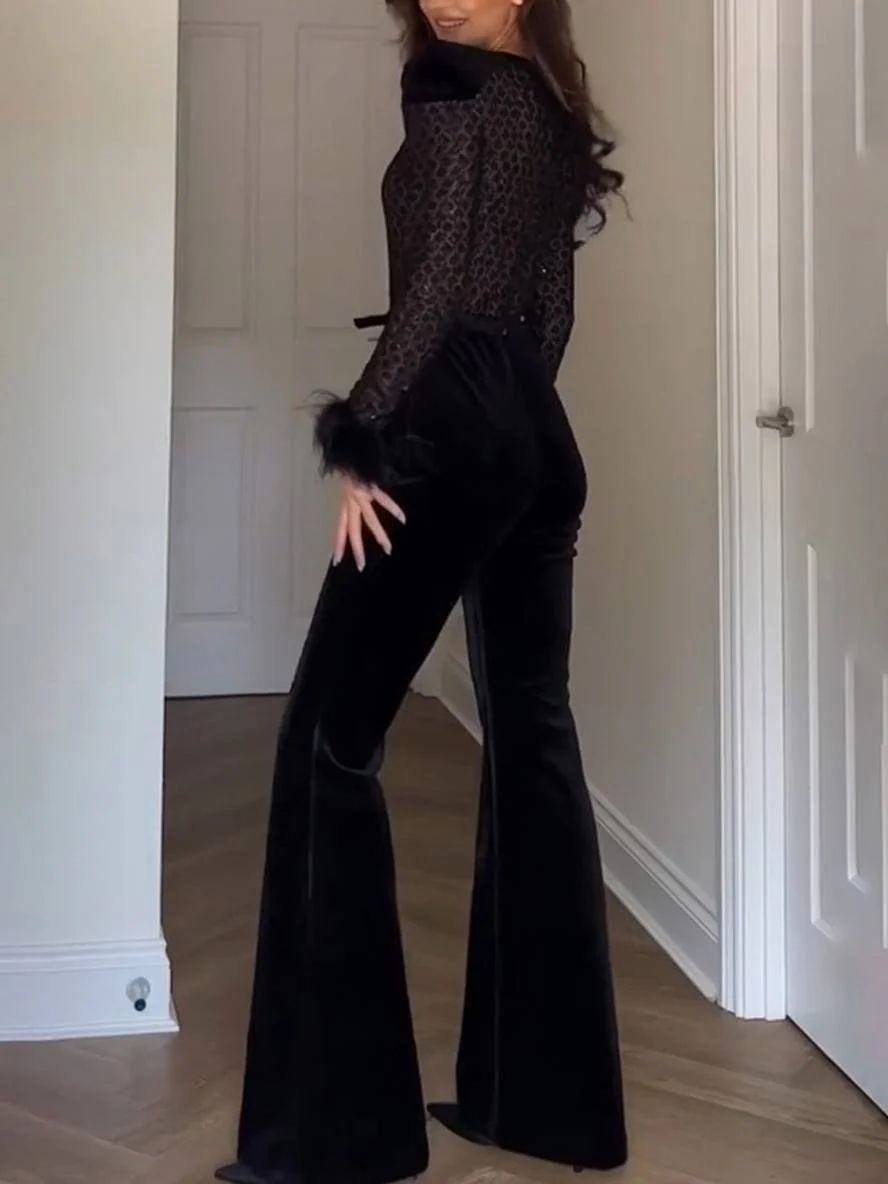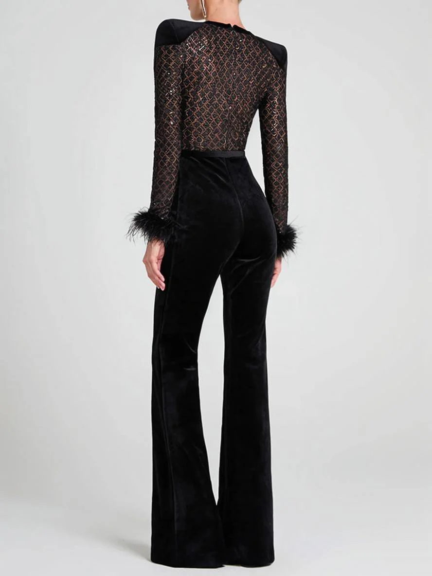 Découvrez l’équilibre parfait entre matière, coupe et fonctionnalité avec combinaisons flare évasé slim fitness col rond plume manches longues fermeture éclair femme casual élégant cérémonie | KONF.