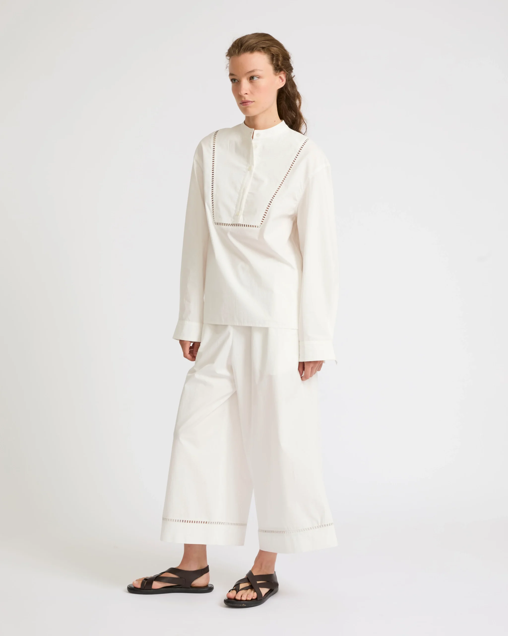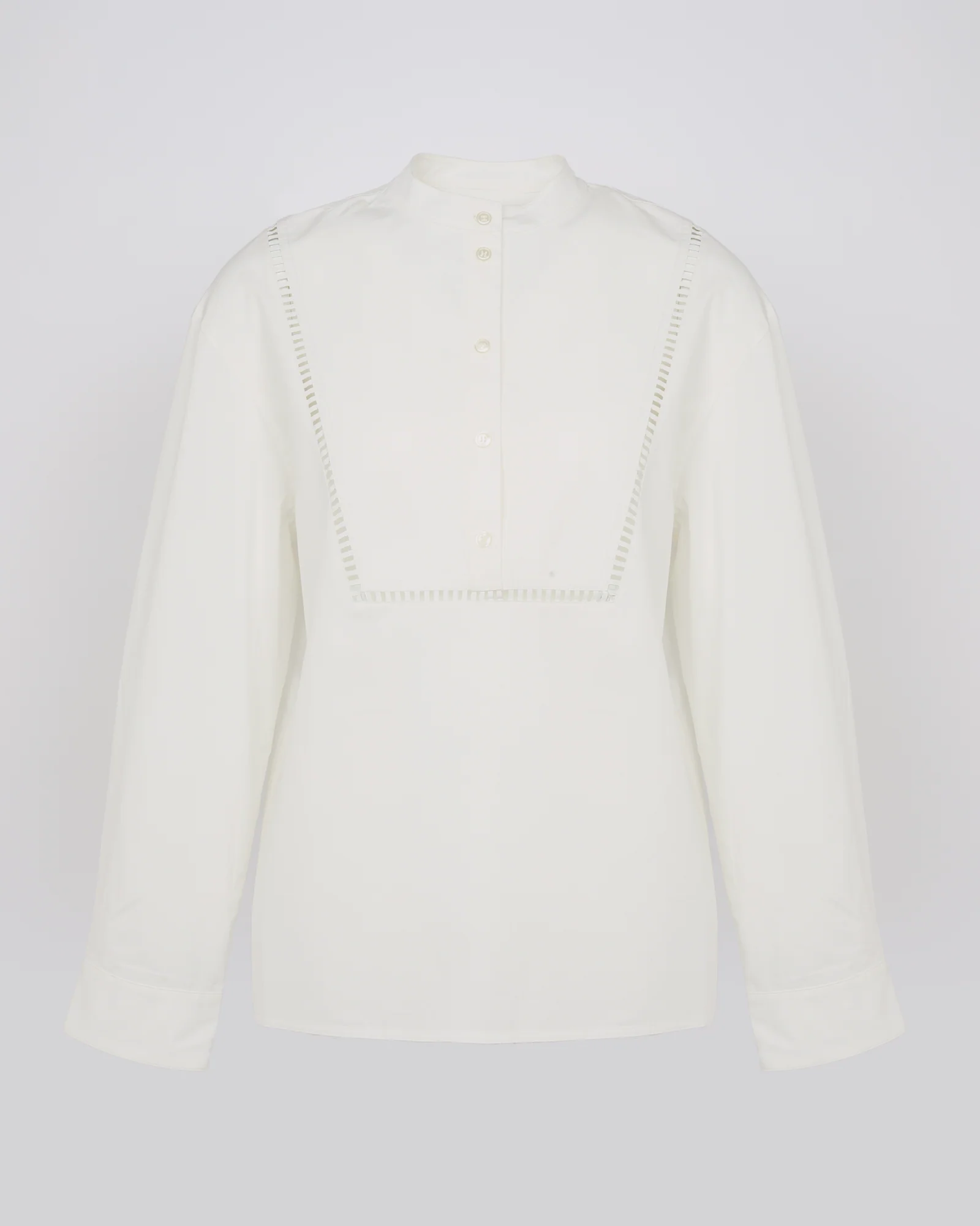 This crisp design with an oversized fit is inspired by the classic artists’ smock. Leather embroidery details border the cotton poplin bib. – Yves Salomon Collection – Oversized blouse– Length 66 cm– Officer collar with dickey– Button fastening– Ladder stitch-style perforated leather insert details– Long sleeves– Unlined