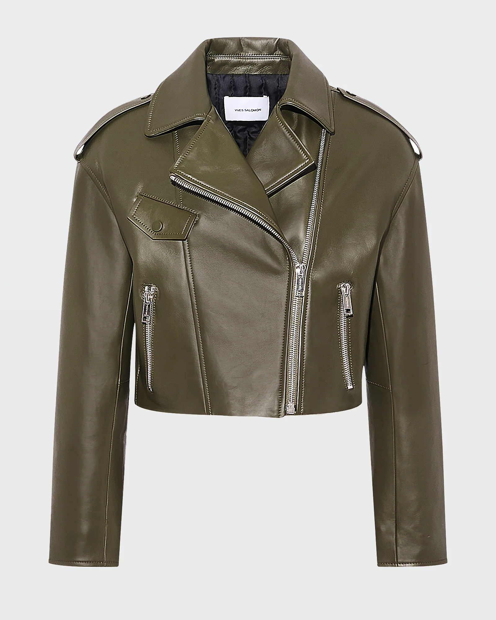 An asymmetric zip front, wrist zips and notched collar: all the details of the classic biket jacket feature on this shorter version, crafted in lambskin bonded with jersey for a softer effect.