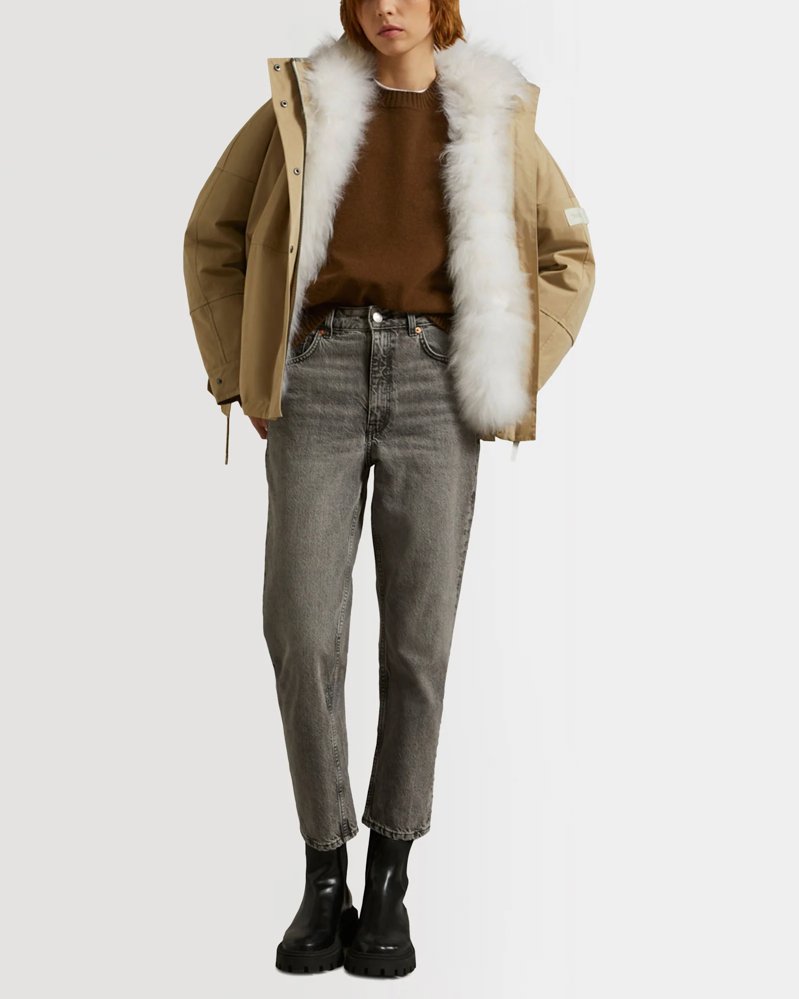 A cropped and reversible parka to match the season. Its pared back yet functional design includes a concealed zip and press-stud fastening, two lower flap pockets, as well as bottom sleeves with tightening tabs. Featuring drawstrings at the bottom, hood and back waist, the cut is adjustable to create a fitted silhouette. Made from a weather-resistant cotton blend, its removable lining offers a bold and distinctive look when the parka is reversed. Crafted from fluffy lambswool trimmed with velour leather, the sleeves are padded with down and duck feathers to guarantee comfort, warmth and breathability.