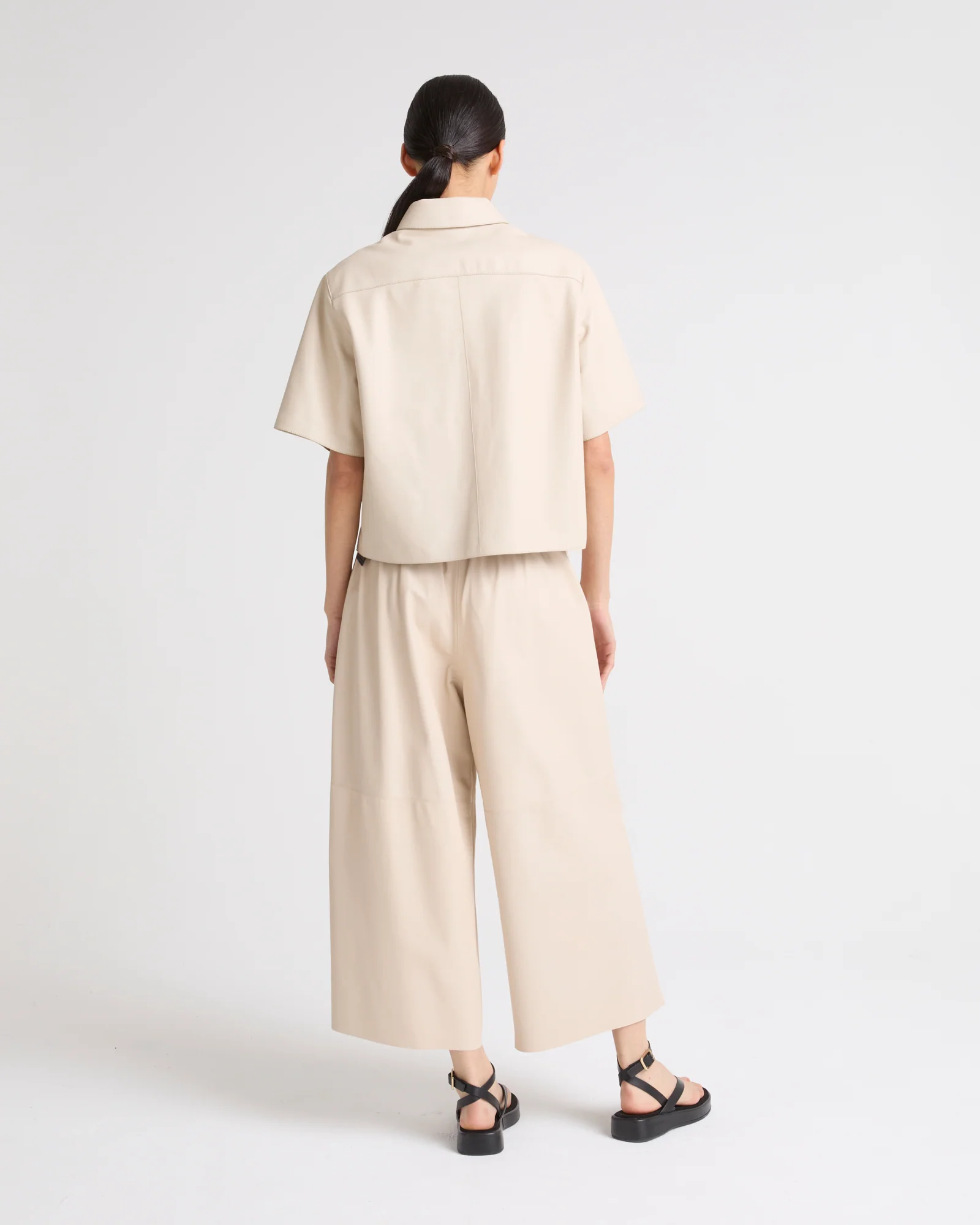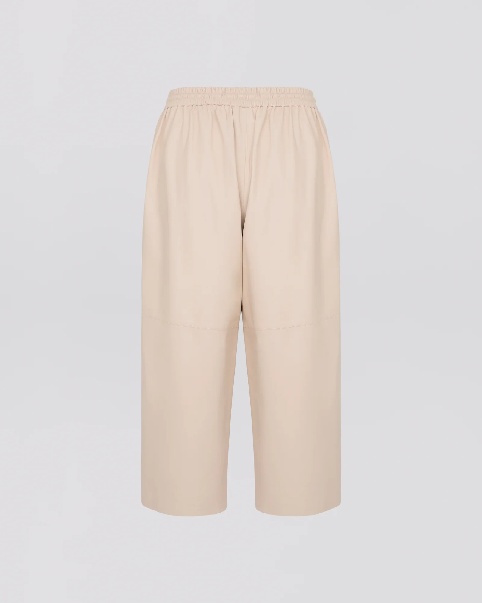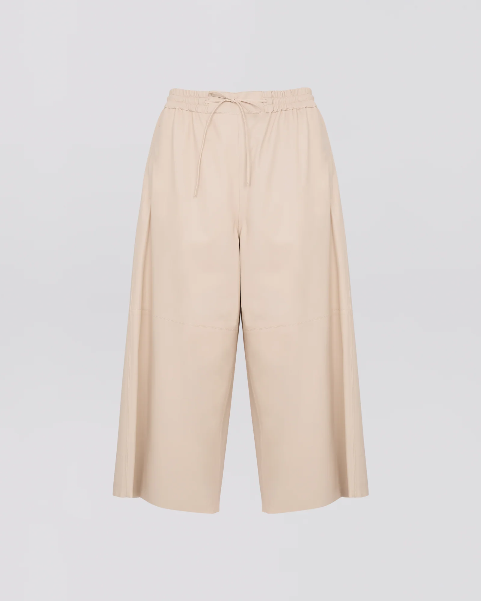 The softness of ultra-supple leather is perfectly suited to the streamilned, comfortable shape of these culotte pants, with their drawstring waist. Two side pockets add a relaxed feel to this elegant yet easy to wear design.