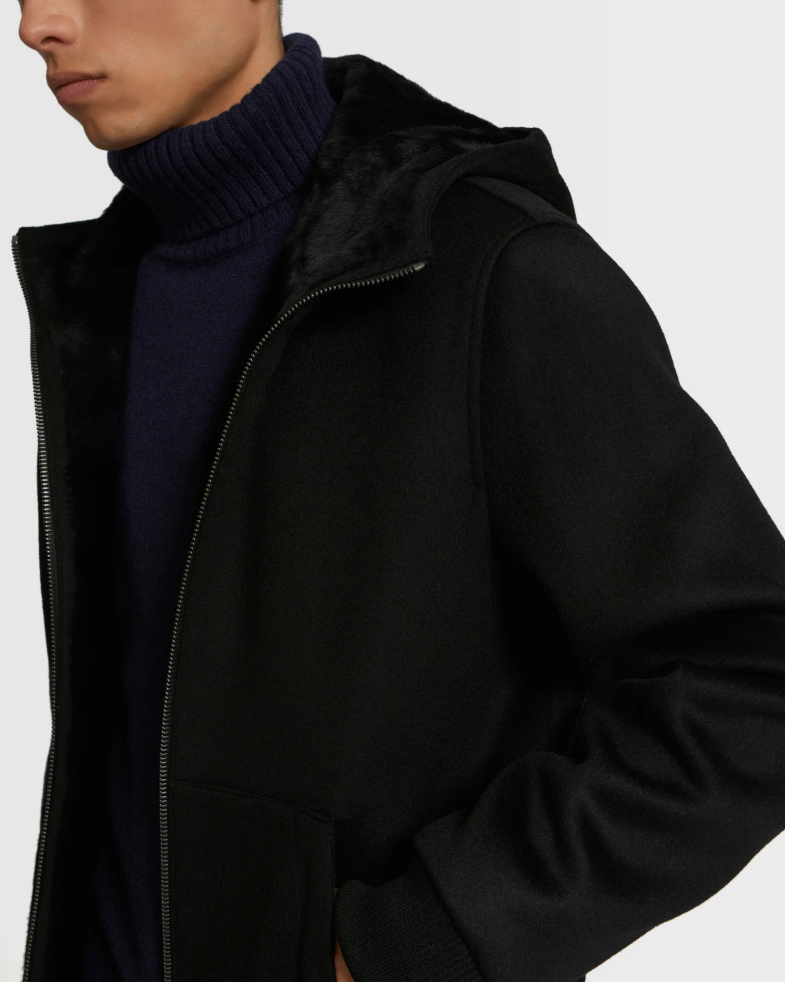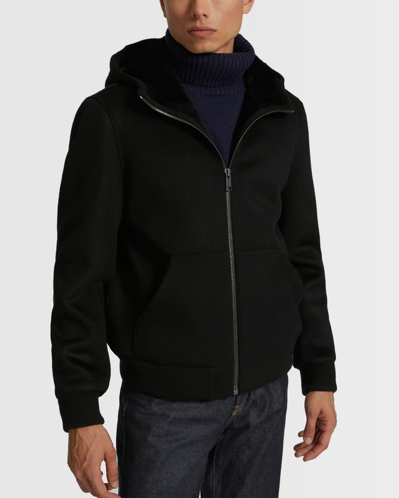 Wool-Cashmere fabric hooded jacket with shearling lining