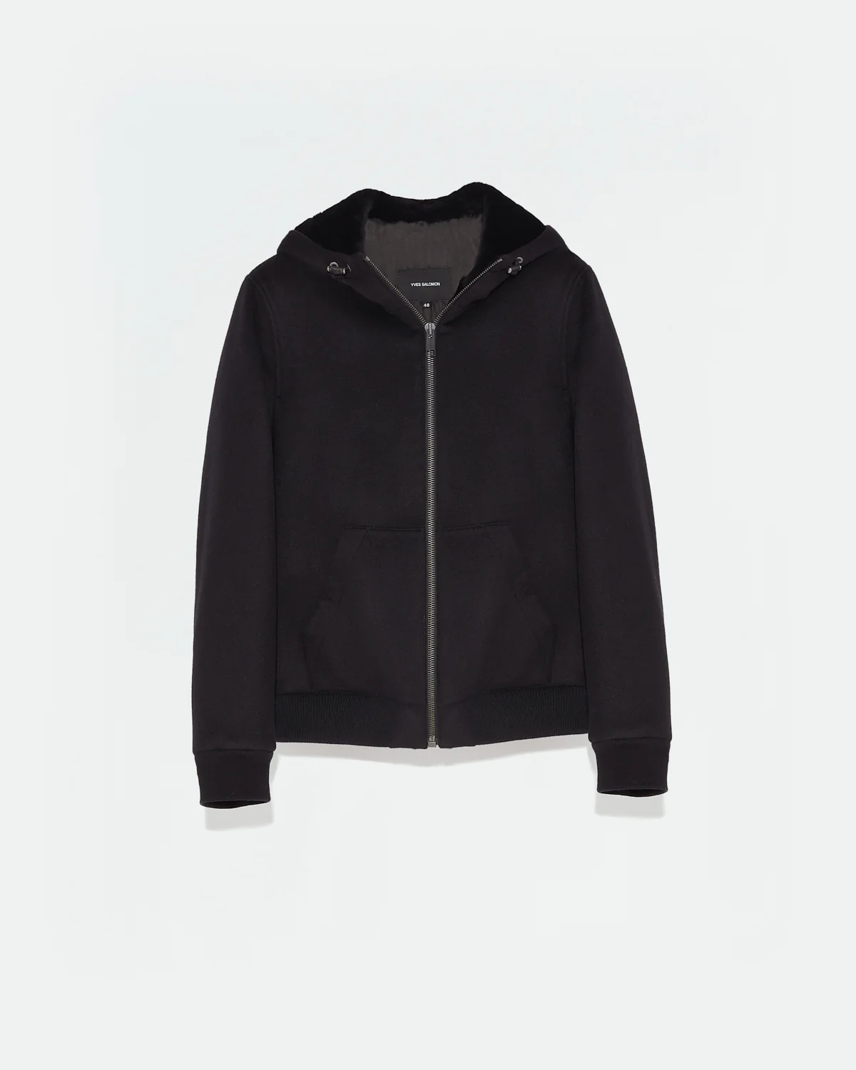 Wool-Cashmere fabric hooded jacket with shearling lining– This design fits true to size Take your usual size 90% wool and 10% Cashmere double-sided fabric jacket– Length: 67cm– Front zip fastening– Hood and front lined by black ultra soft lacon shearling