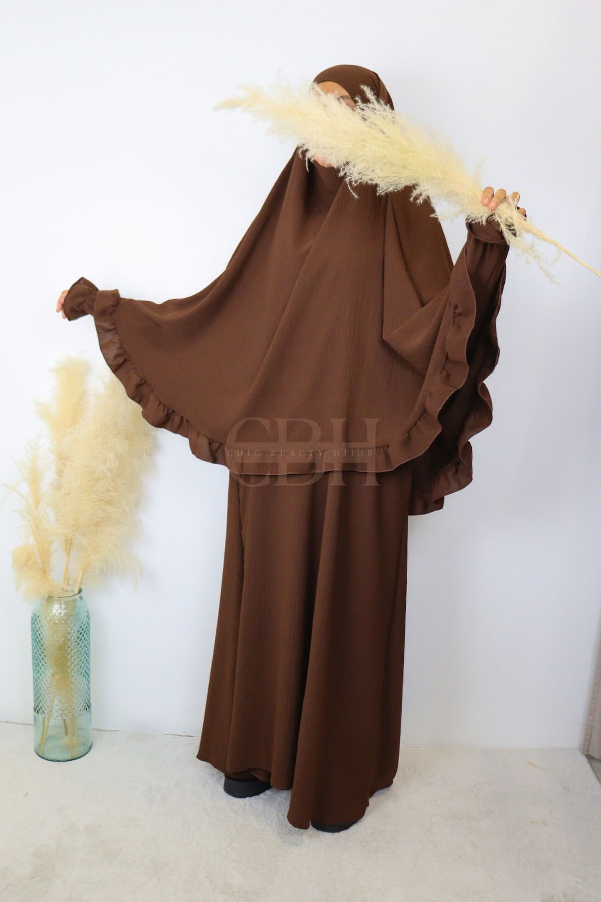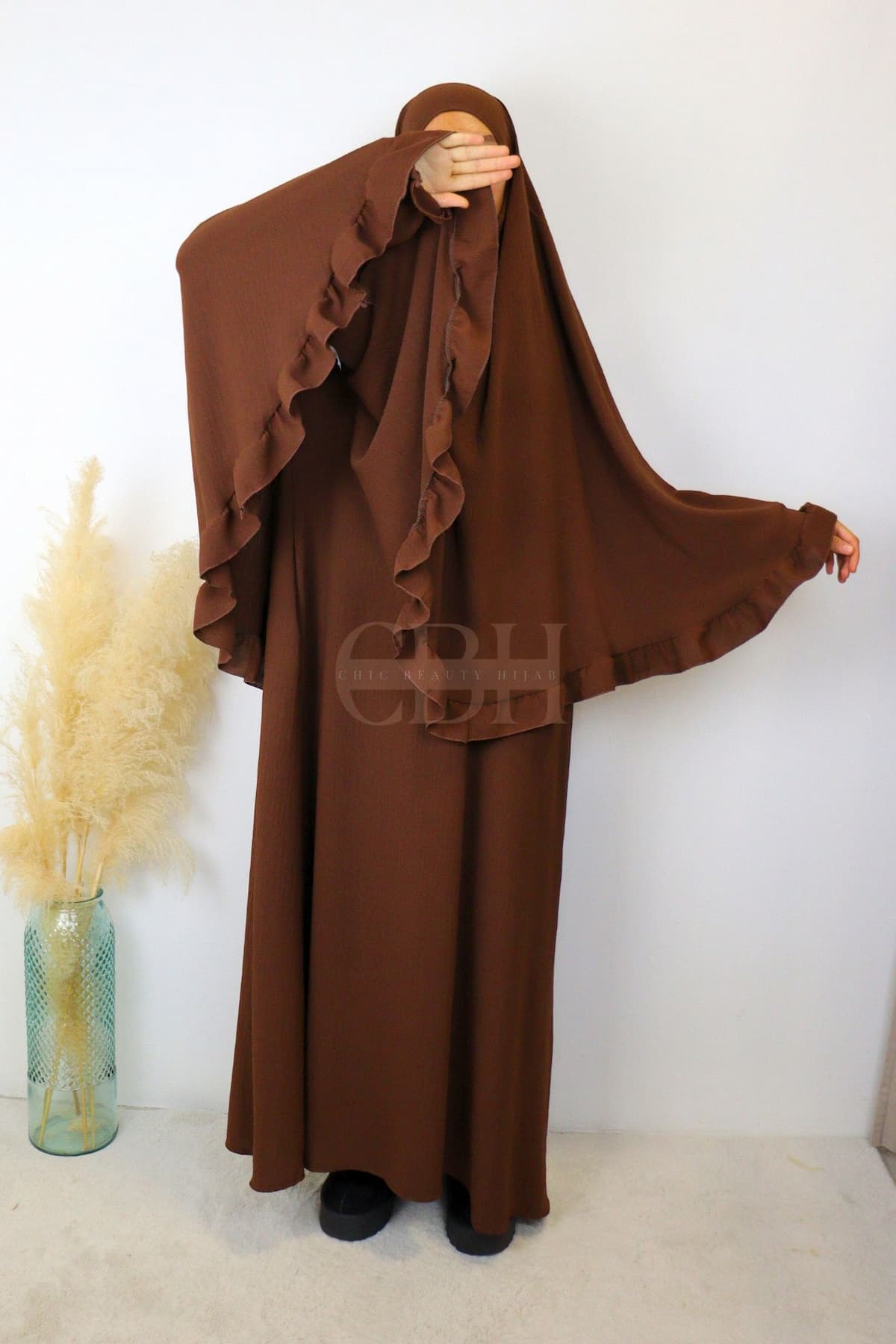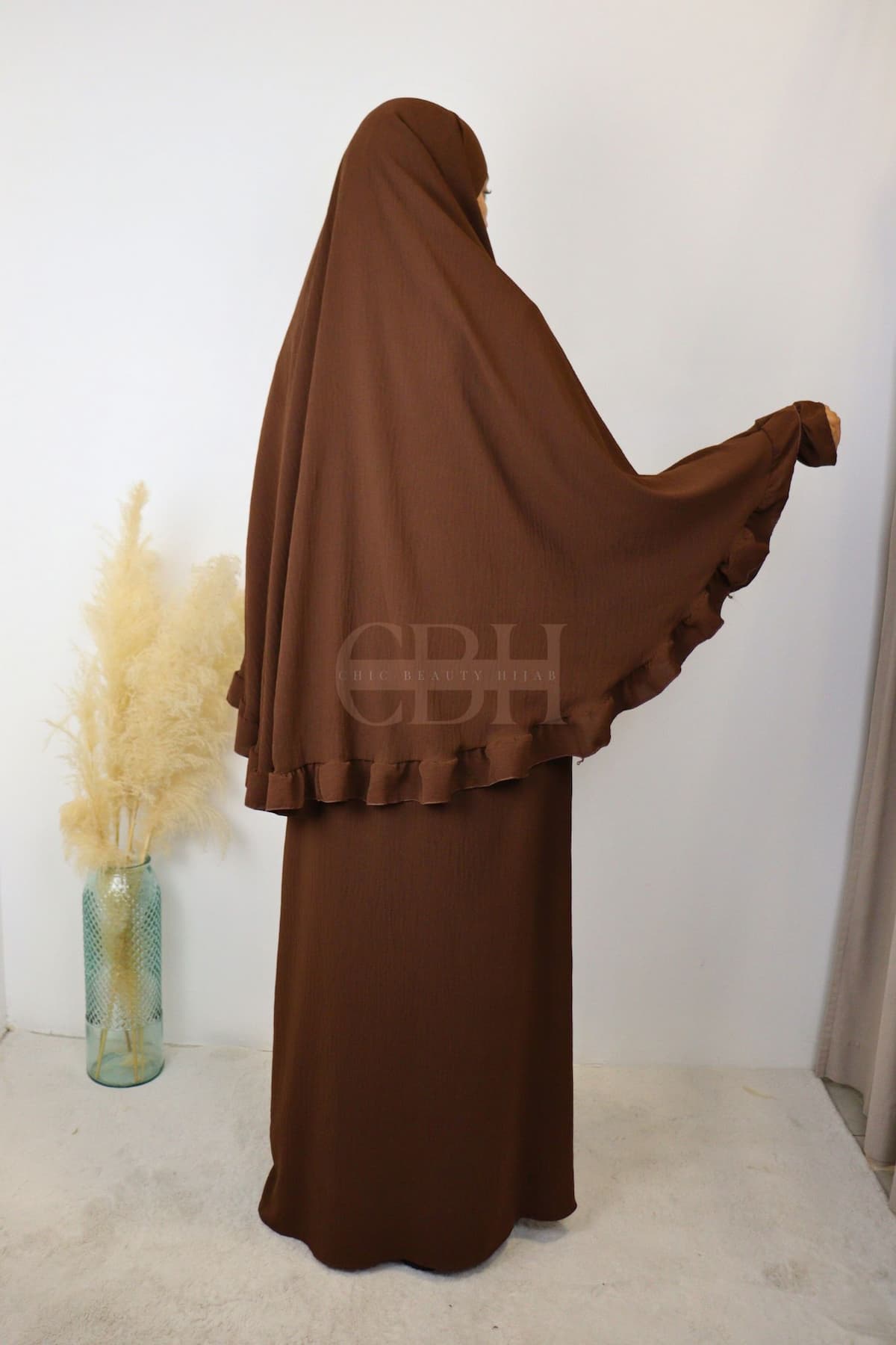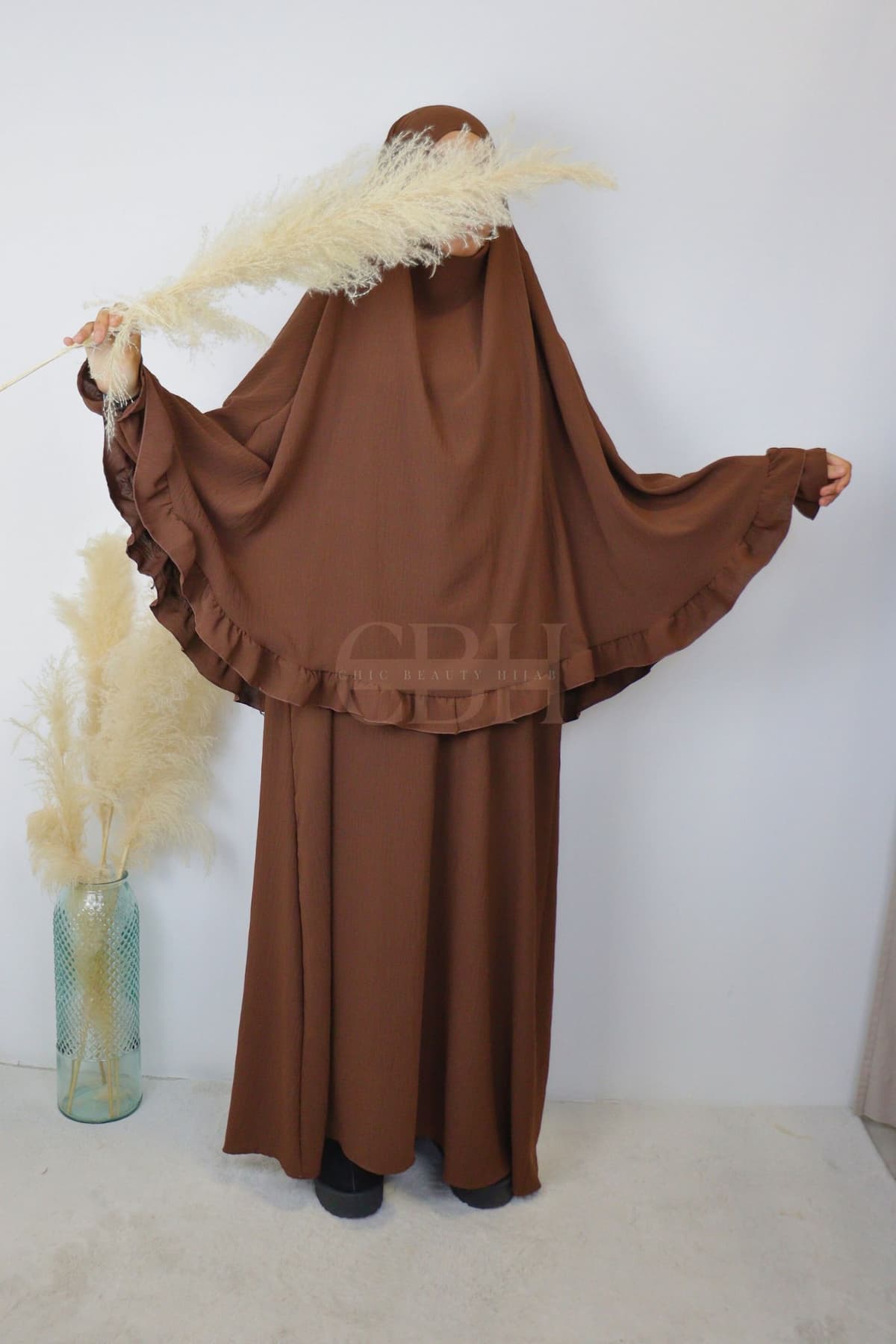 Découvrez notre ensemble abaya khimar jazz froufrou marron, une tenue de prière mastour idéale pour allier élégance, pudeur et confort. Conçu dans une matière soie de jazz infroissable, cet ensemble fluide et opaque est parfait pour la femme musulmane souhaitant une abaya moderne avec un khimar long et couvrant.