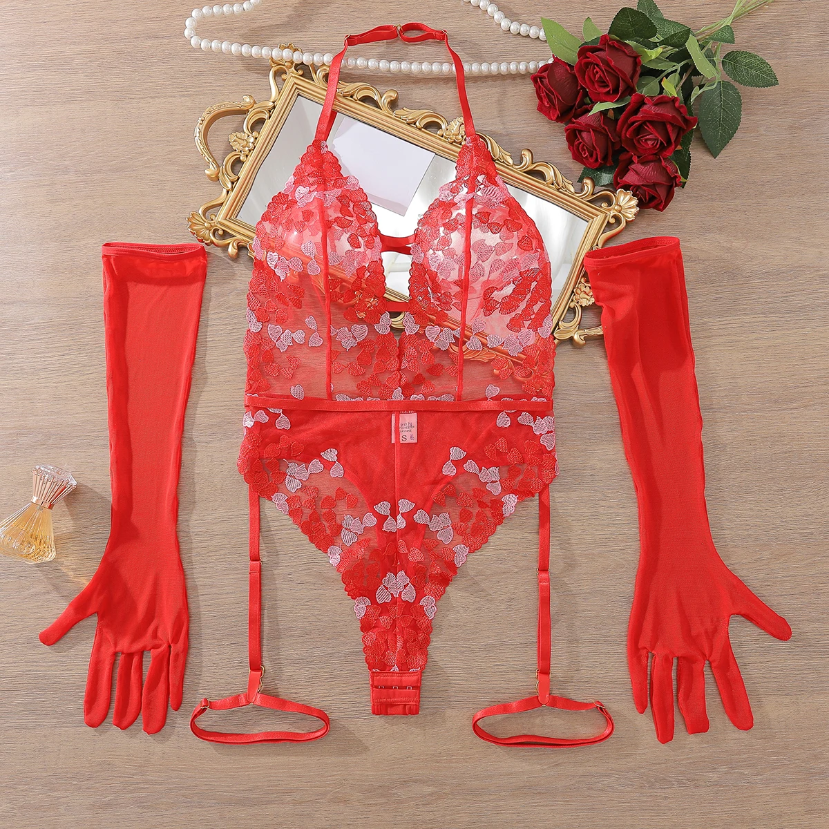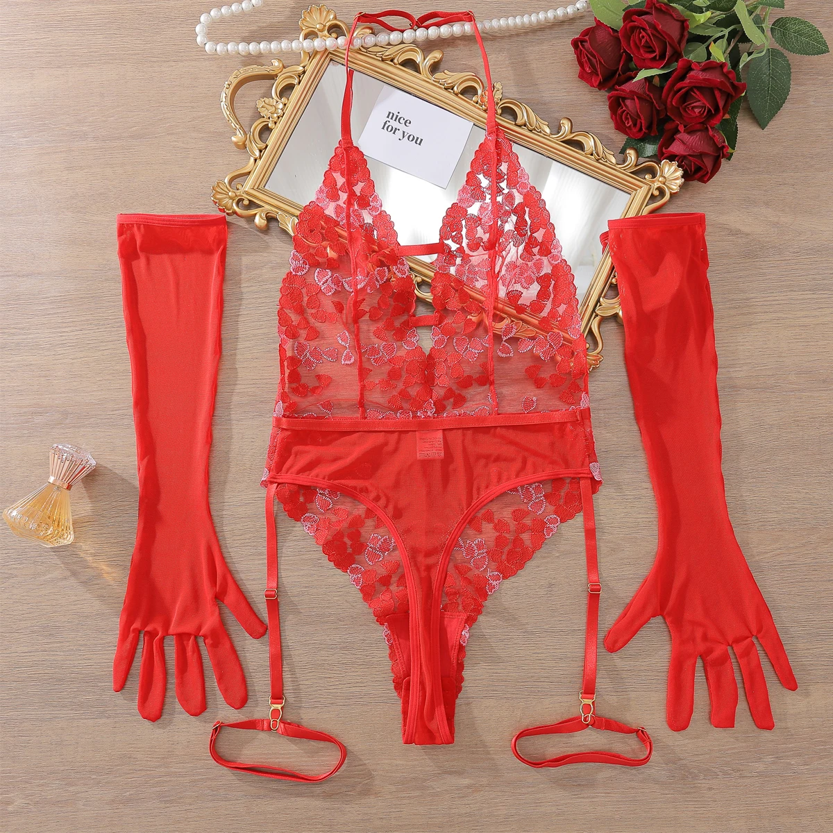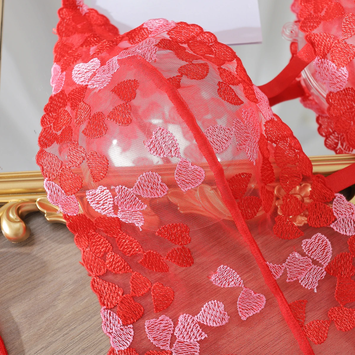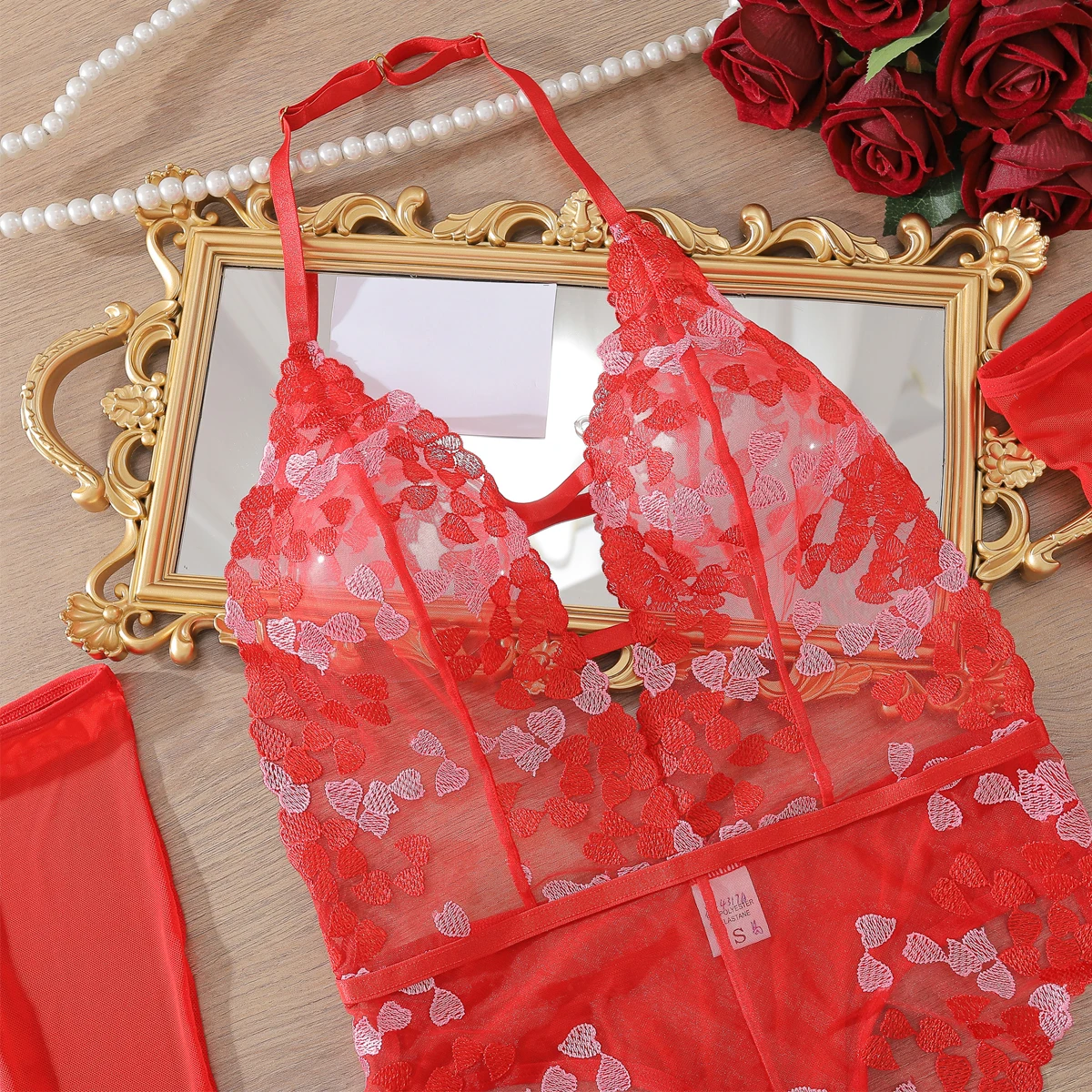 Ensemble combinaison pour femmes Sexy rouge dentelle fleur brodé soutien-gorge maille