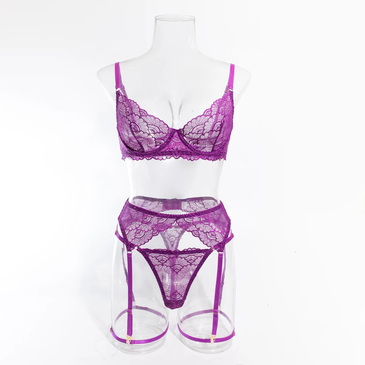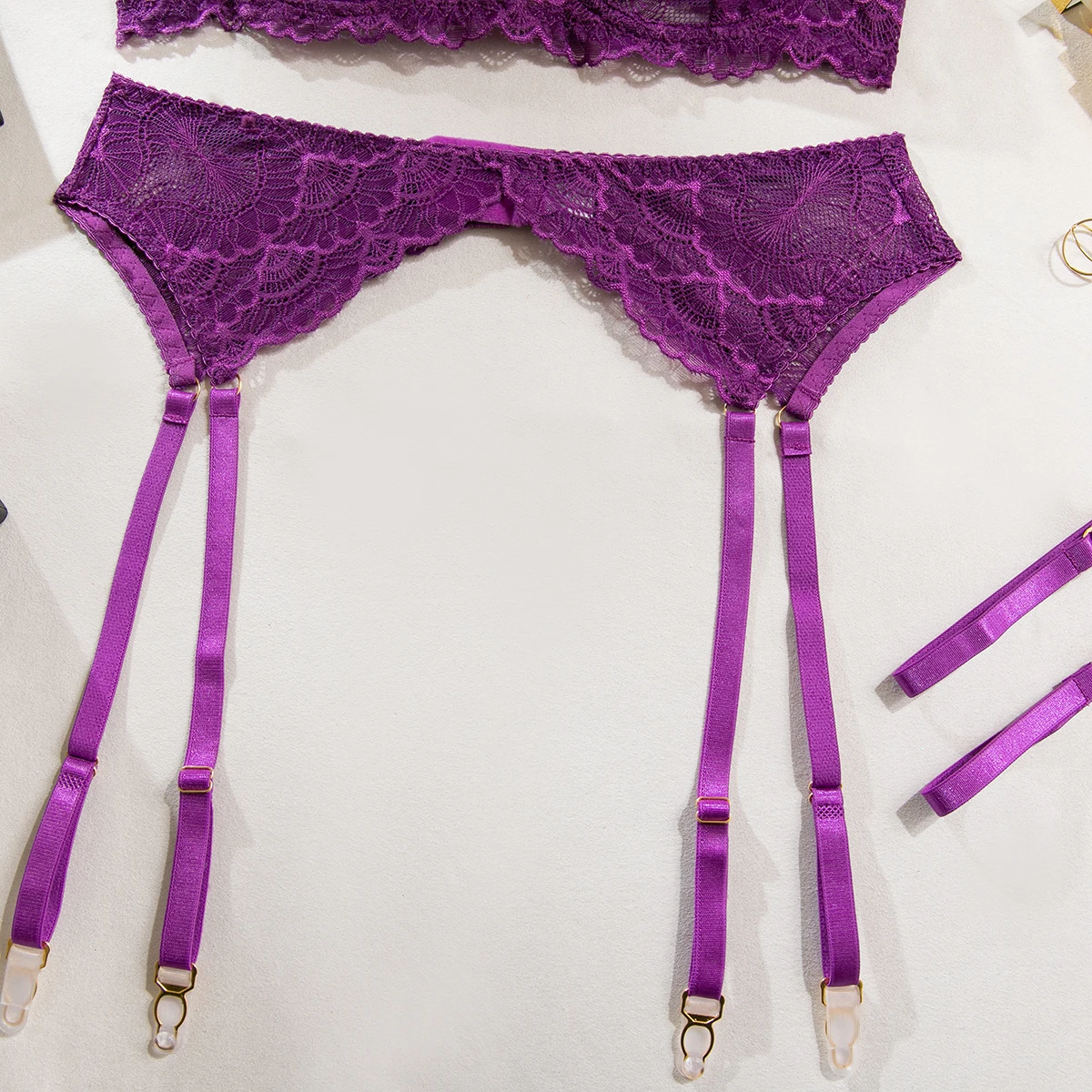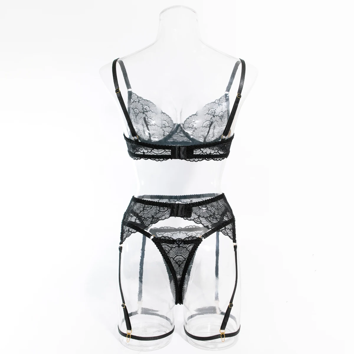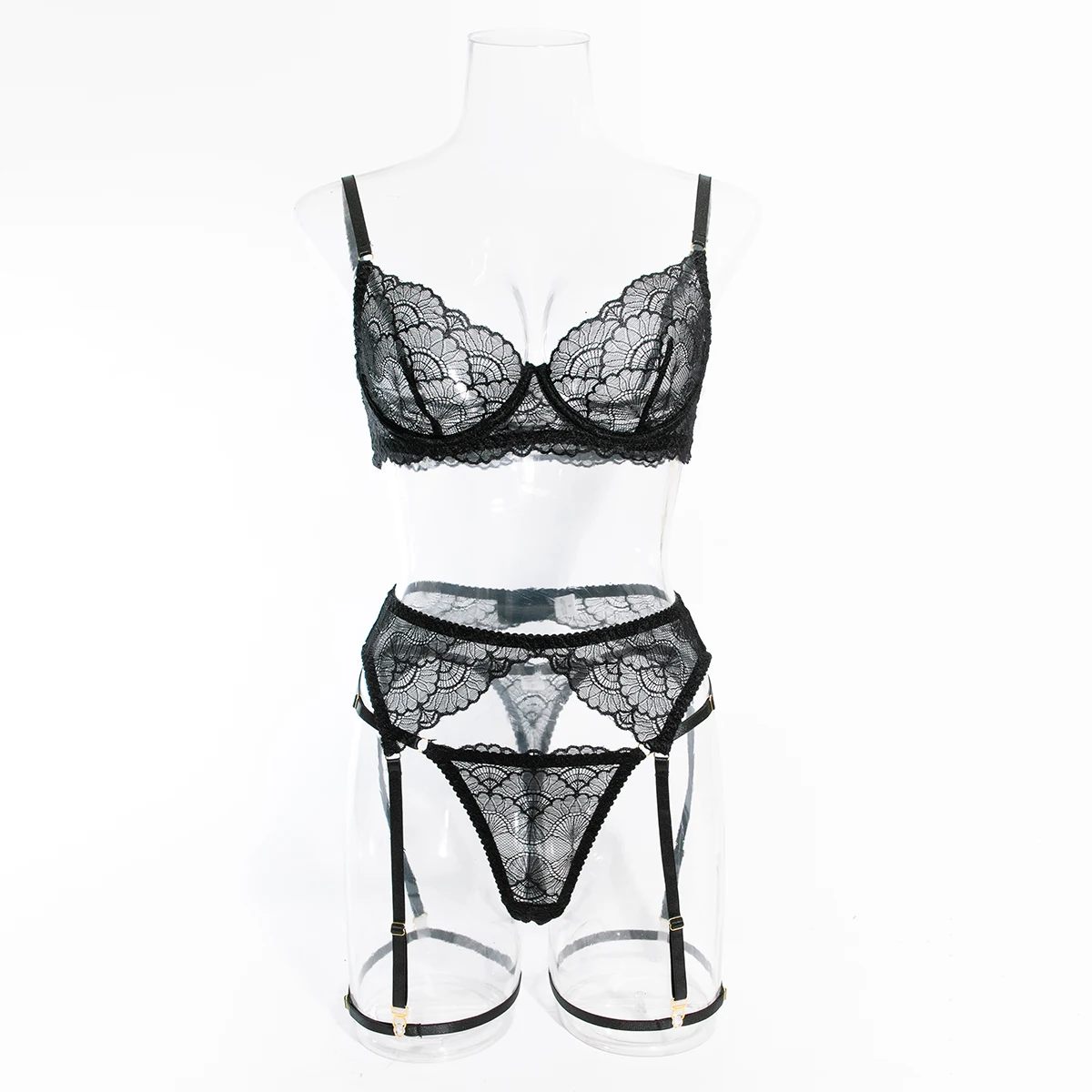 Ensemble de 4 pièces de Lingerie Sexy ajourée en dentelle noire, soutien-gorge et tongs transparents à volants