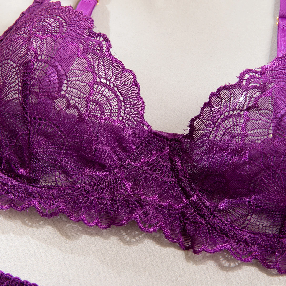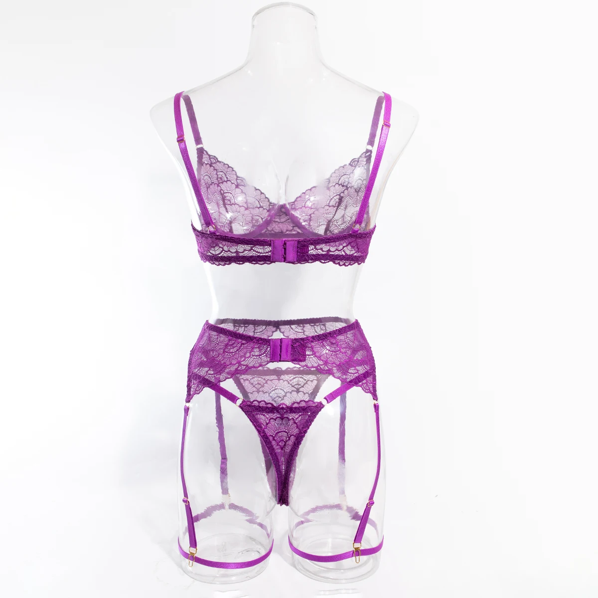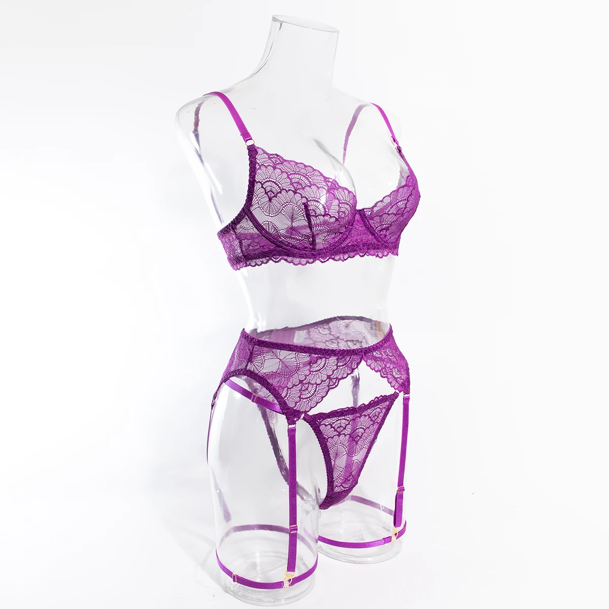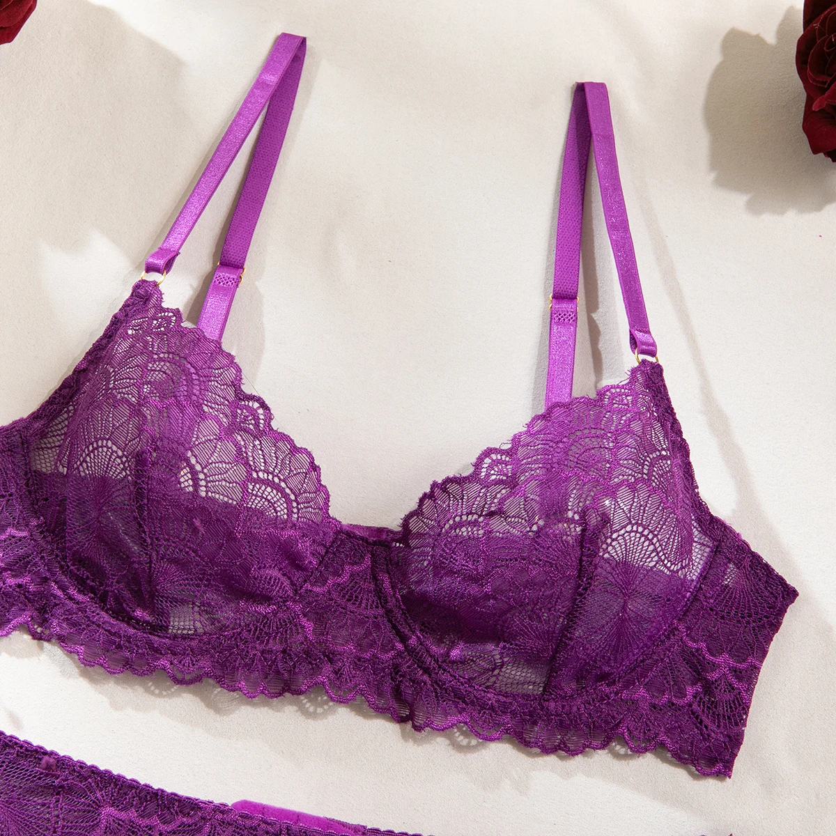 Ensemble de 4 pièces de Lingerie Sexy ajourée en dentelle noire, soutien-gorge et tongs transparents à volants