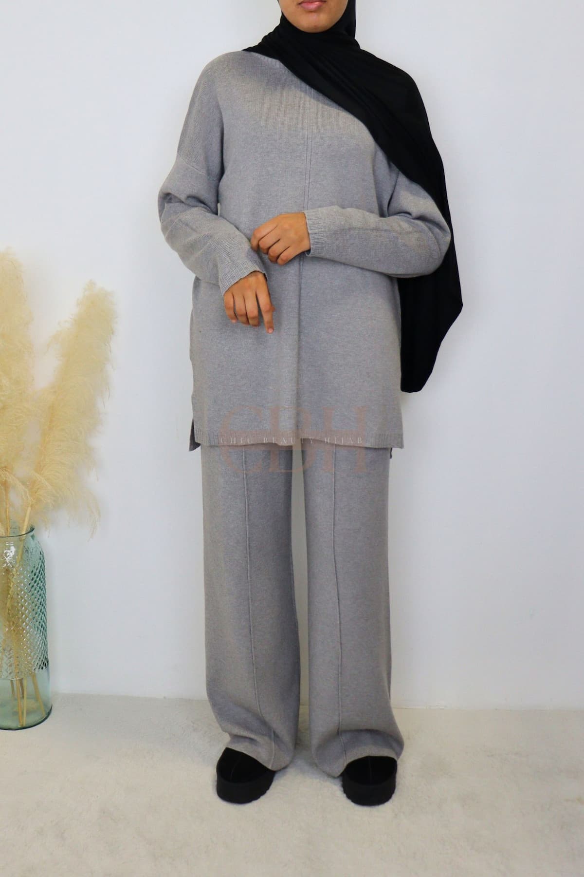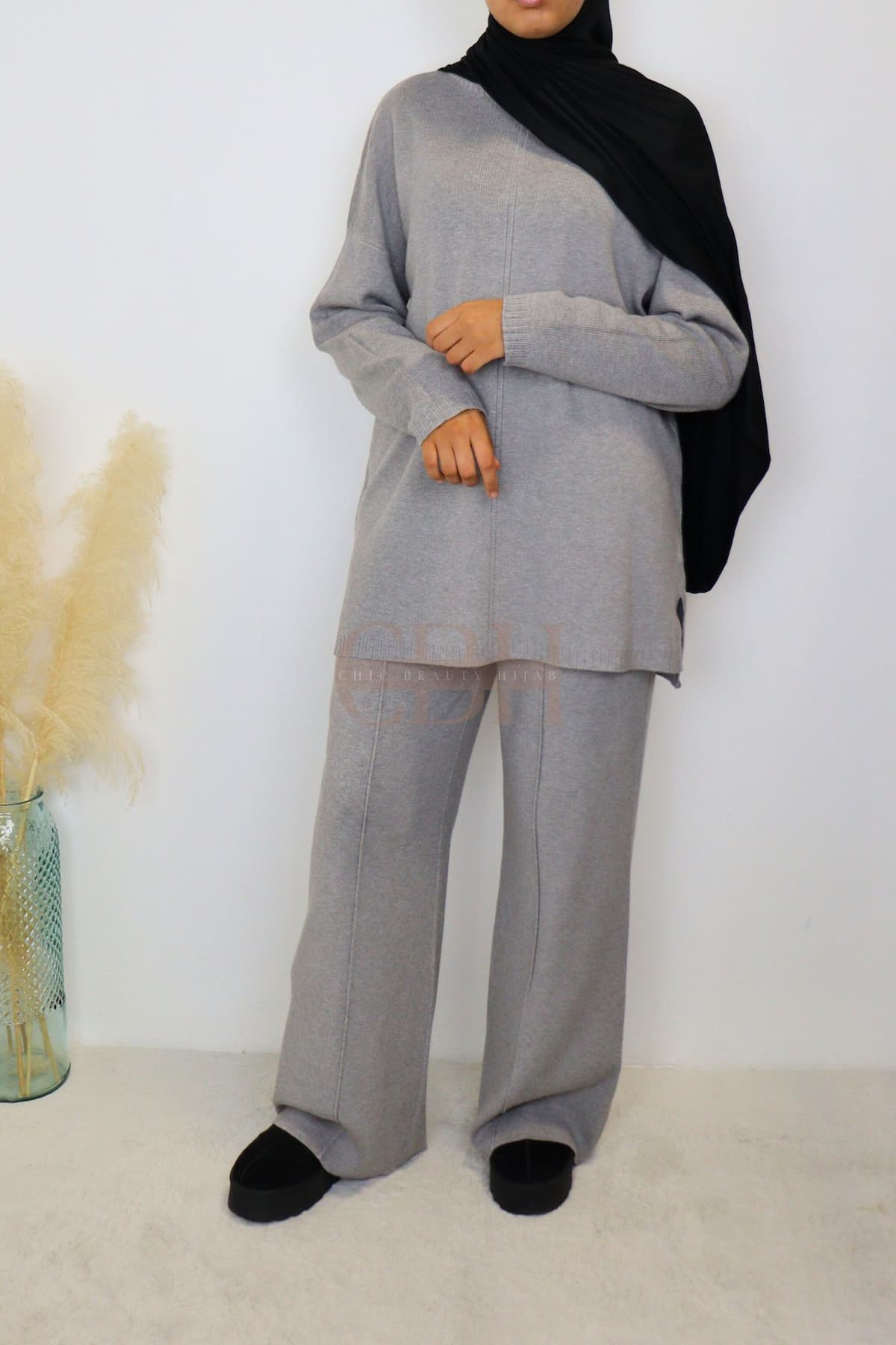 Ensemble femme en maille gris, doux et confortable. Coupe moderne et élégante, idéal pour l’automne-hiver. Parfait pour un look chic, cosy et facile à porter au quotidien.