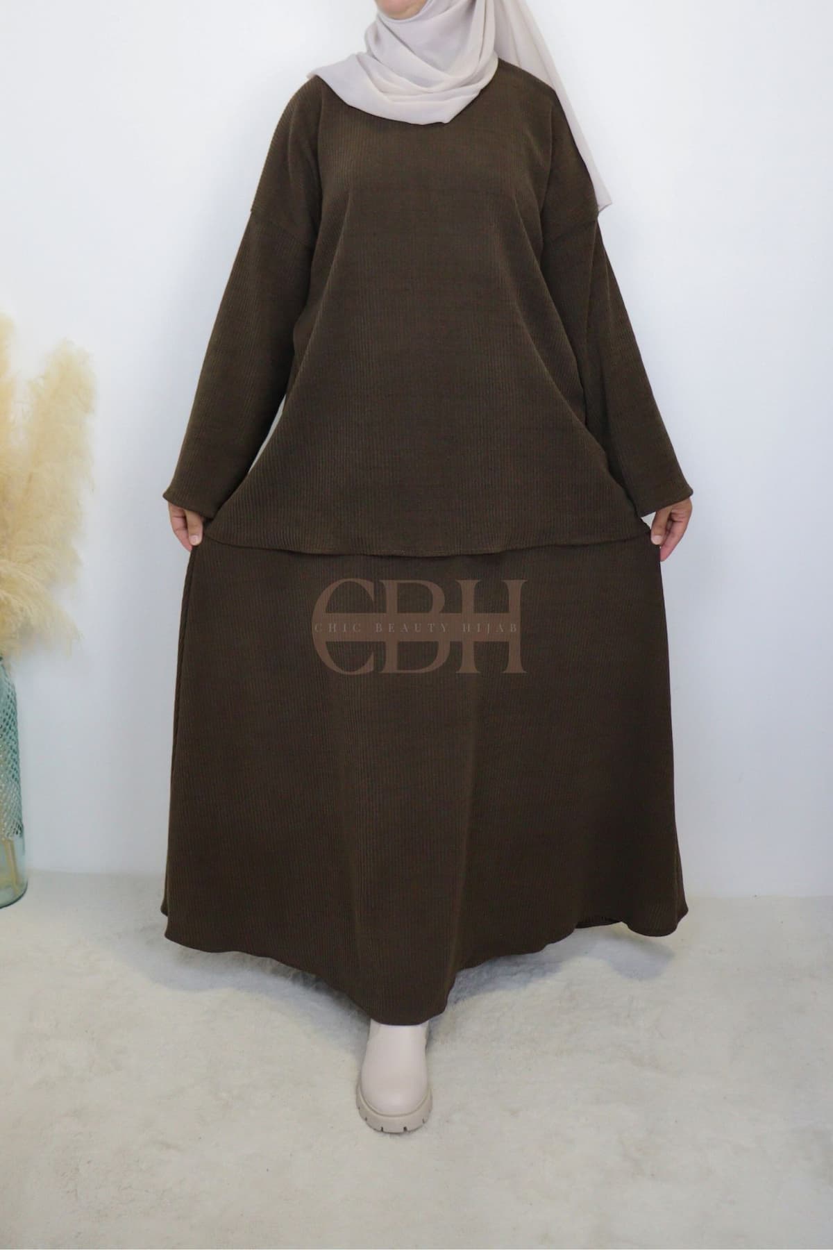 Cet ensemble jupe en velours côtelé marron allie confort et élégance grâce à sa matière douce et sa coupe fluide. Idéal pour la mode modeste, il offre une tenue chic et chaleureuse, parfaite pour la saison automne-hiver.