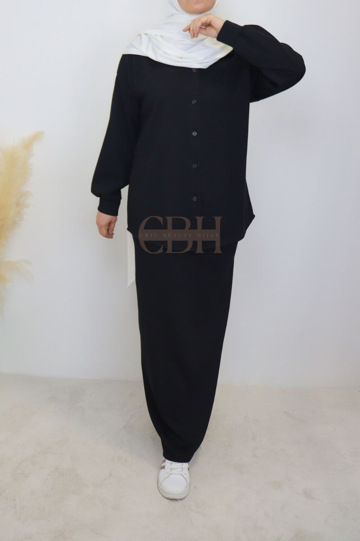 Cet ensemble jupe velours noir est idéal pour celles qui recherchent une tenue modeste, tendance et confortable.