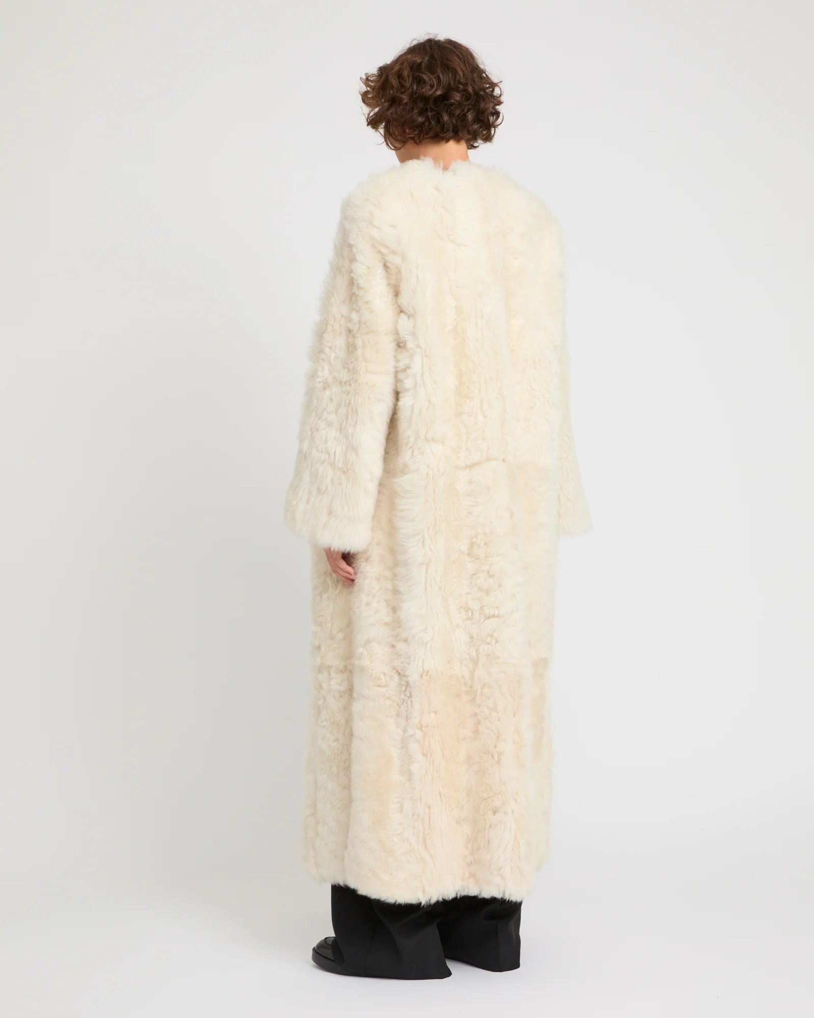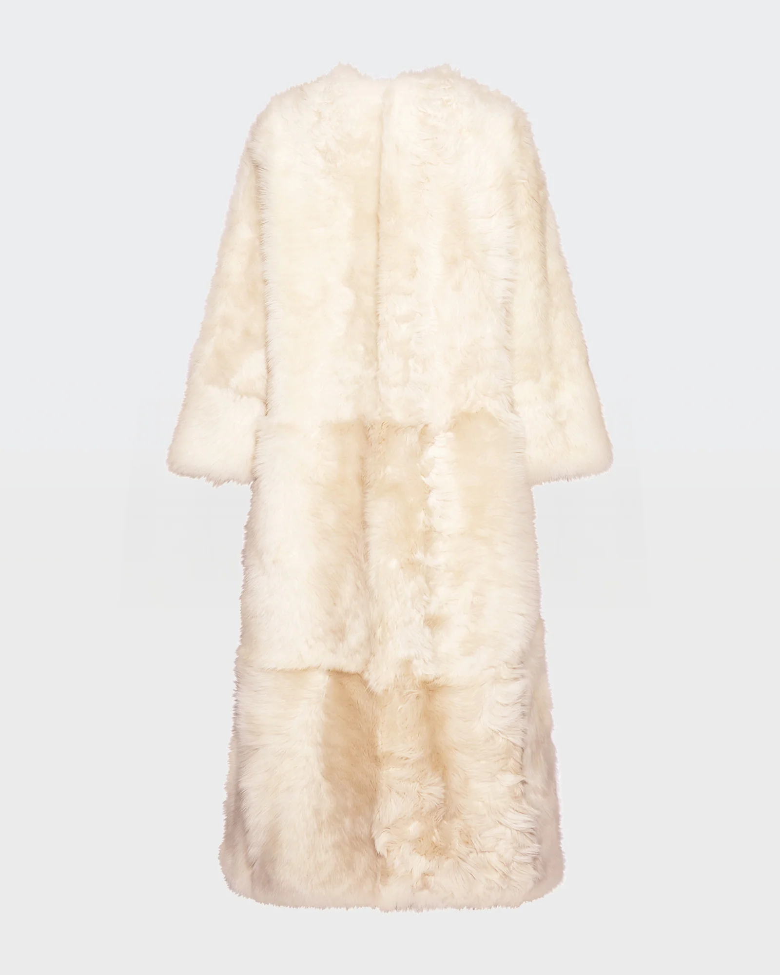 The generous texture of Toscana lambskin is showcased on this long coat, which can also be worn cinched with a leather belt.