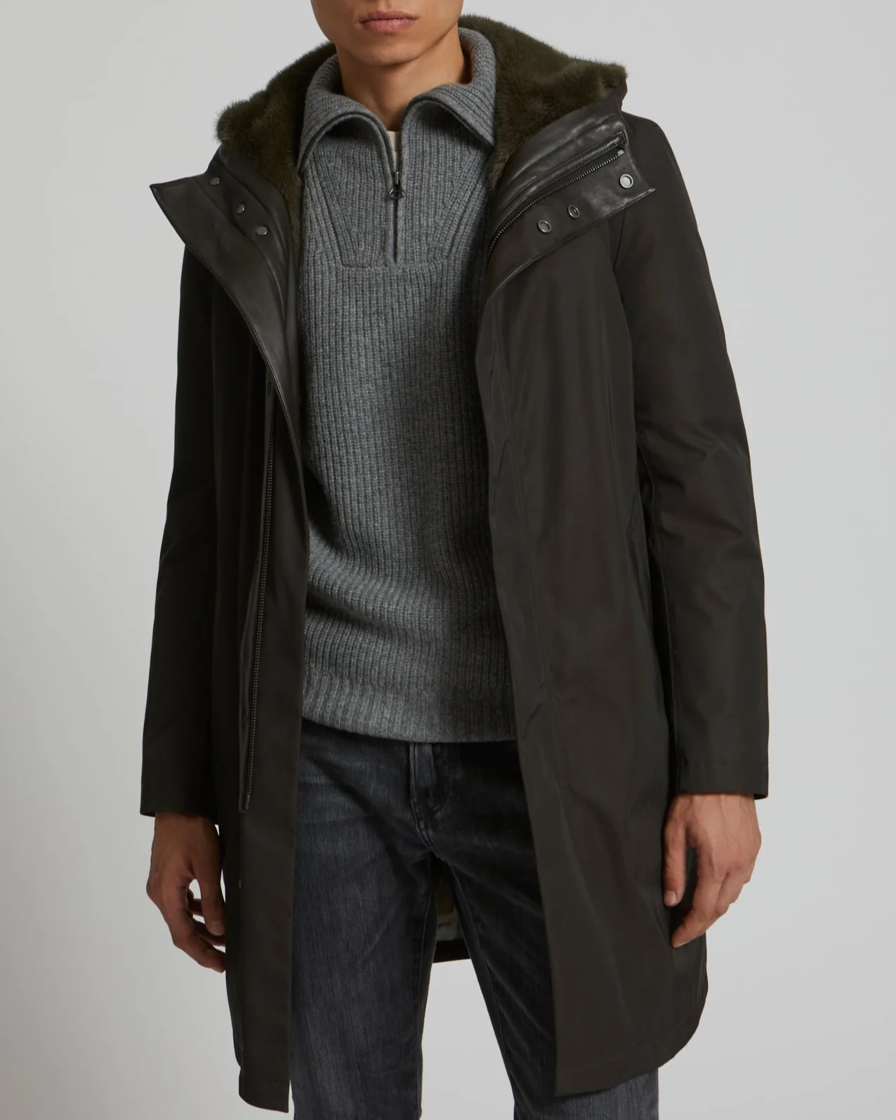 The luxurious elegance of a gabardine-style technical fabric hooded coat with a removable lining in long fur mink. Clean silhouette, lightweight fabric, very resistant, soft mink combine in a model suitable for all occasions as well as the cold of winter.