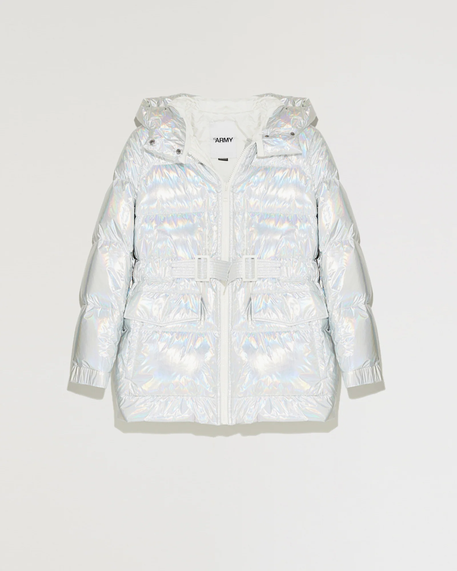 Hooded down jacket in technical fabric – Down jacket in technical fabric filled with high-quality feathers and down– Length 76 cm– Front zip fastening– Model with zipped side slits– Press-stud flap pockets – Slit pockets– Buckled tightening belt at the waist– Invisible technical ribbing at the bottom of the sleeves
