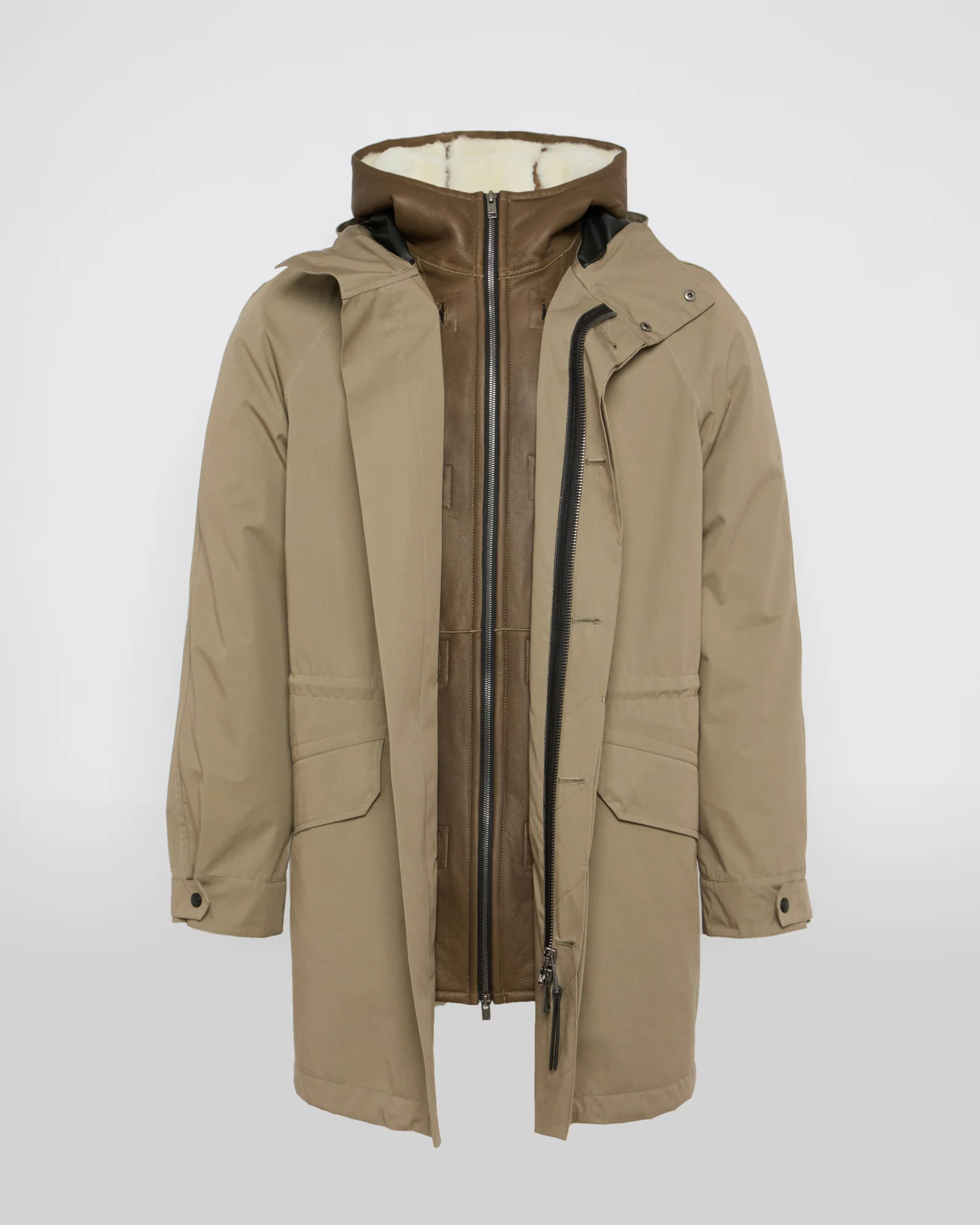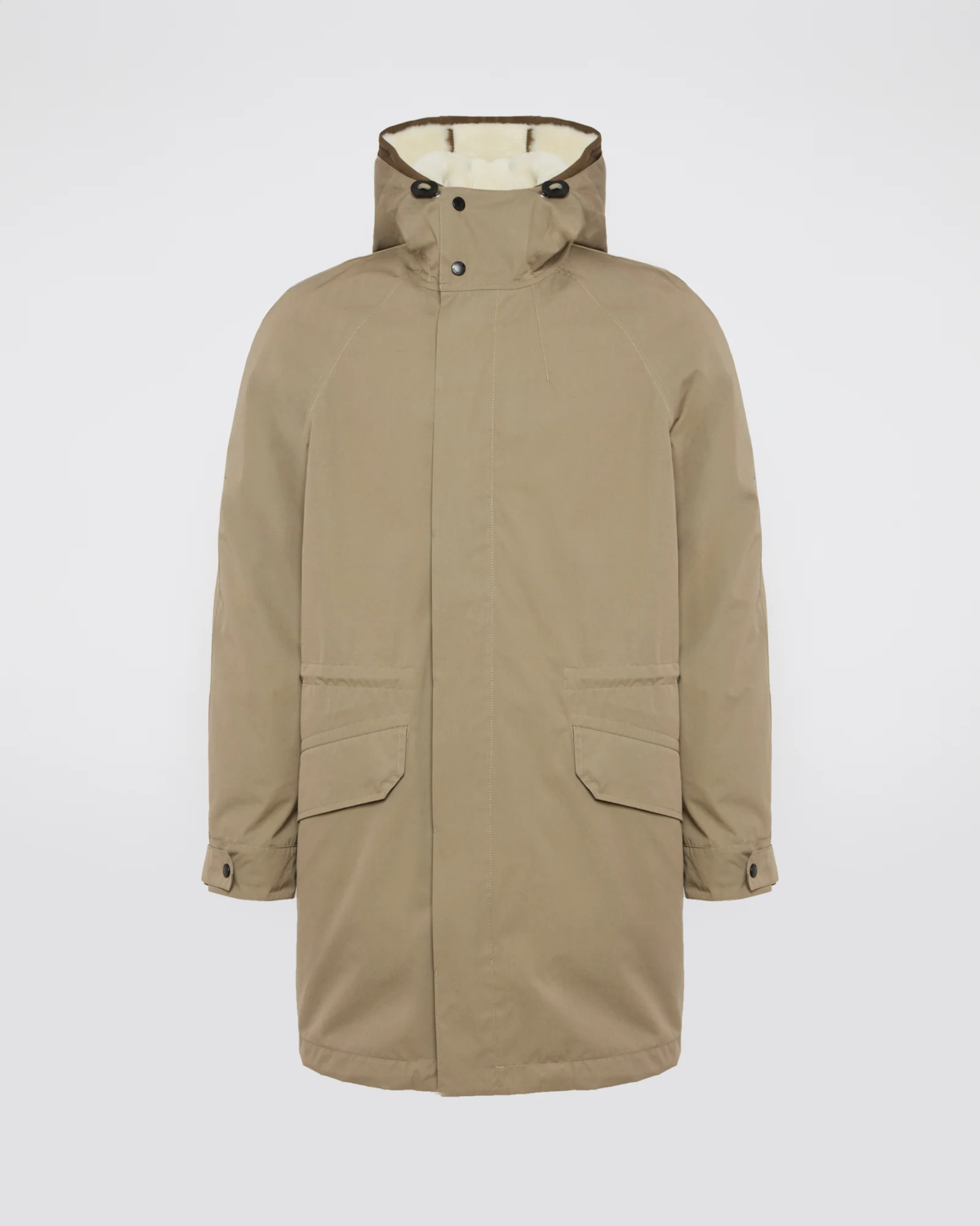 – Removable lining with integrated hood bib in merino shearling