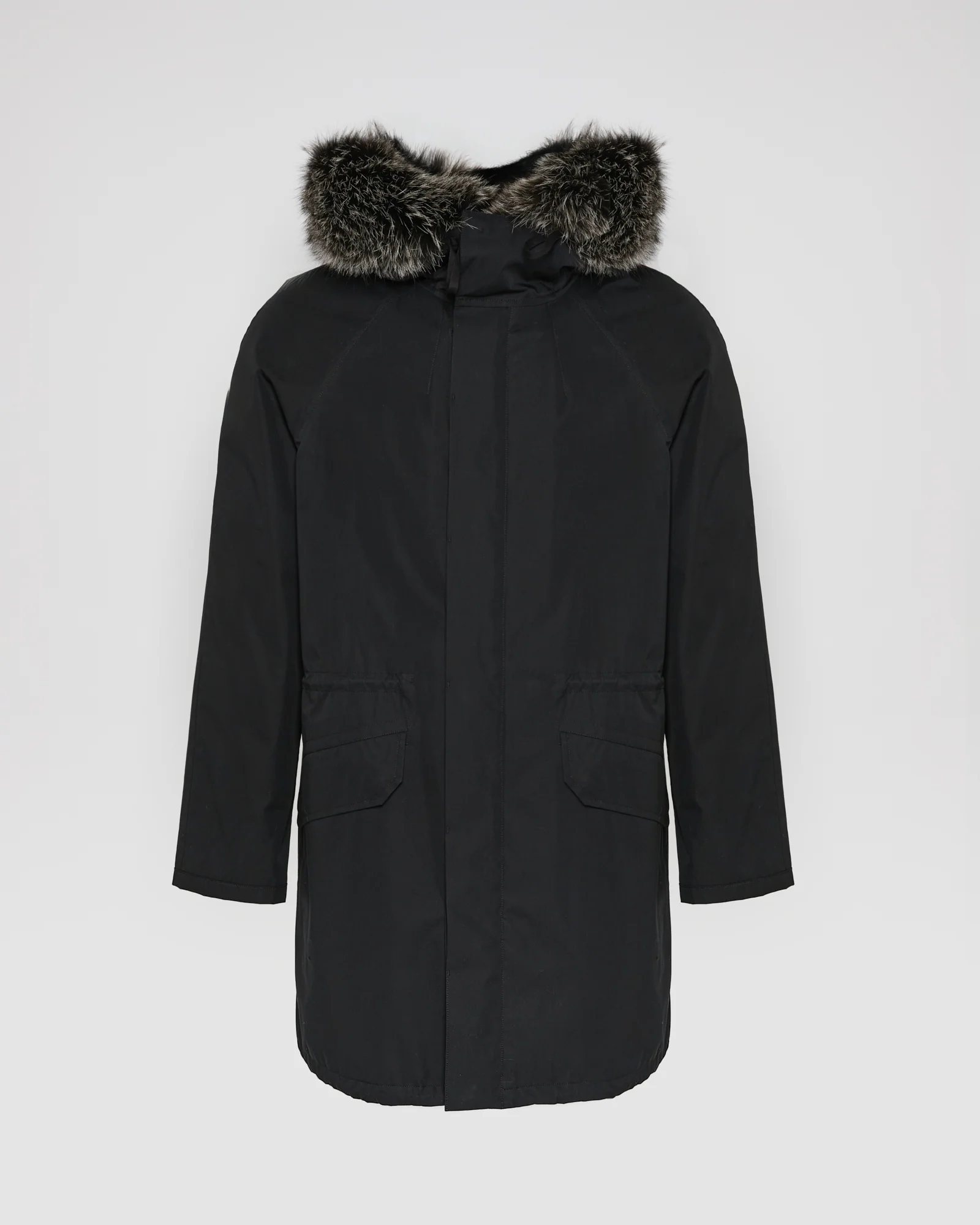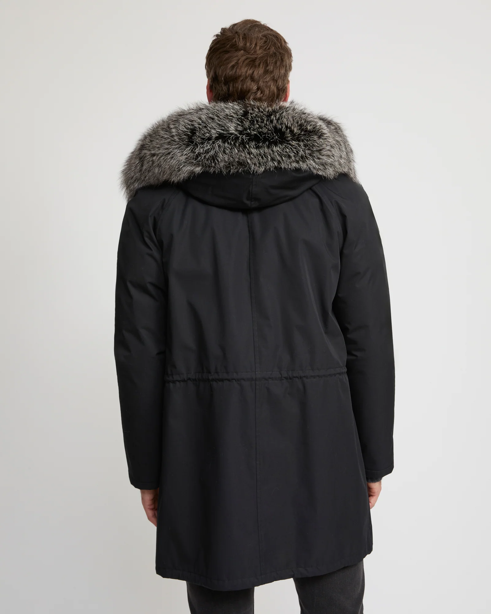 Winter’s perfect parka. Its weatherproof technical fabric hides a removable rabbit-fur lining, while the fox trim of the hood is also detachable. A drawstring at the waist allows the fit to be adjusted according to requirements, and a zip plus button fastening provides double protection against cold air.