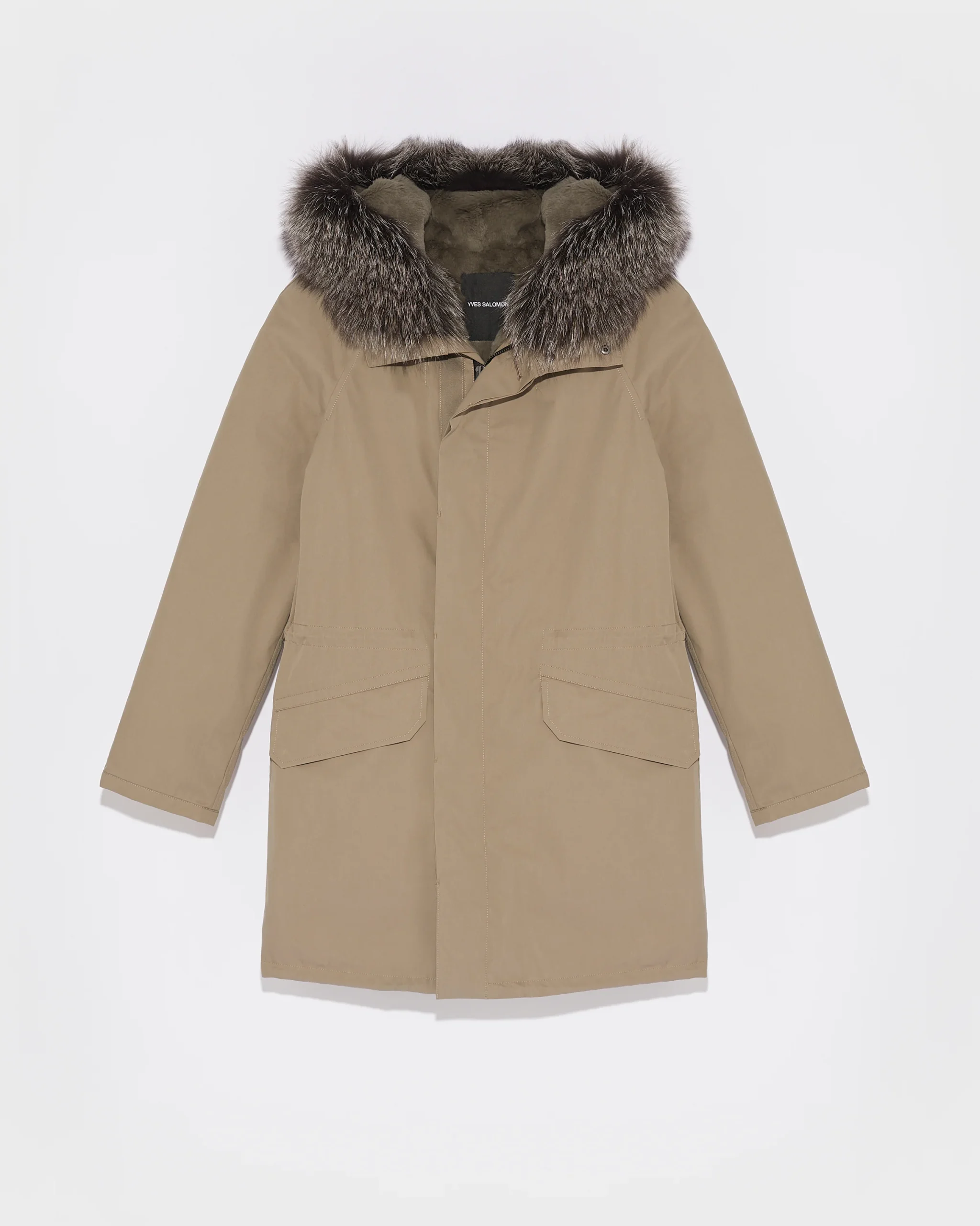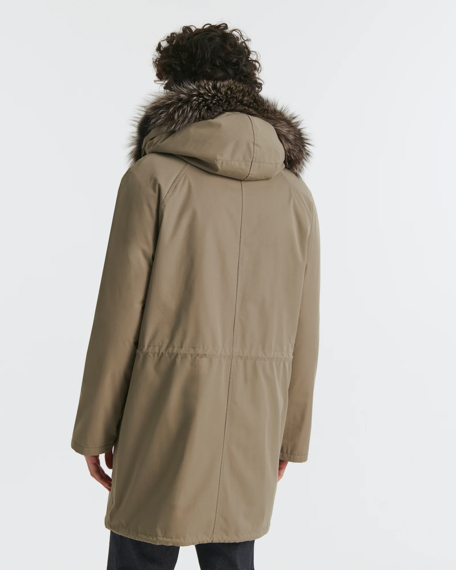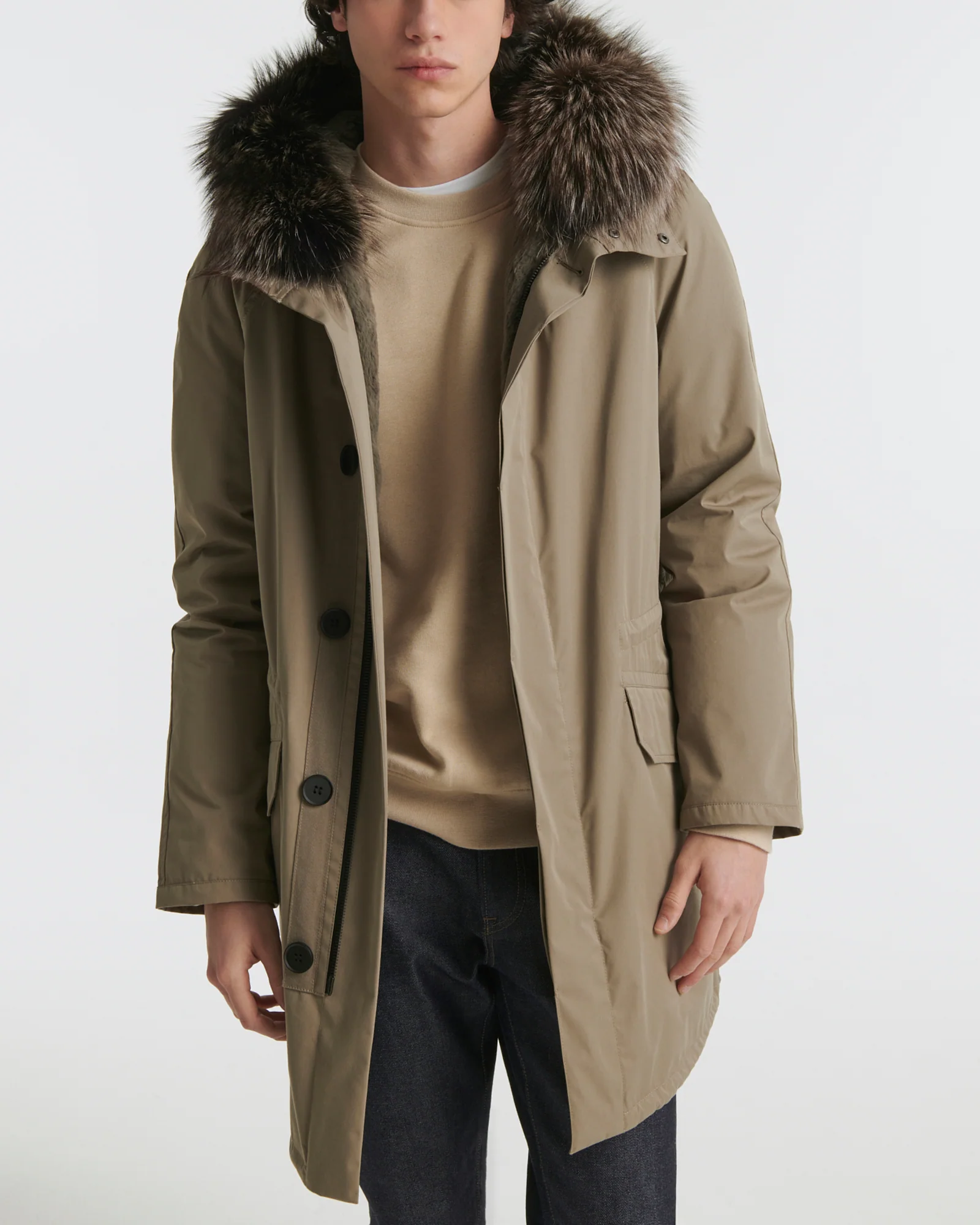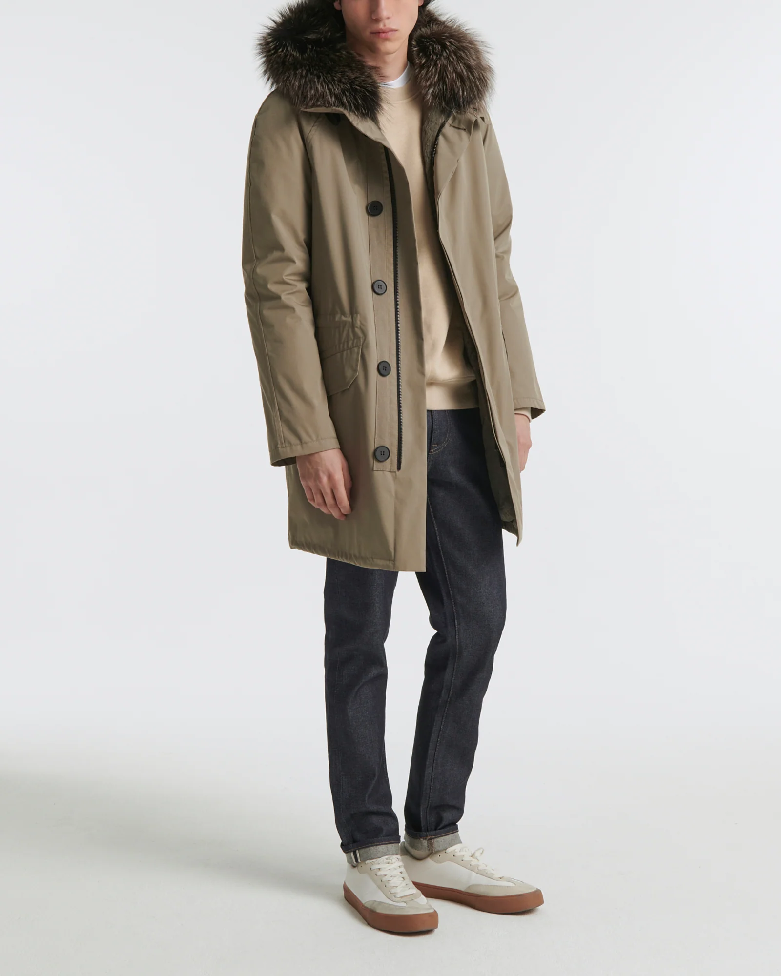 Winter’s perfect parka. Its weatherproof technical fabric hides a removable rabbit-fur lining, while the fox trim of the hood is also detachable. A drawstring at the waist allows the fit to be adjusted according to requirements, and a zip plus button fastening provides double protection against cold air.