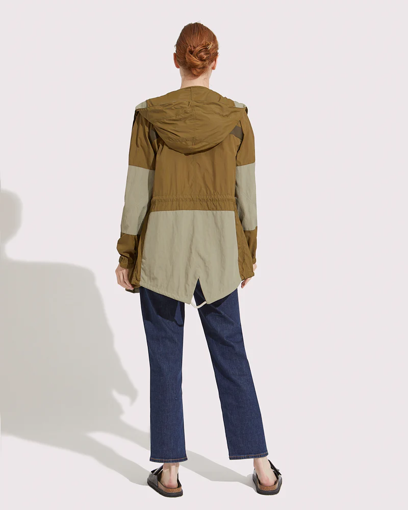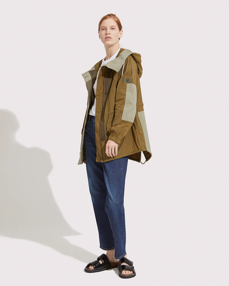 Iconic short parka revisited in a waterproof version – Waterproof polyamide fabric, nylon, slightly crinkled appearance – Embroidery detail – Chest pocket – Sleeves in technical polyamide fabric – Special dyeing for a vintage effect – Elbow patch – Clean finishing – Hood and button placket – Back application – Adjustable cotton drawcords inside the […]