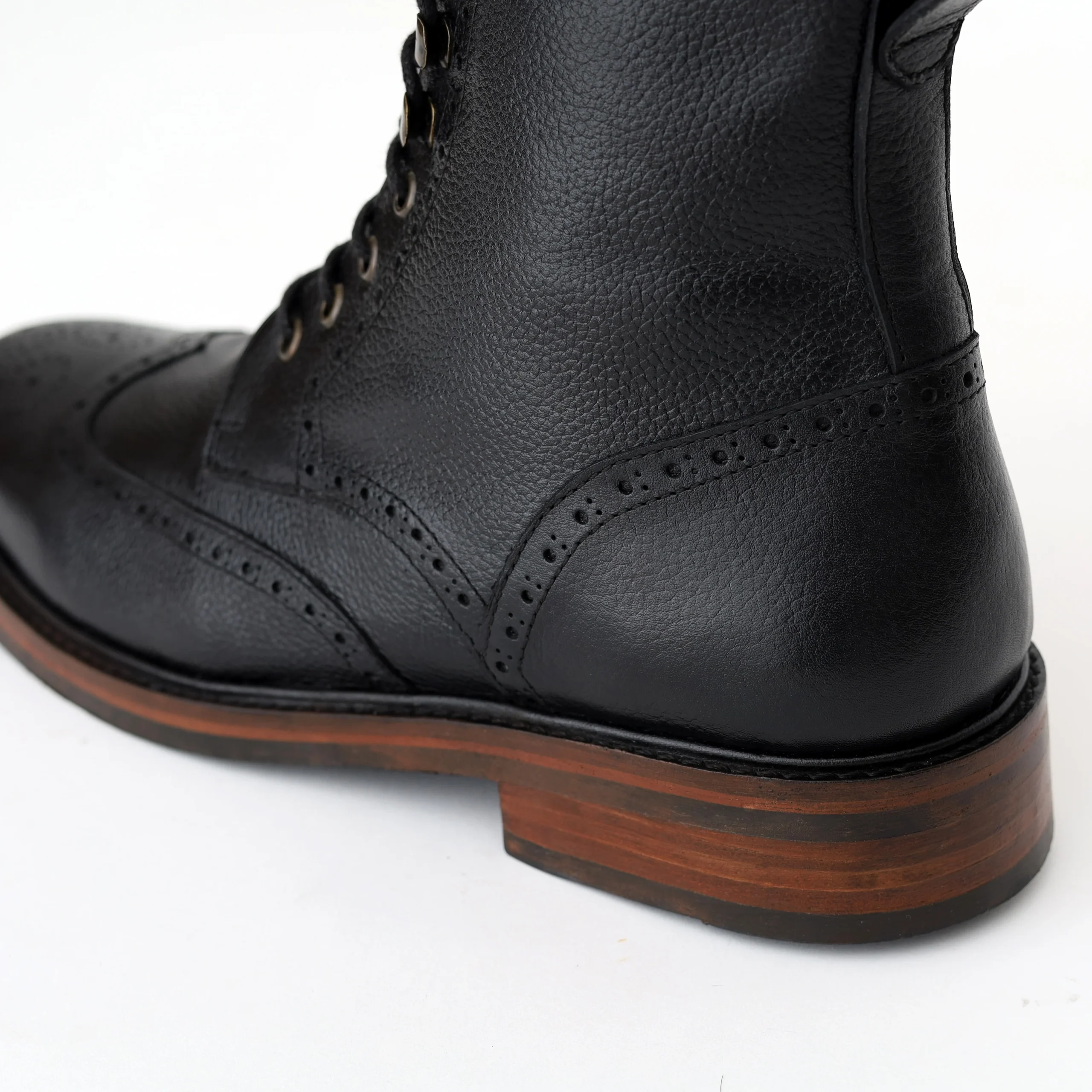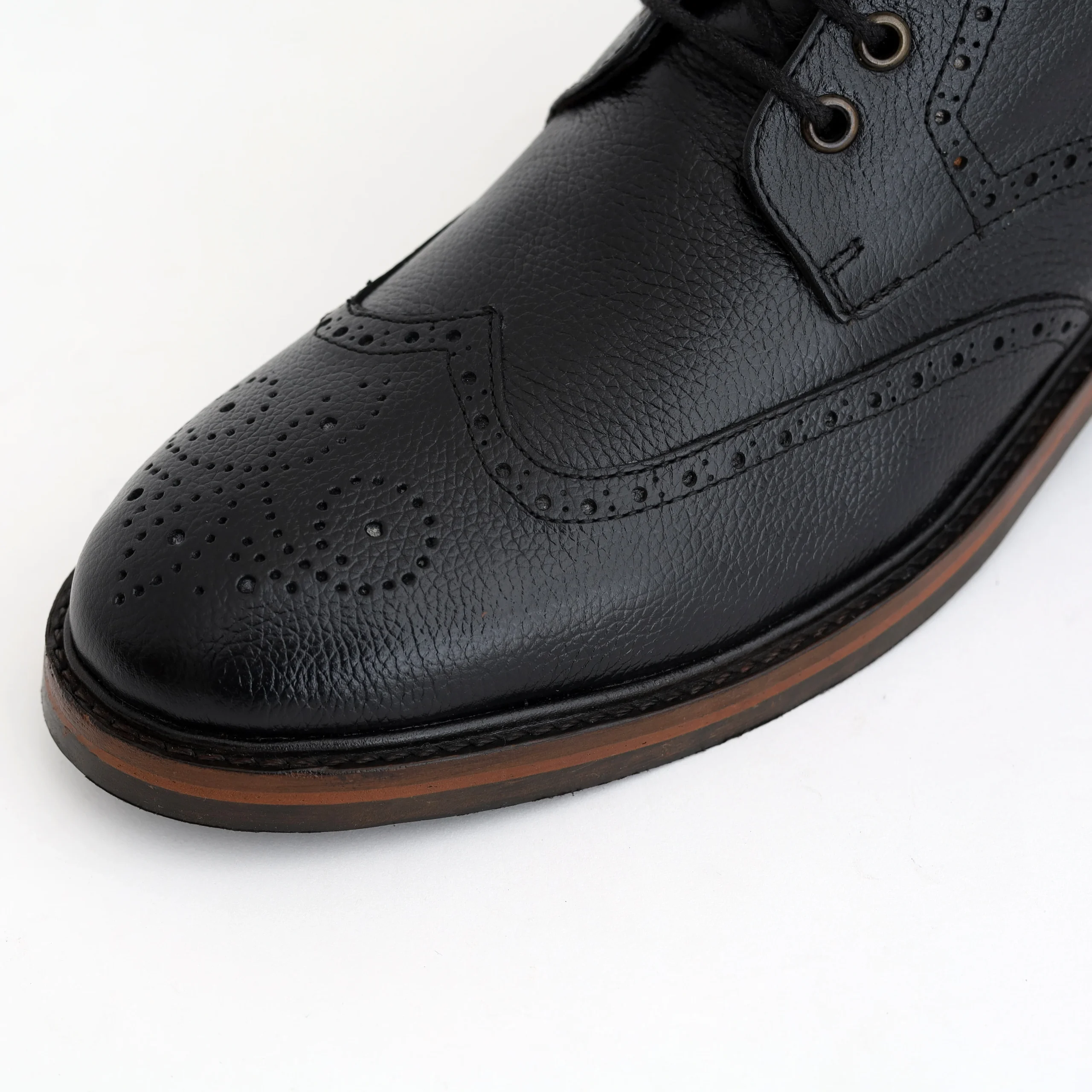 Cette bottine revisite le classique full brogue avec un cuir grainé de caractère, offrant une élégance intemporelle capable d’affronter le quotidien avec distinction.