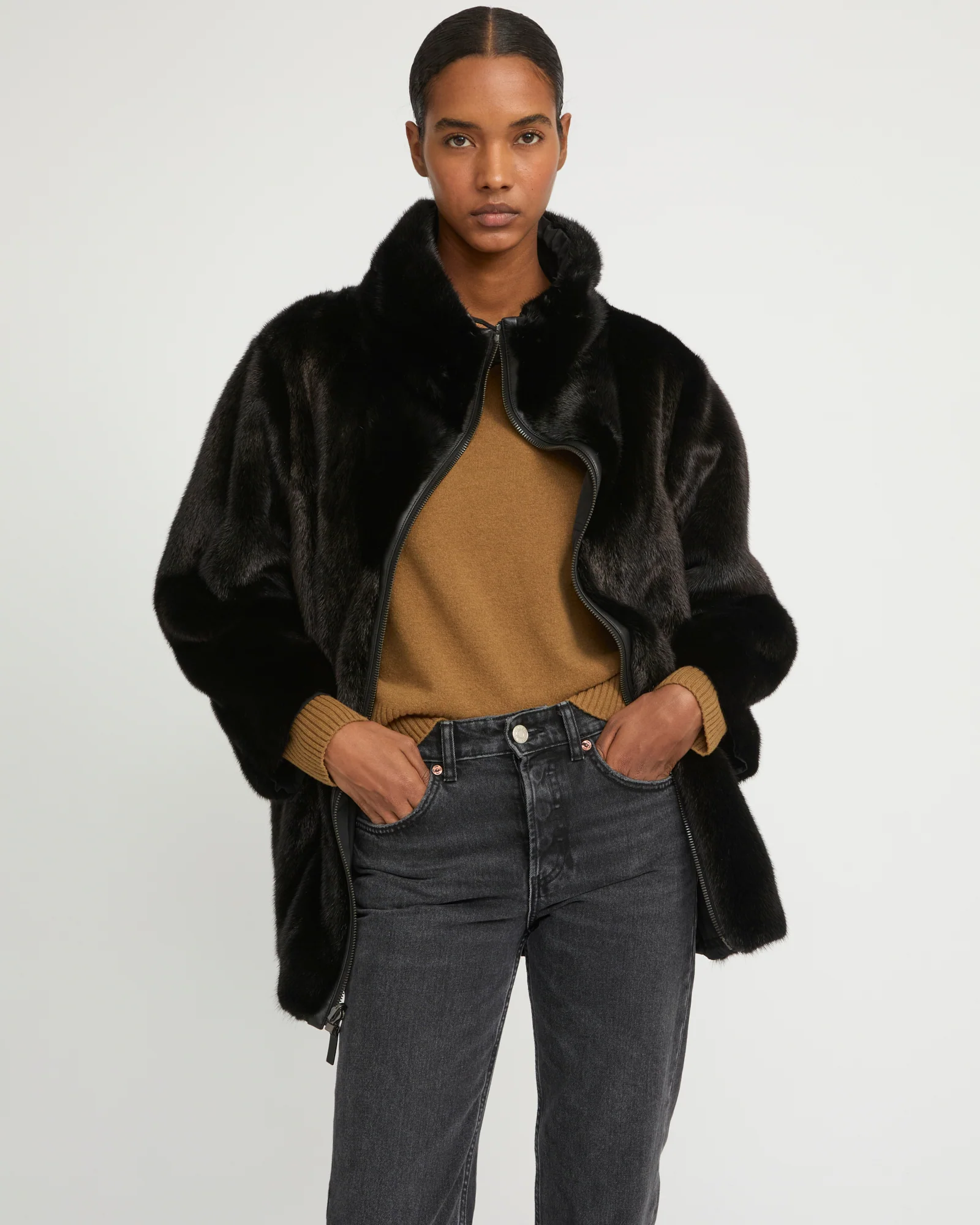 – Other side in long-haired mink fur with slit pockets